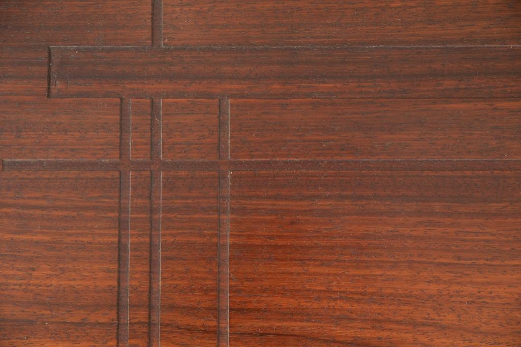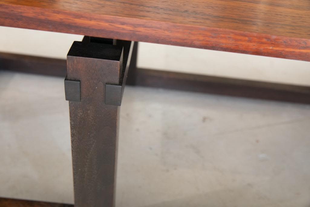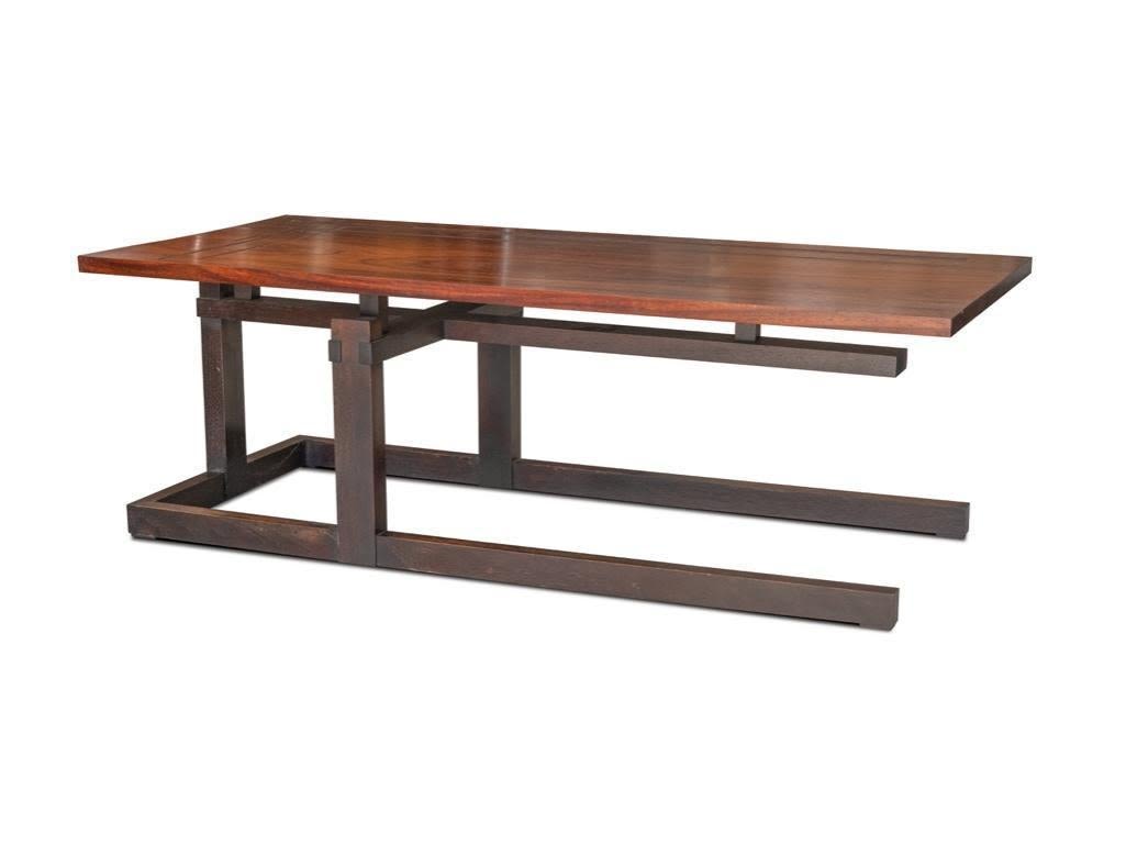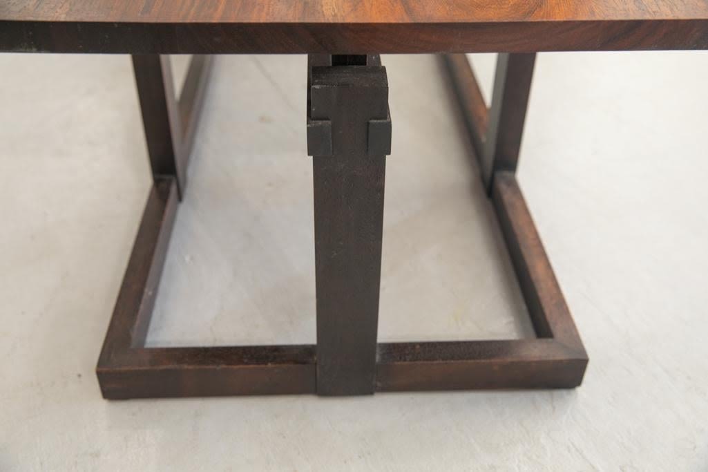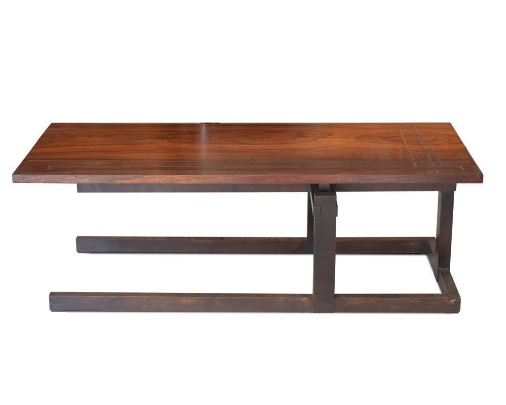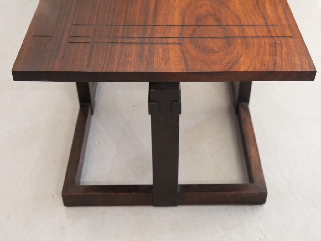 Thomas Swift Studio Cantilever Architectural Designed and Incised Decorated Teak Low Table Circa 1980. This table is take on the Frank Loyd Wright visual aesthetic. It has teak cantilevered top cleverly constructed for structural integrity with a geometric design over a wood base using multiple connections to create the illusion of a floating top. Thomas Swift Studio is a design and build company specializing in architectural interiors, industrial design and furniture for residential and commercial spaces. Their work melds long standing traditions in furniture making with the theory and substance of modern design. Measures Approx 14"H x 19"W x 42"L