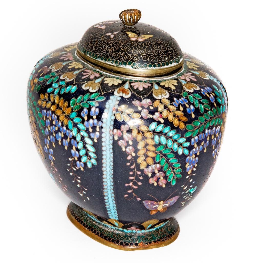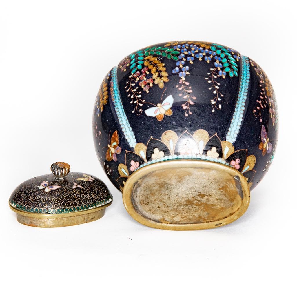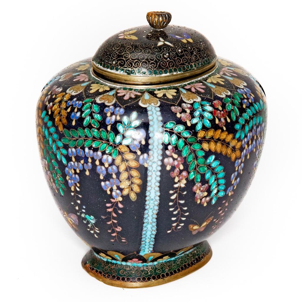 Cloisonne antique Asian small covered jar good condition and good form 5.75"H x 5"D approx