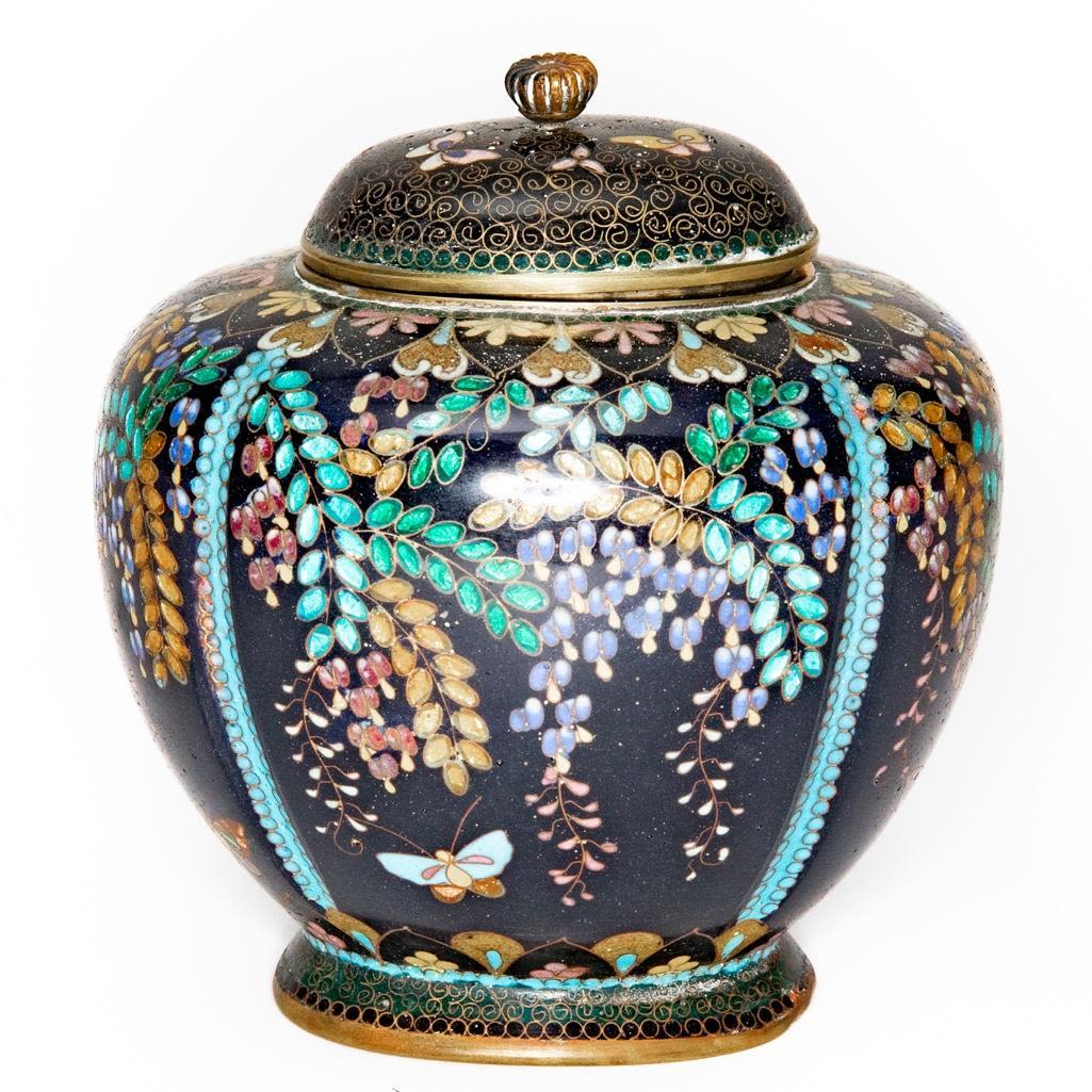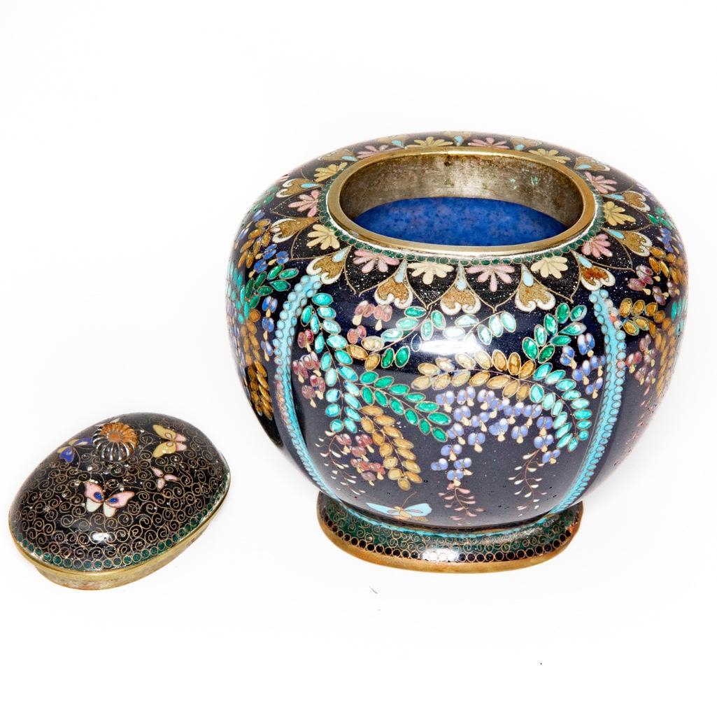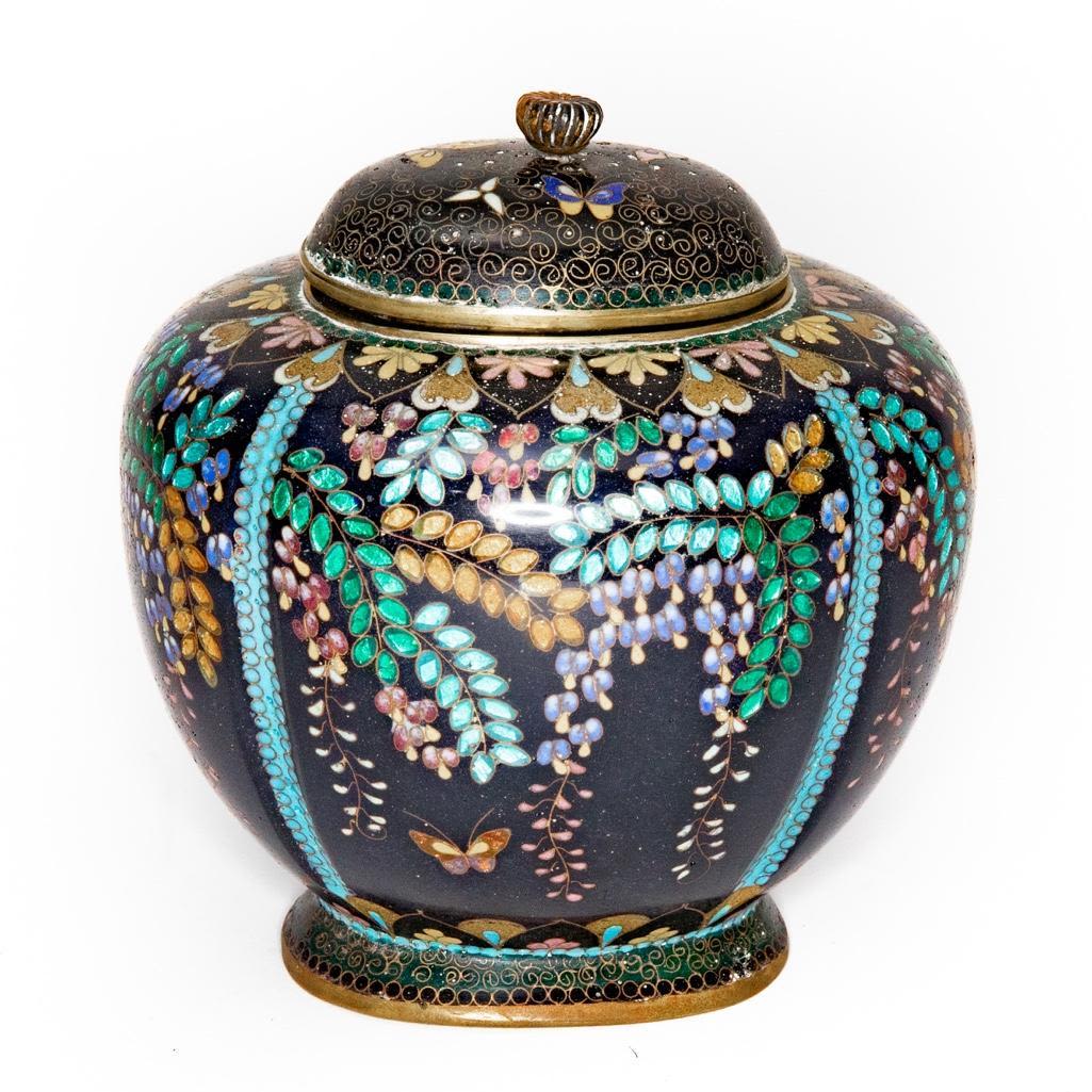 Cloisonne antique Asian small covered jar good condition and good form 5.75"H x 5"D approx