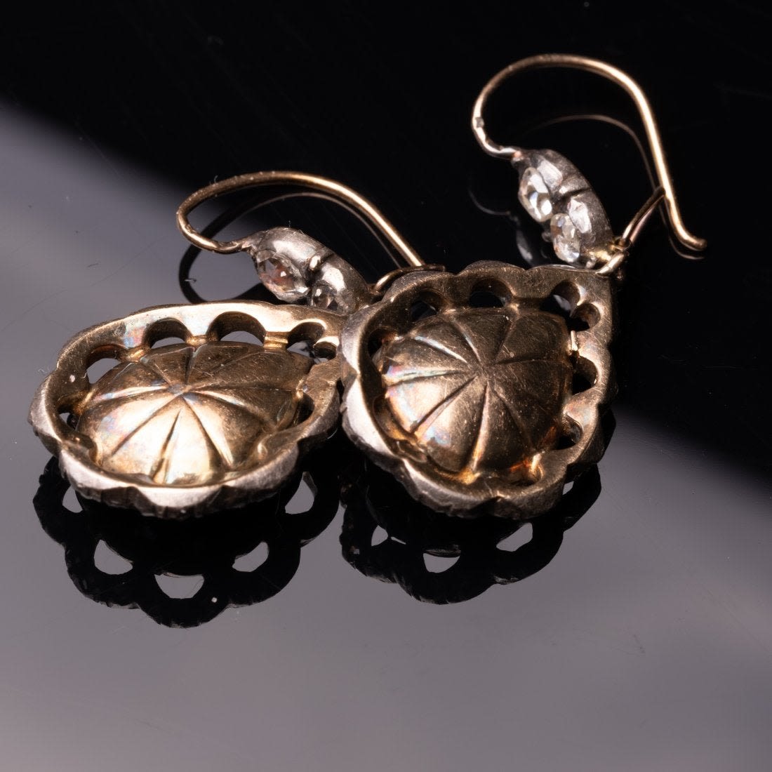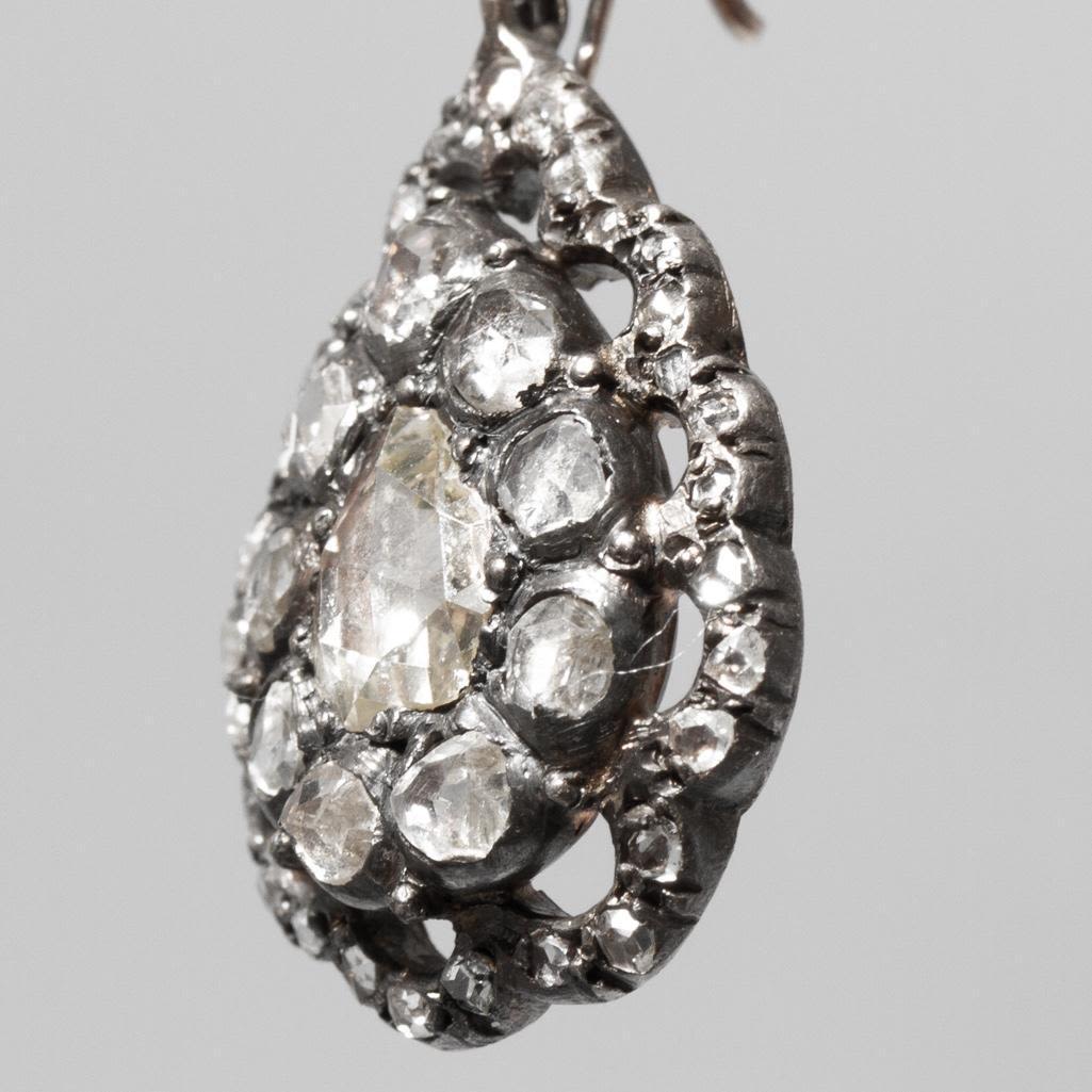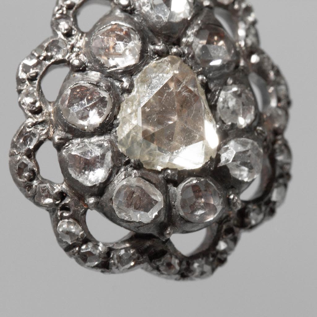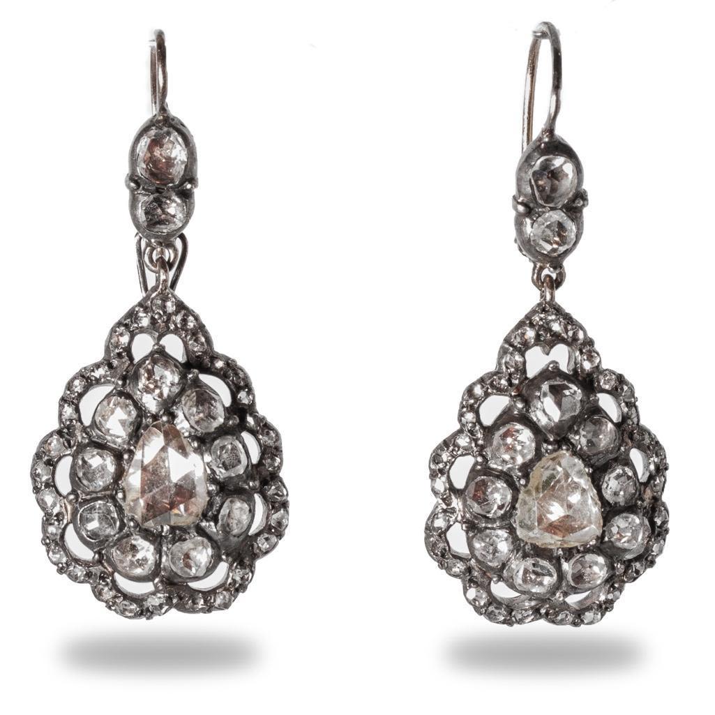 The earrings has approximately 80 rose cut diamonds combined with the largest measuring 6.87mm long