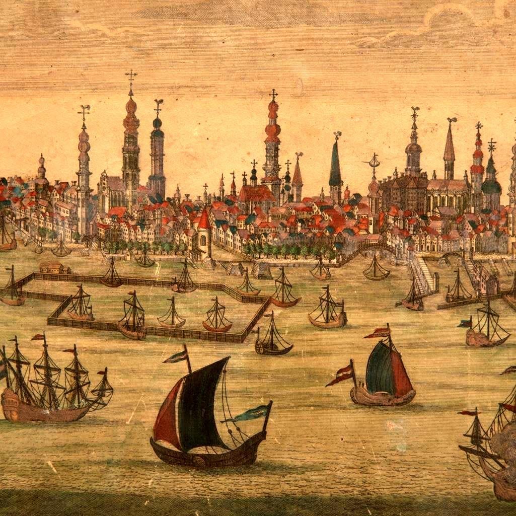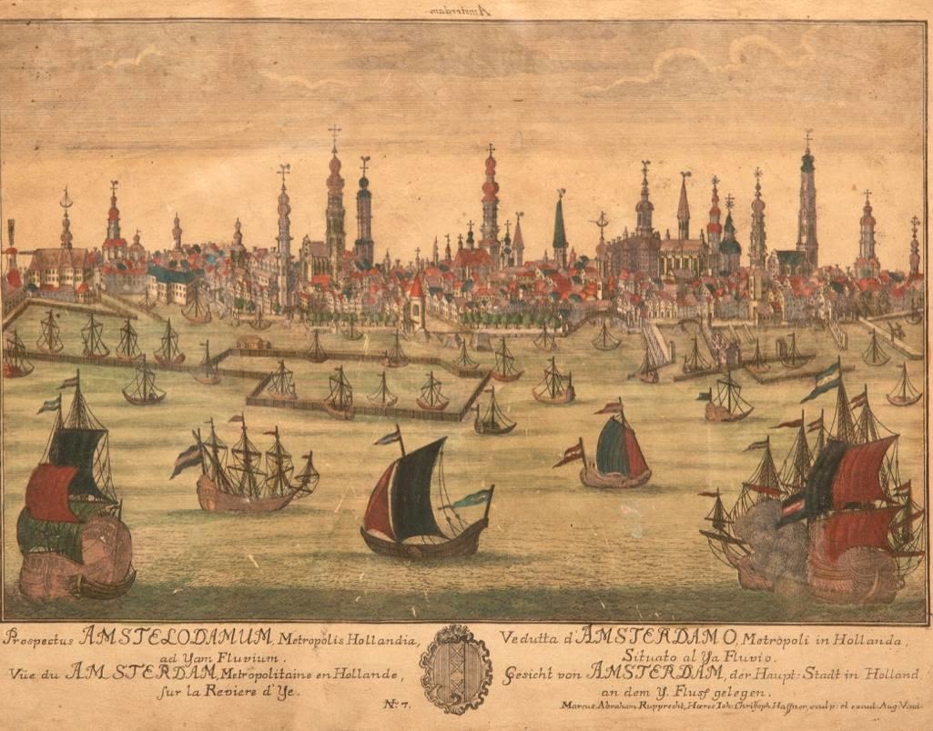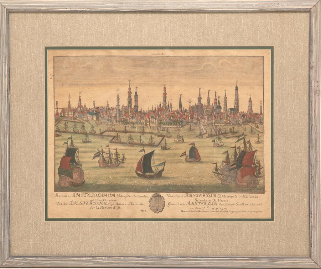 Dutch early 18th century view of Amsterdam from the harbor hand colored engraving by Balthasar Friedrich Leizelt 1700’s 23.5 x 20 Balthasar Friedrich Leizelt was a German artist and copperplate engraver working from Augsburg. Leizelt produced a series of European and American scenic views at a time when pictures of foreign countries and people were popular and designed for use in optical viewers.