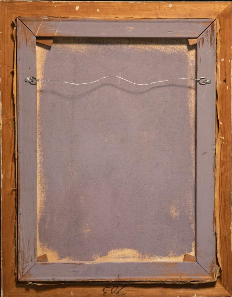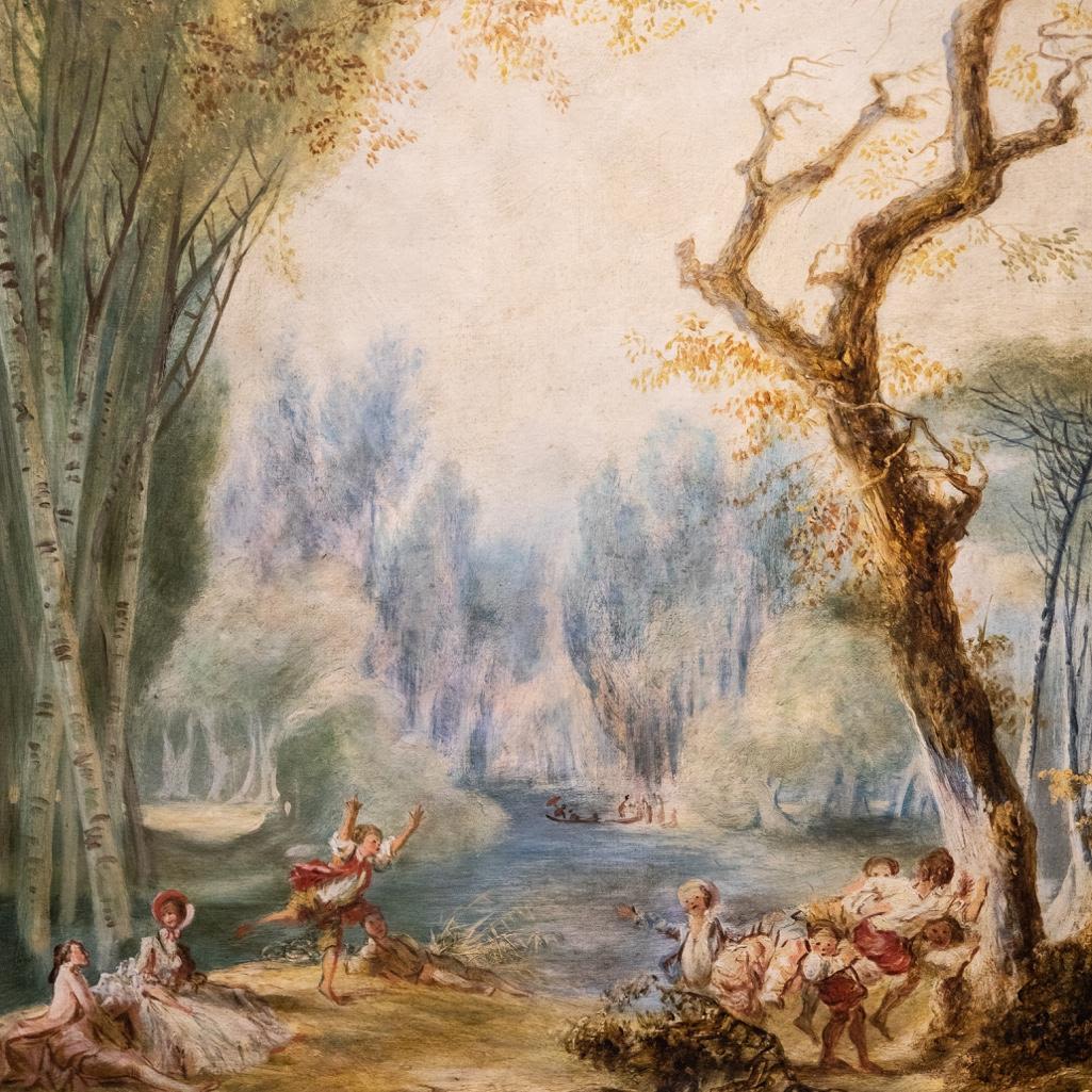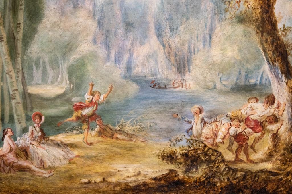 Rococo style oil on canvas, depicting figures frolicking outdoors near pond. Image: 23.5" H x 17.5" W; frame: 27.5" H x 21.25" W x 1.375" D.
