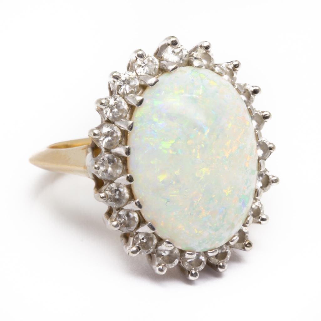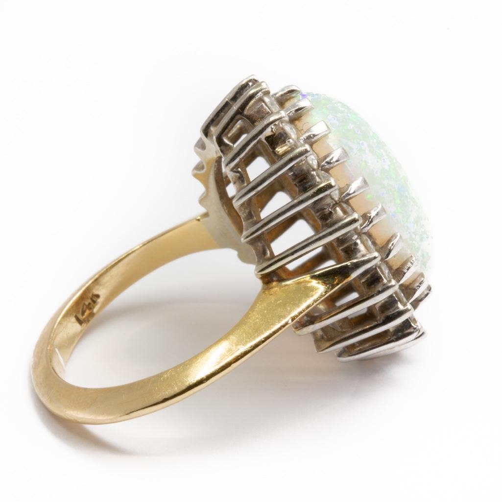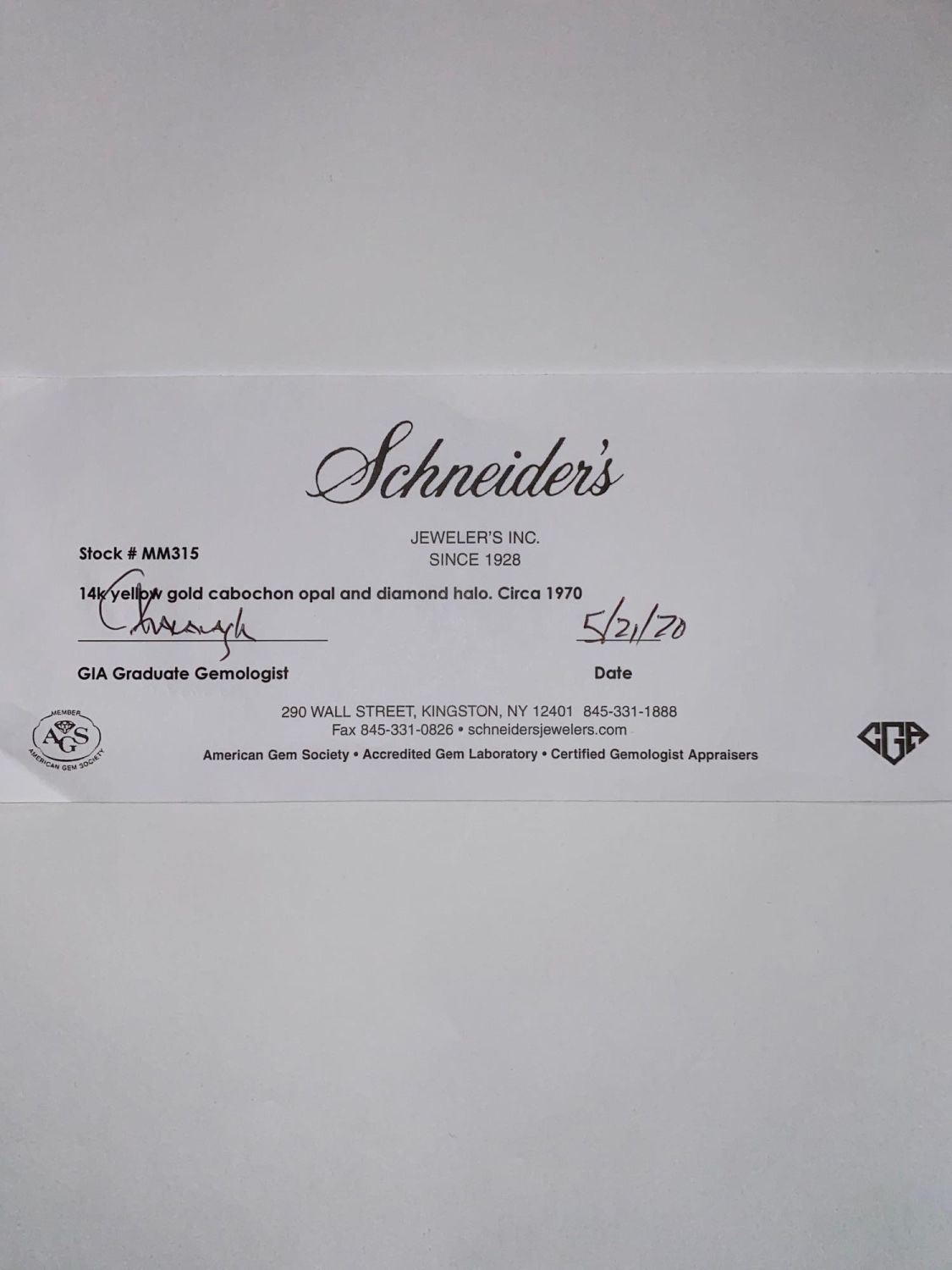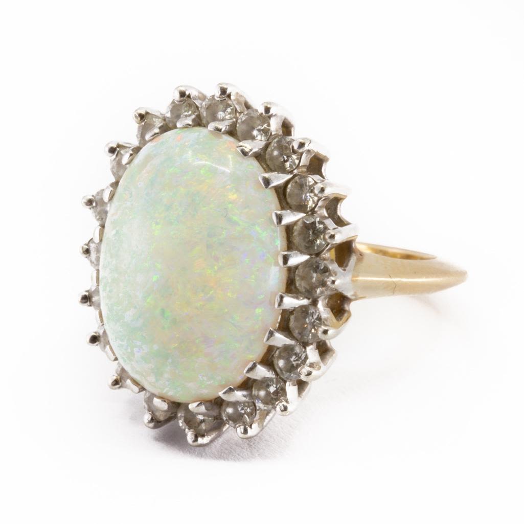 14k Gold Ring w large cabochon opal surrounded by diamonds setting s6.25 4.50dwt. This lot is accompanied by a GIA appraiser letter from an independent and well respected firm established over 75 years ago.