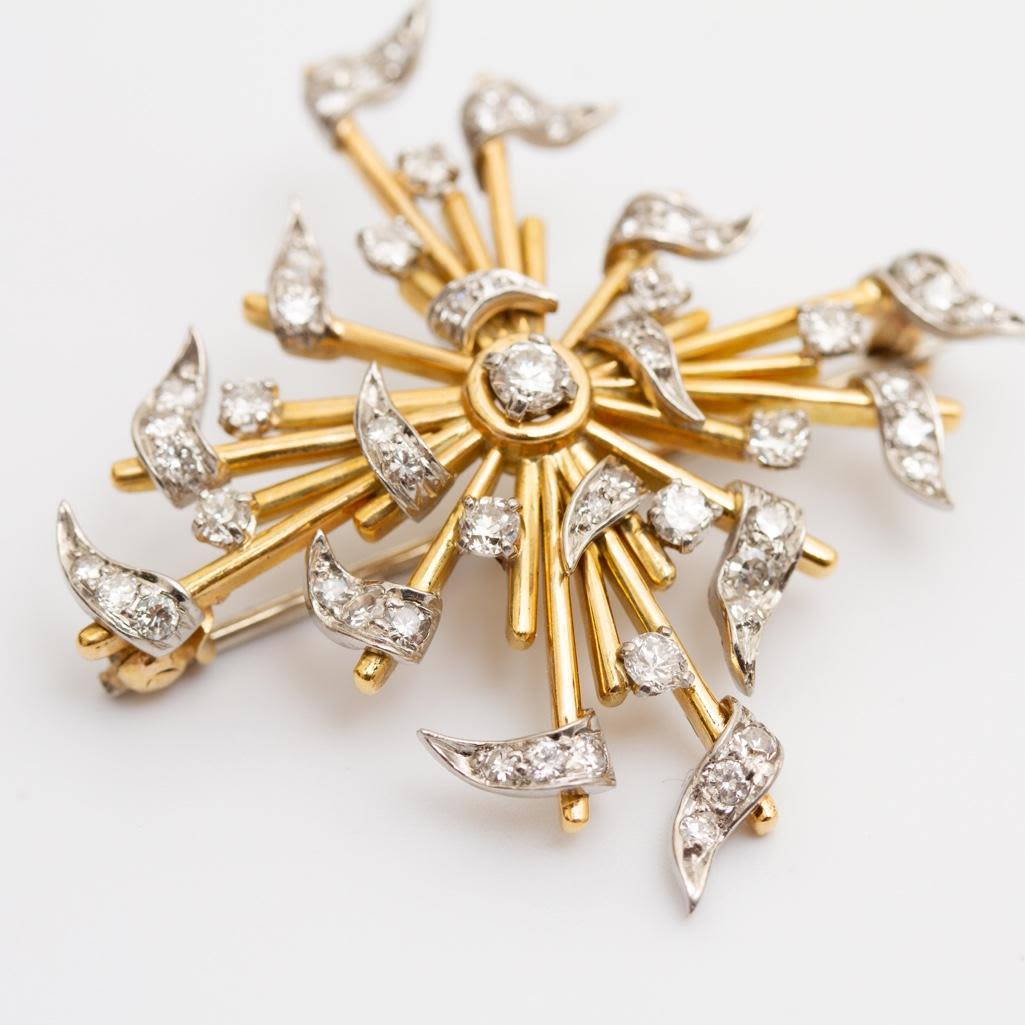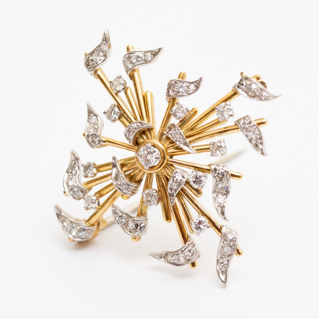 14k gold and diamond starburst brooch circa 1950. Weighs 7.2dwt. This item is accompanied by a GIA appraisers letter from a well respected independent firm that has been in business for over 75 years. Measures 1.5"W