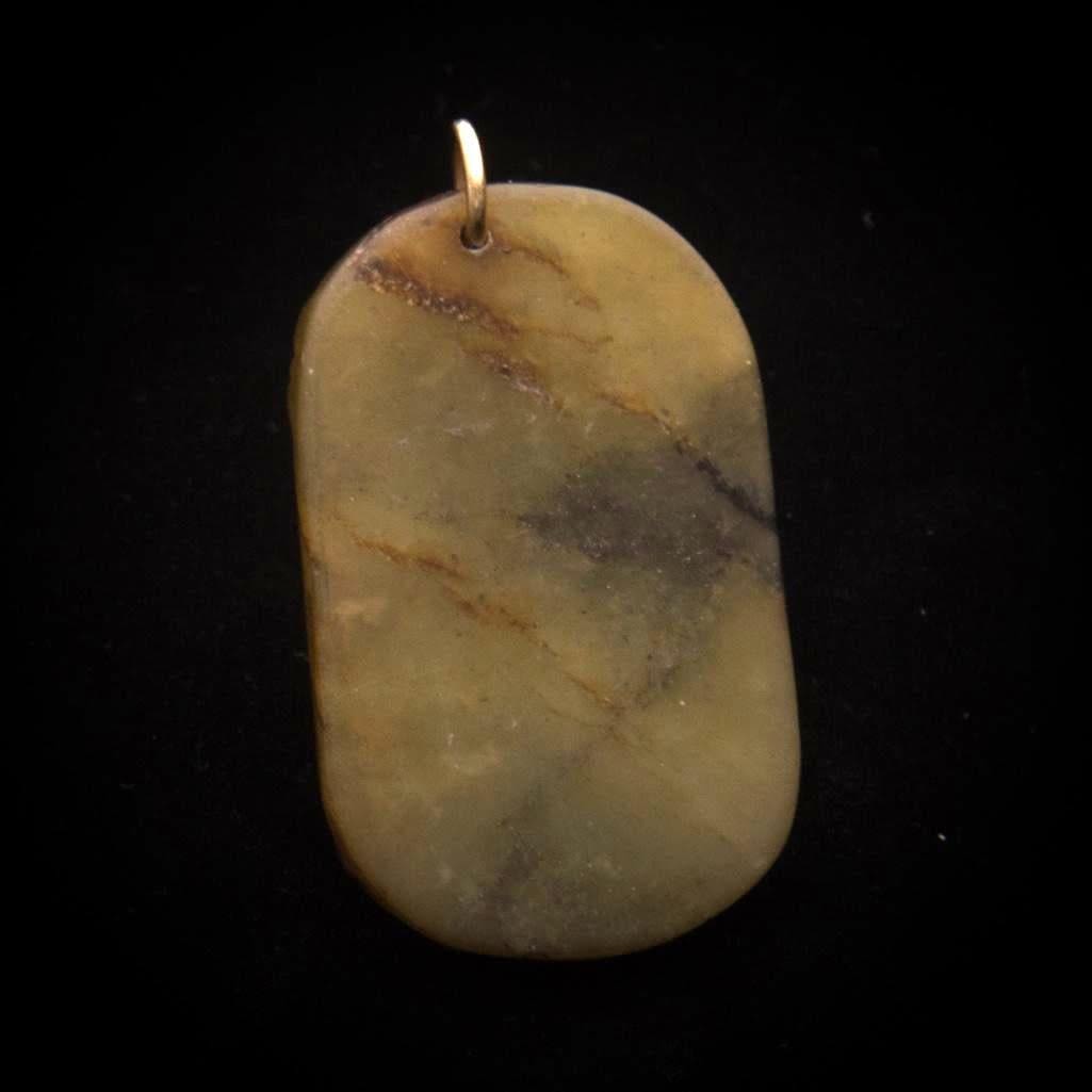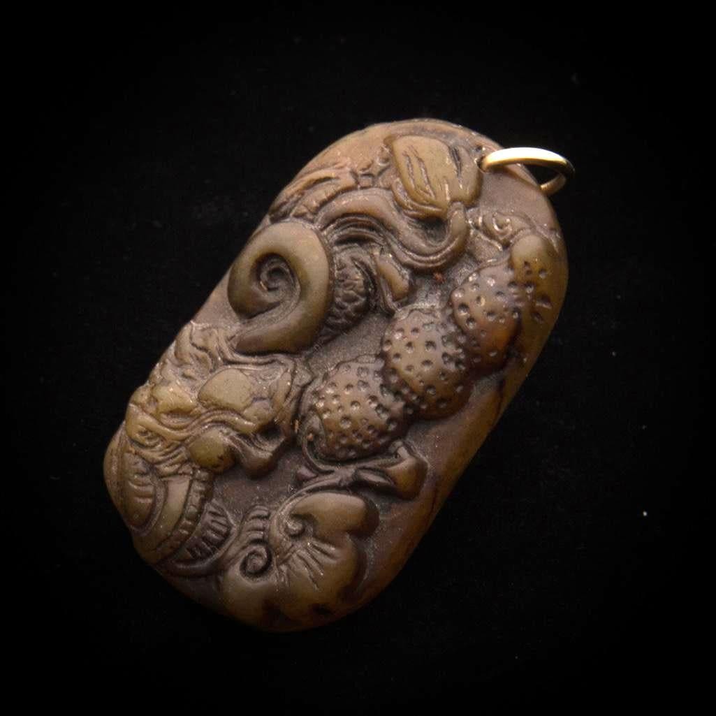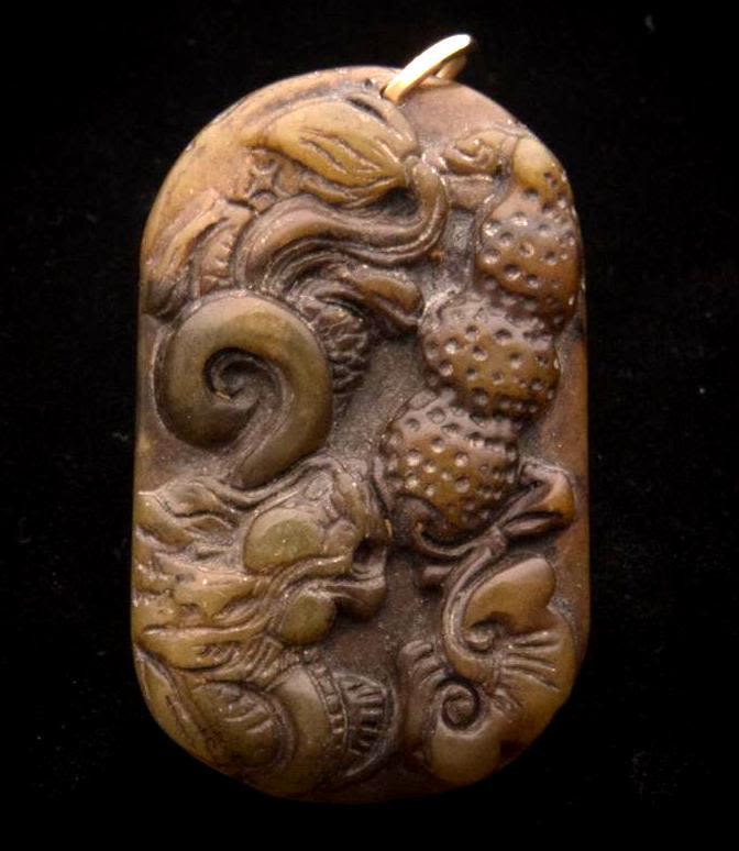 Chinese hardstone/nephrite pendent with 14k gold loop.depicting mythical creatures approx 2"