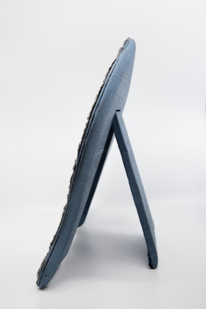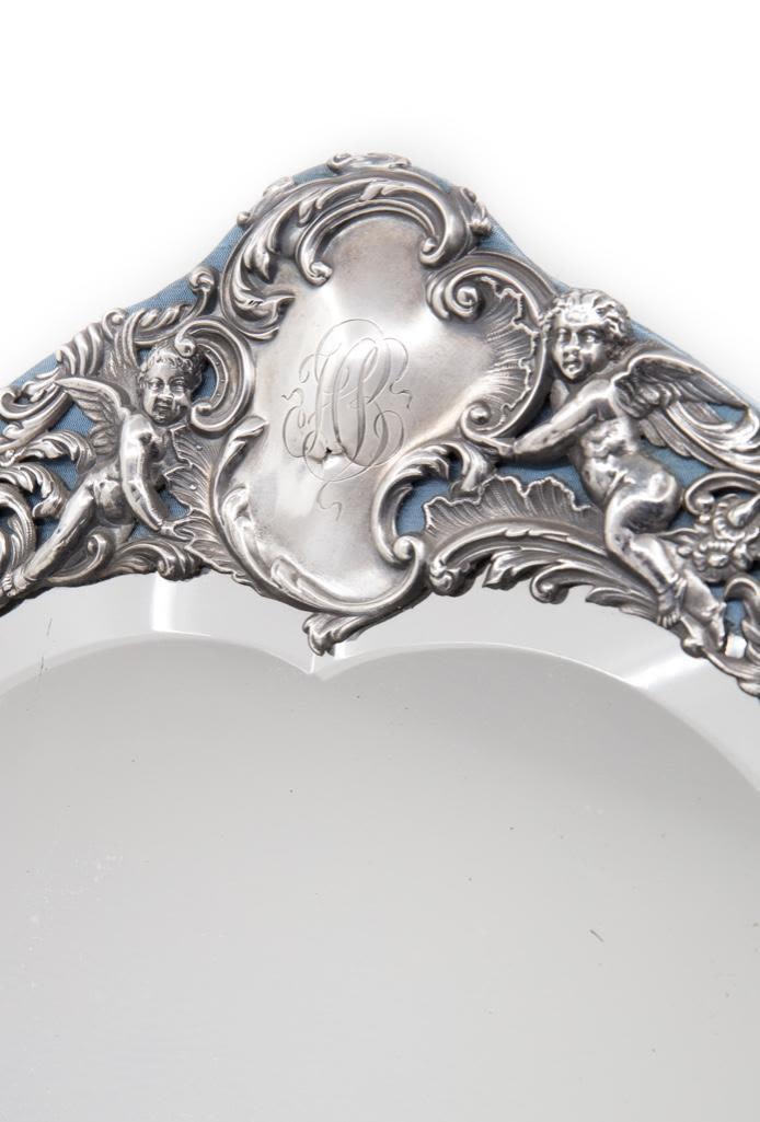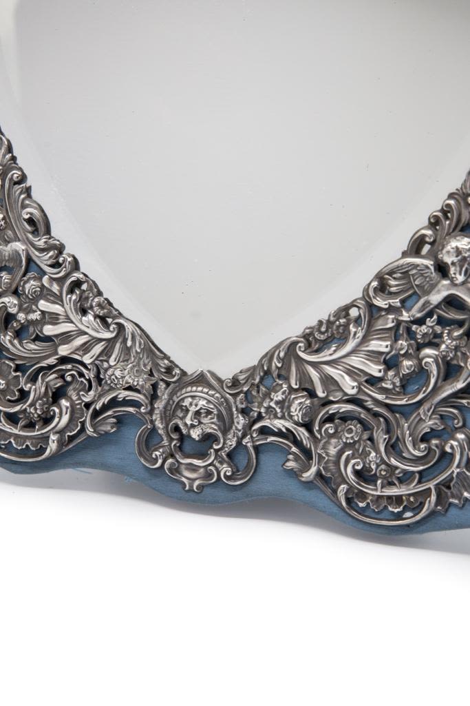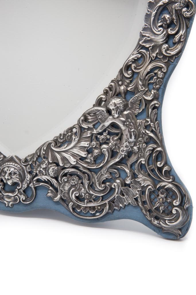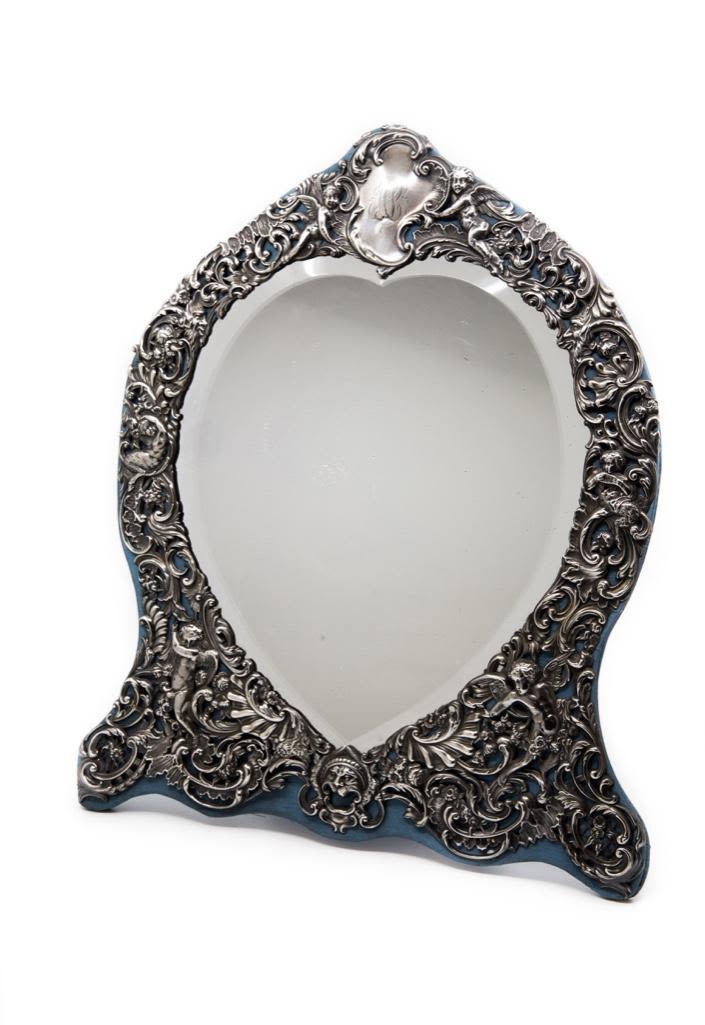 London sterling silver standing mirror, elaborate repousse work with beveled heart shaped mirror, silk backing circa 1895 bears London hallmarks for 1895 and maker mark W.C. approx 18". Please look closely at the images good detail