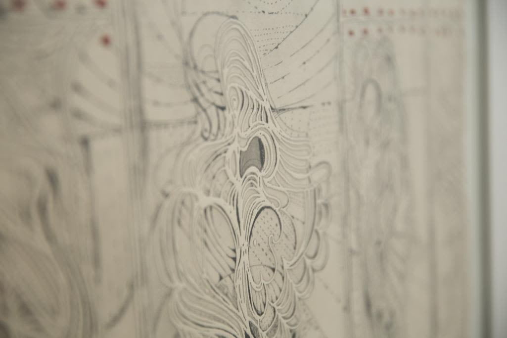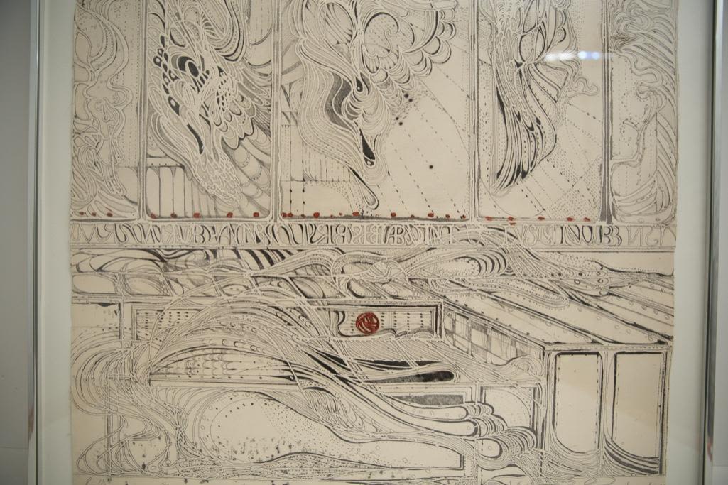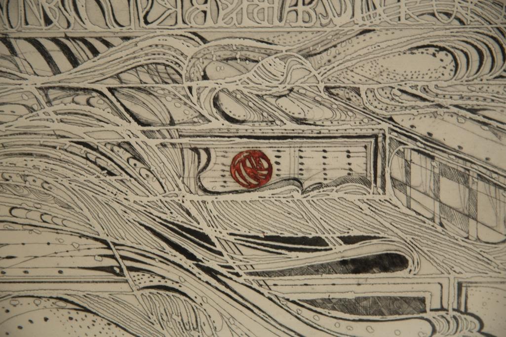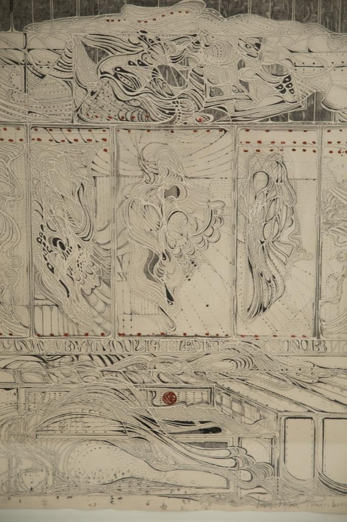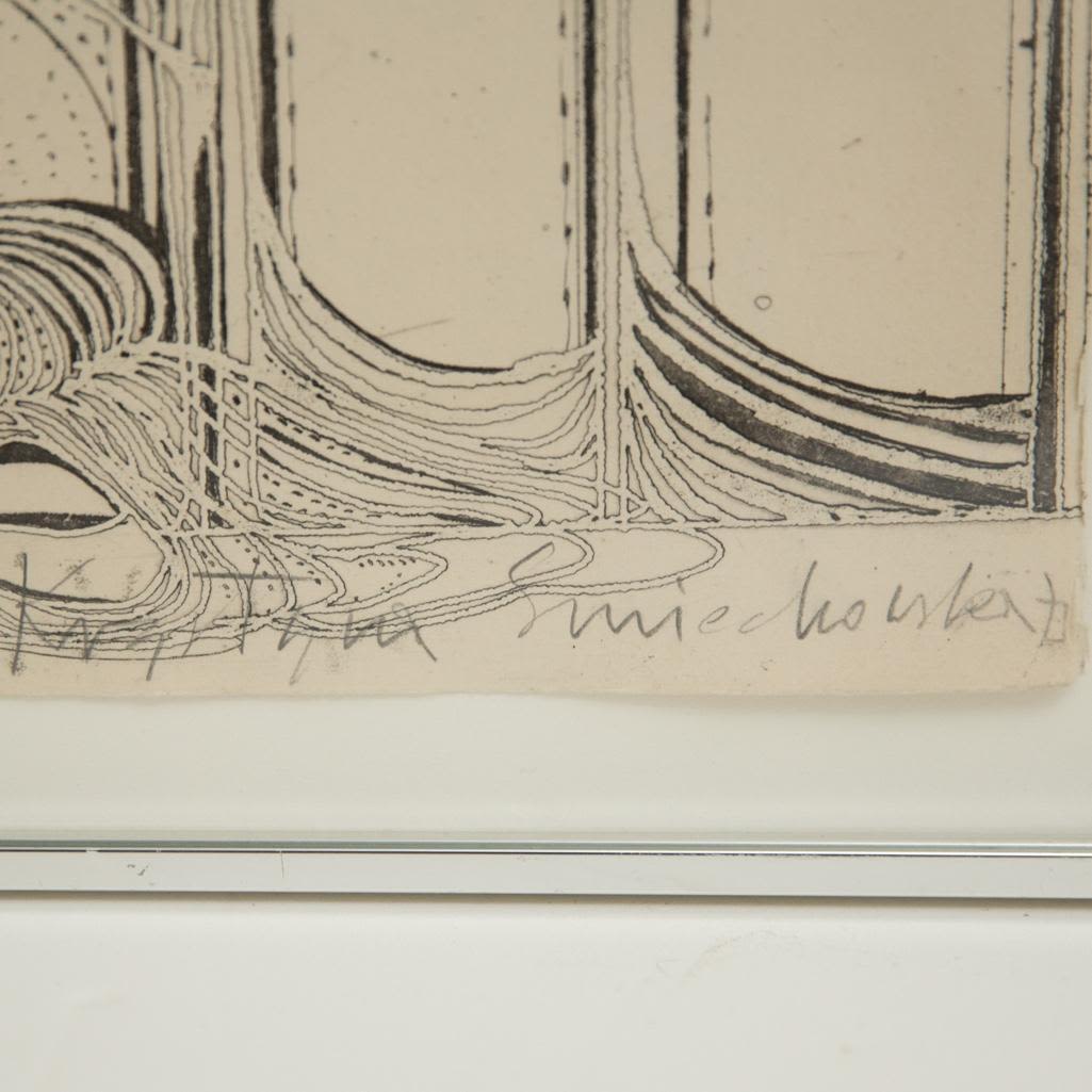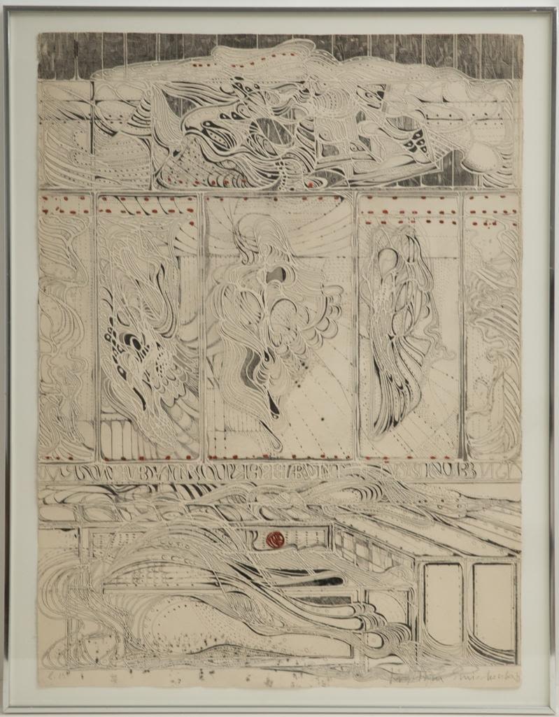 Abstract Surrealist Mixed Media. Signed "Krystyna Smiechowska" in pencil l.r., inscribed indistinctly in pencil l.l. Mixed media on paper, sheet size 30 x 22 in., framed. Condition: Sheet with deckled edges, gentle rippling, floated in frame, not examined out of frame.
