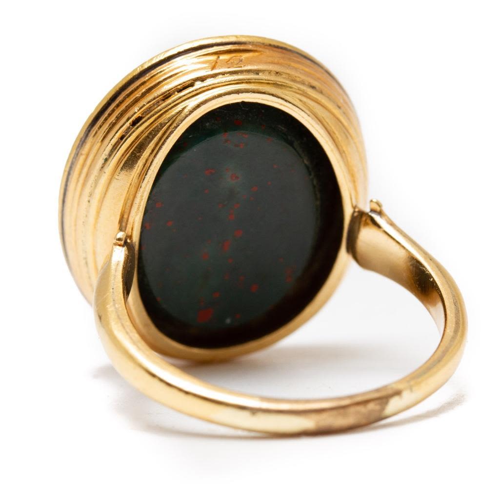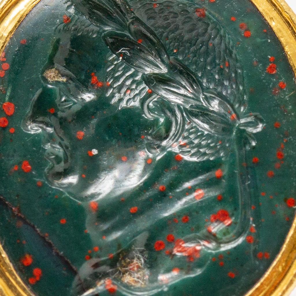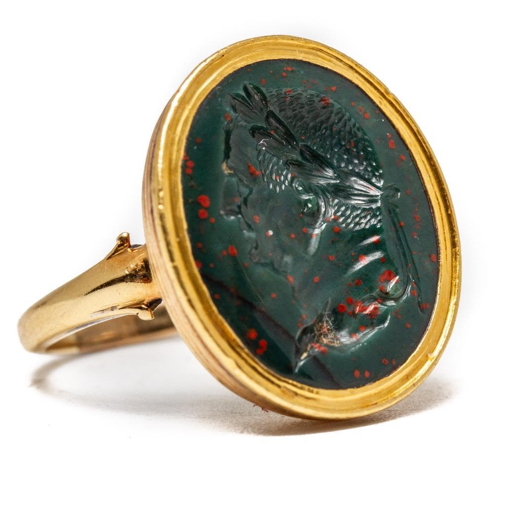 James Robinson Intaglio cut bloodstone and gold ring depicting Caesar. Circa 1790 from the Estate of Bady United Nations Plaza NY, and purchased from James Robinson 57th Street New York, NY in 1975 with original receipt. Size 7.25