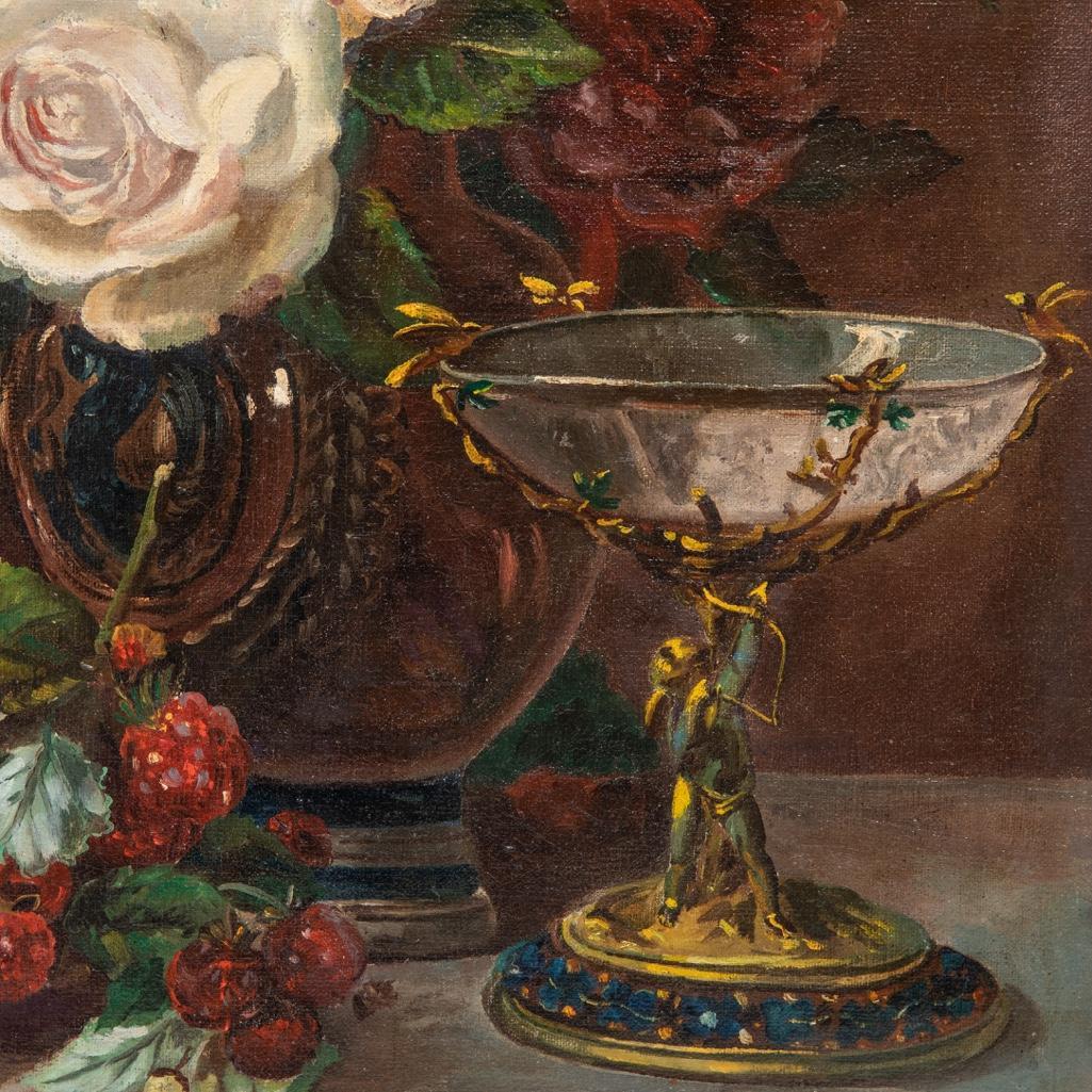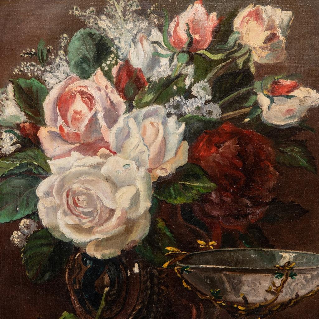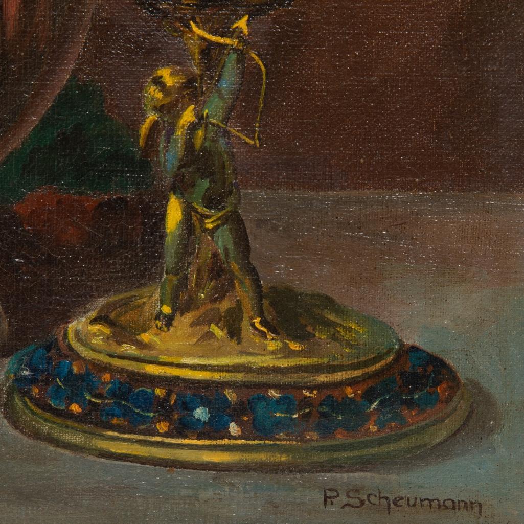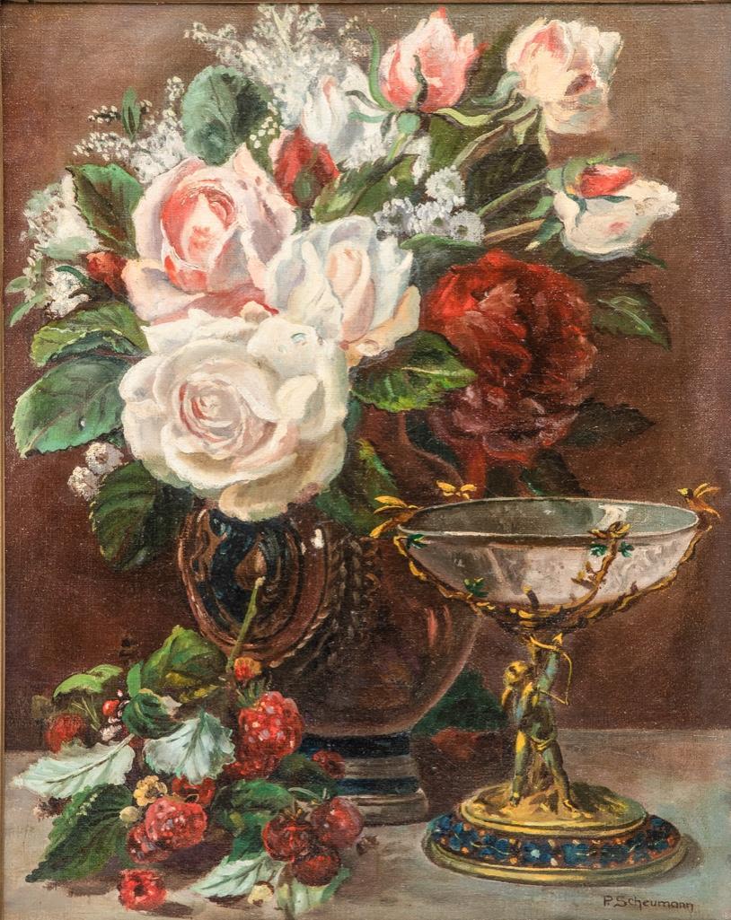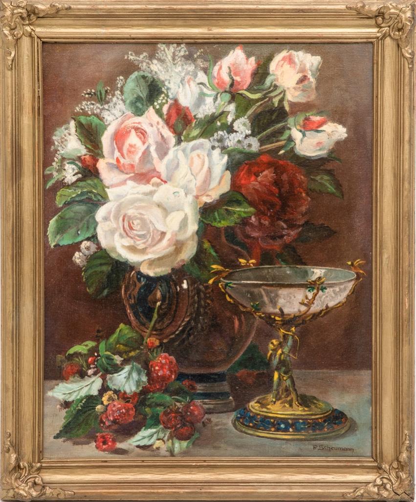 P. Scheumann signed oil painting floral bouquet still life. 19.5" W x 23.5" H measures frame, sight measurement 15.5" H x 19.75" H.