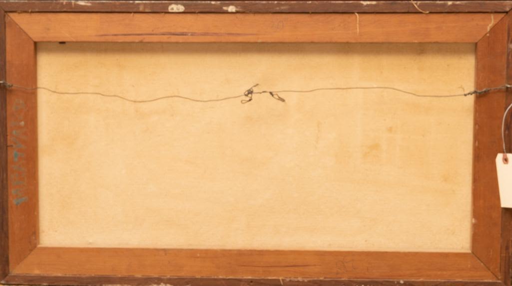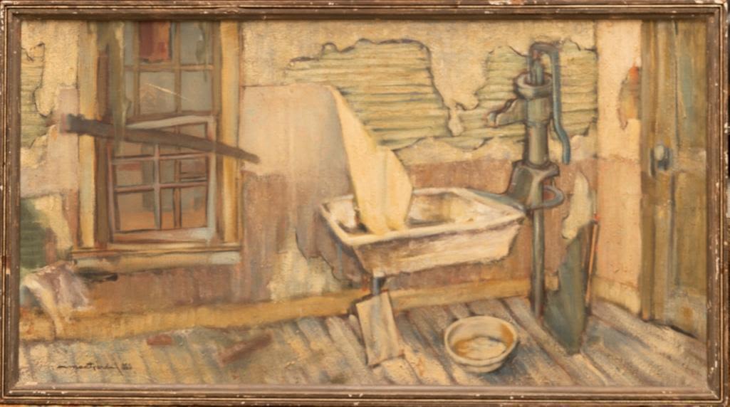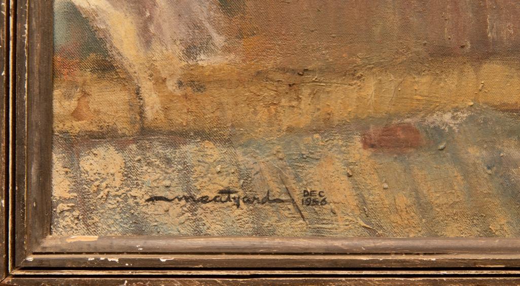 Oil on canvas painting by George Eugene Meatyard (American, 1925-1972) showing the interior of a Florida cabin. Signed "Meatyard" at lower right and dated to December 1956. Good condition. Some loss and Scratches to the frame. Overall framed size is 31 1/2" x 17 1/2".