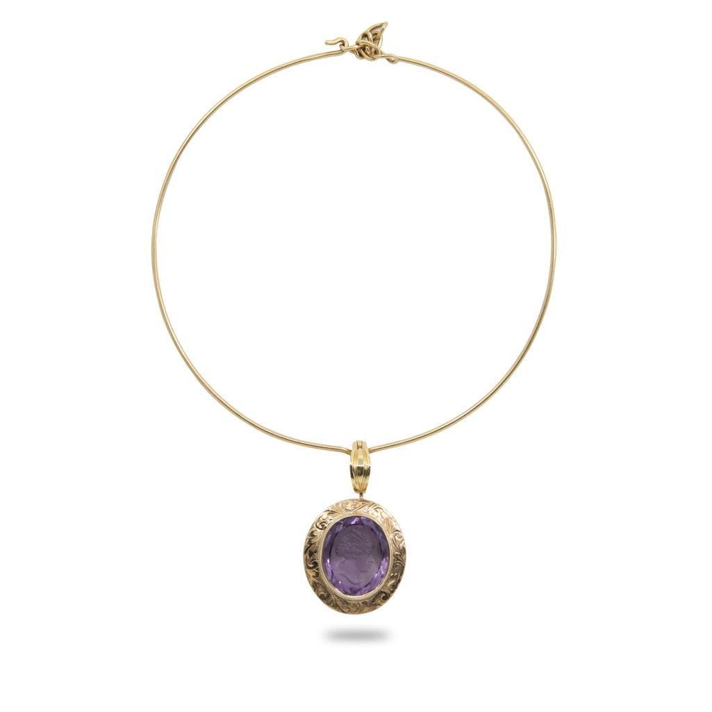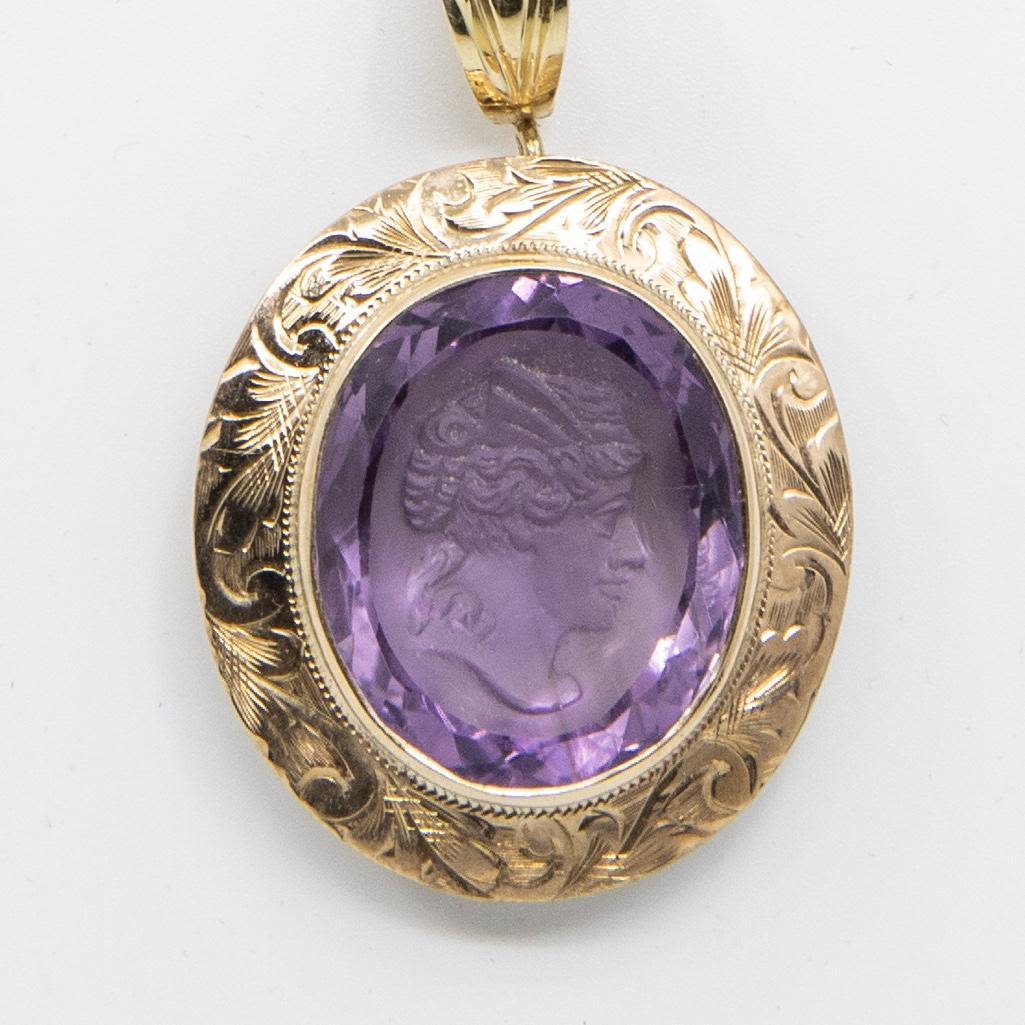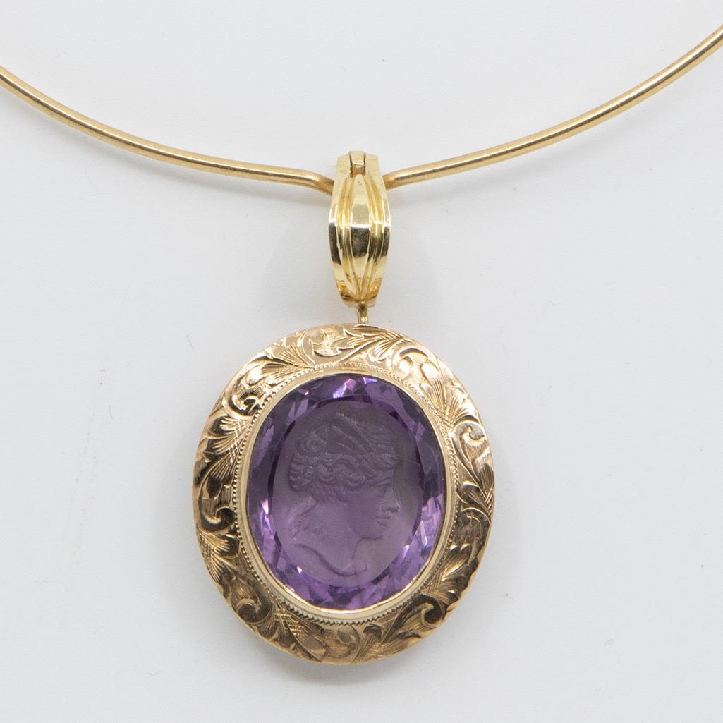 14K and 10K gold amethyst cameo necklace, 18.7dwt. This lot is accompanied by a GIA appraiser letter from an independent and well respected firm established over 75 years ago.