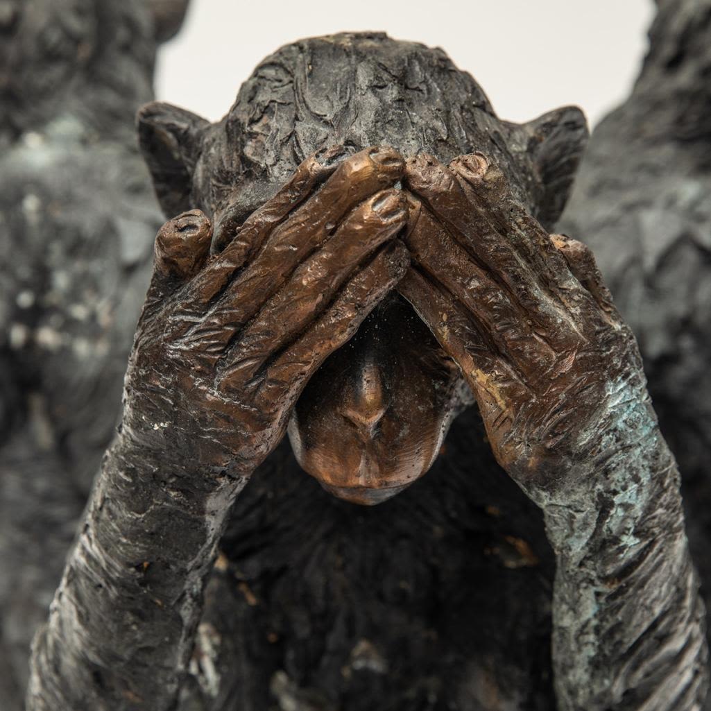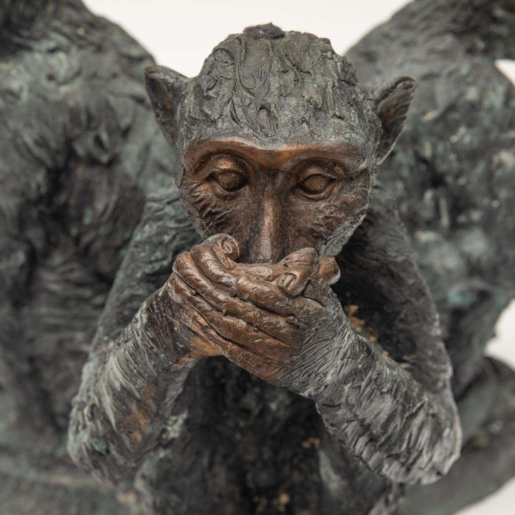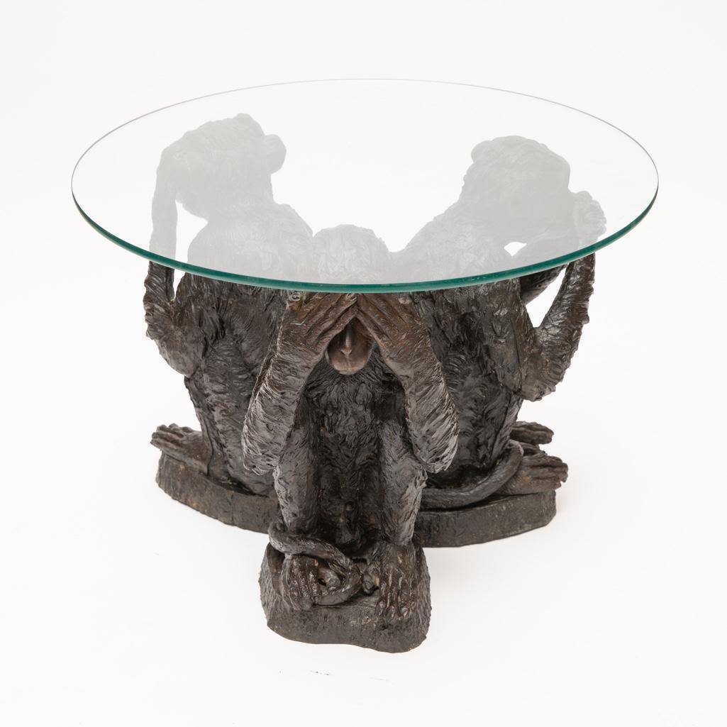 Wonderful Mid Century Bronze Monkey Based Table with glass top. The finely detailed stylized table depicts the three wise monkeys embodying the proverbial principle "see no evil, hear no evil, speak no evil". The three monkeys are Mizaru, who sees no evil, covering his eyes; Kikazaru, who hears no evil, covering his ears; and Iwazaru, who speaks no evil, covering his mouth. The table measures 18"H x 24"D. Excellent casting.