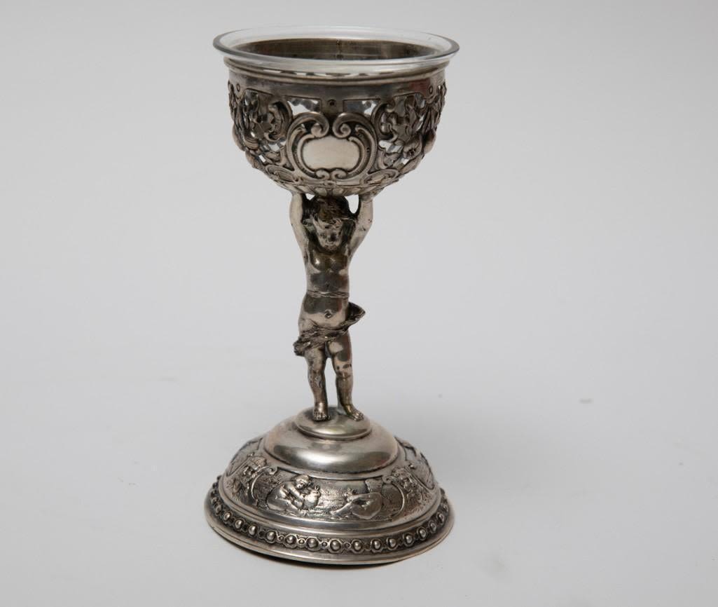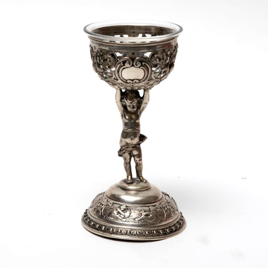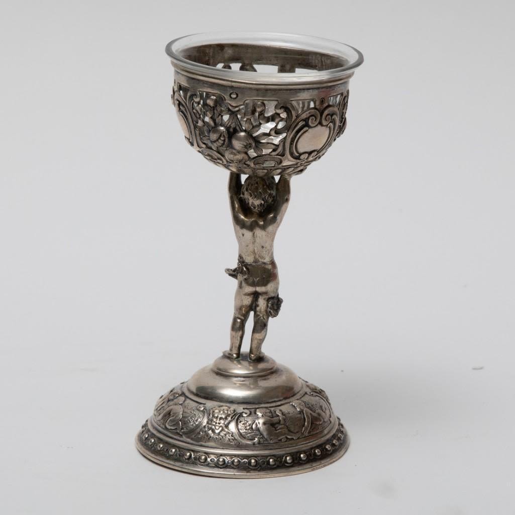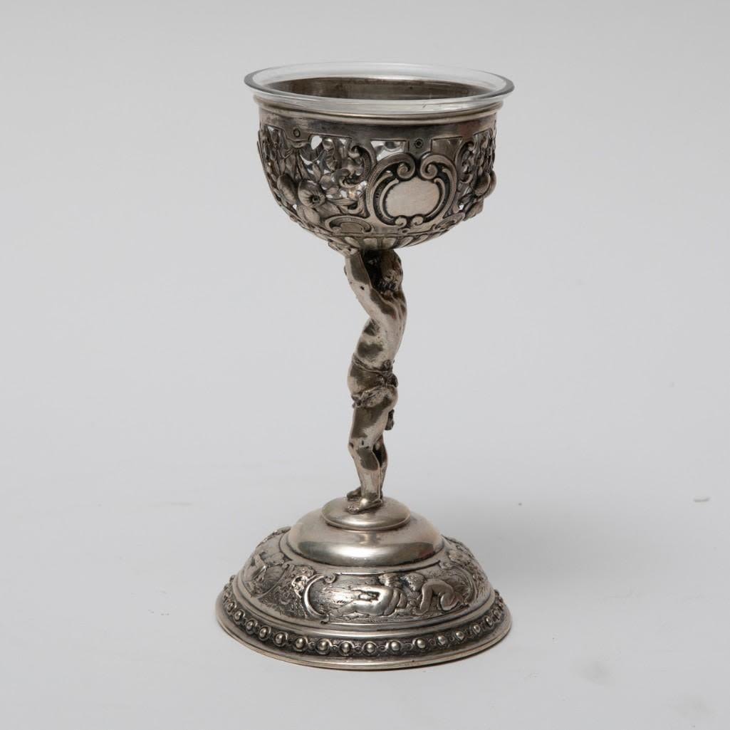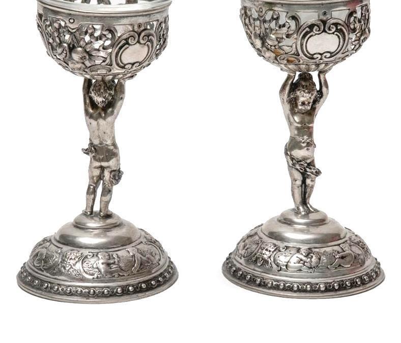 Pair antique German 800 silver rococo footed bowls with cherubs and glass inserts (one replaced). Stamped 800 Germany B with hallmark. Size: 5.75 in tall, weigh 11.17 ozt.