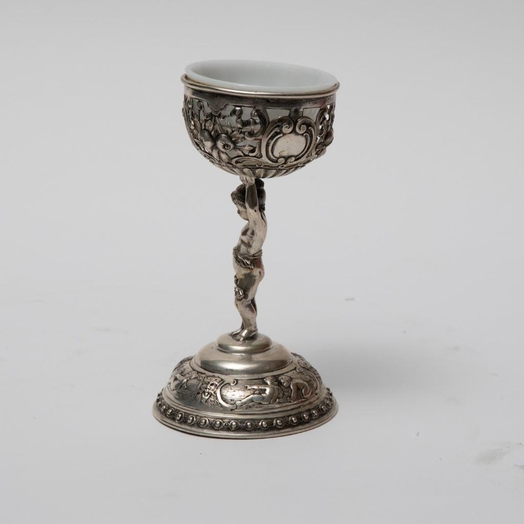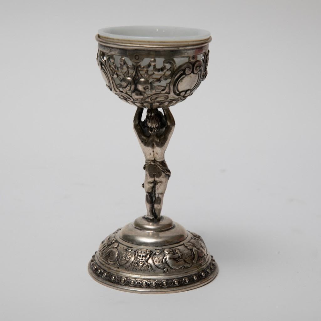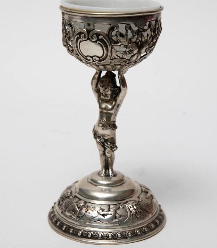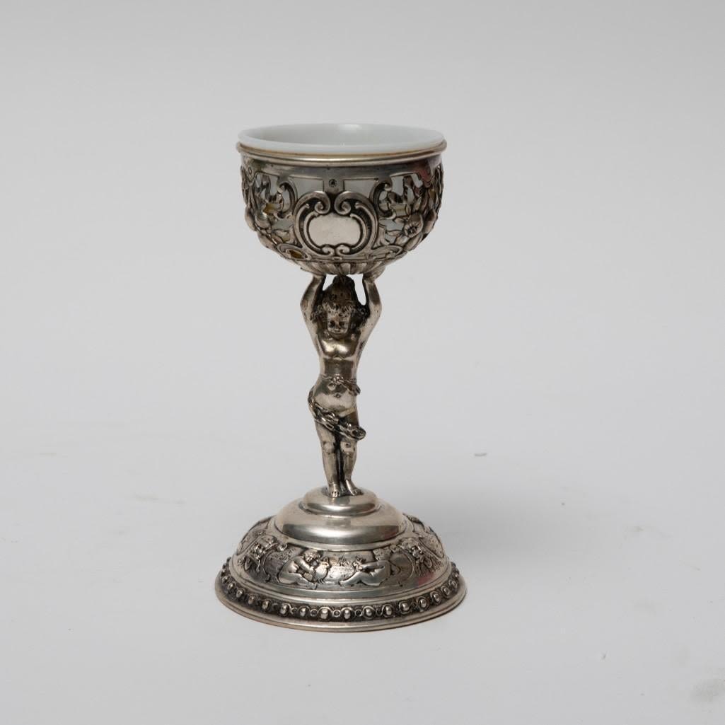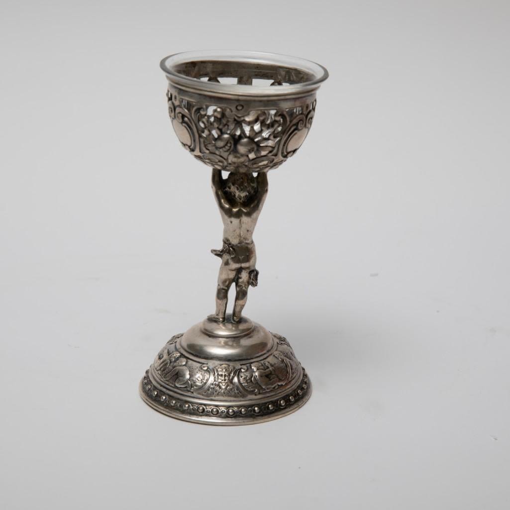 Pair antique German 800 silver rococo footed bowls with cherubs and glass inserts (one replaced). Stamped 800 Germany B with hallmark. Size: 5.75 in tall, weigh 11.17 ozt.