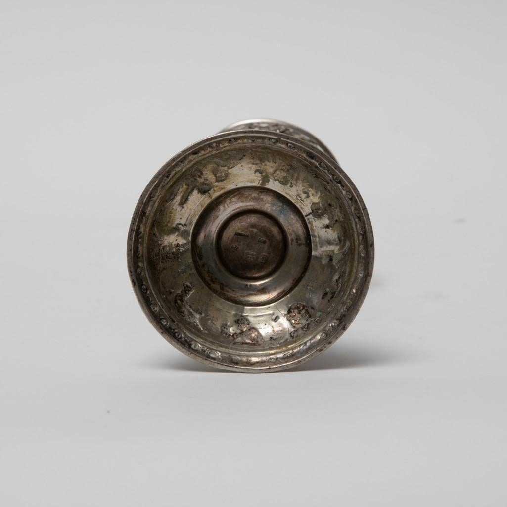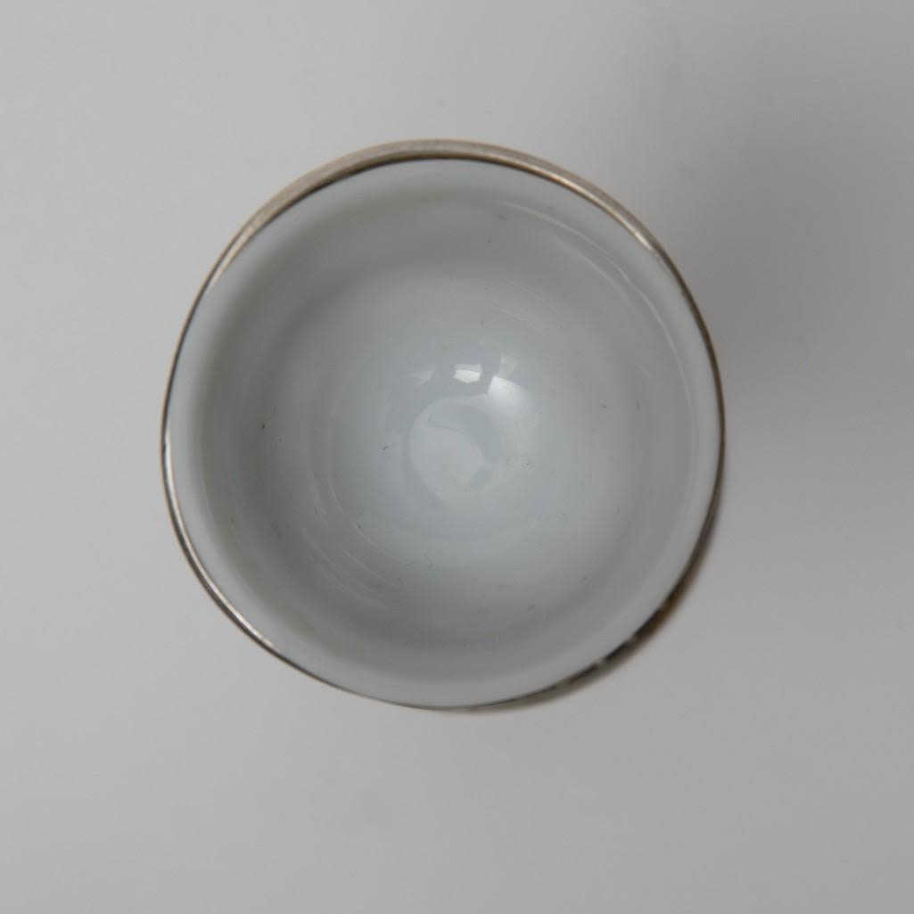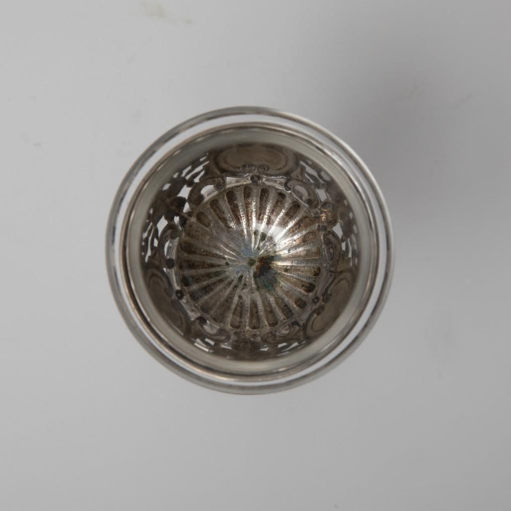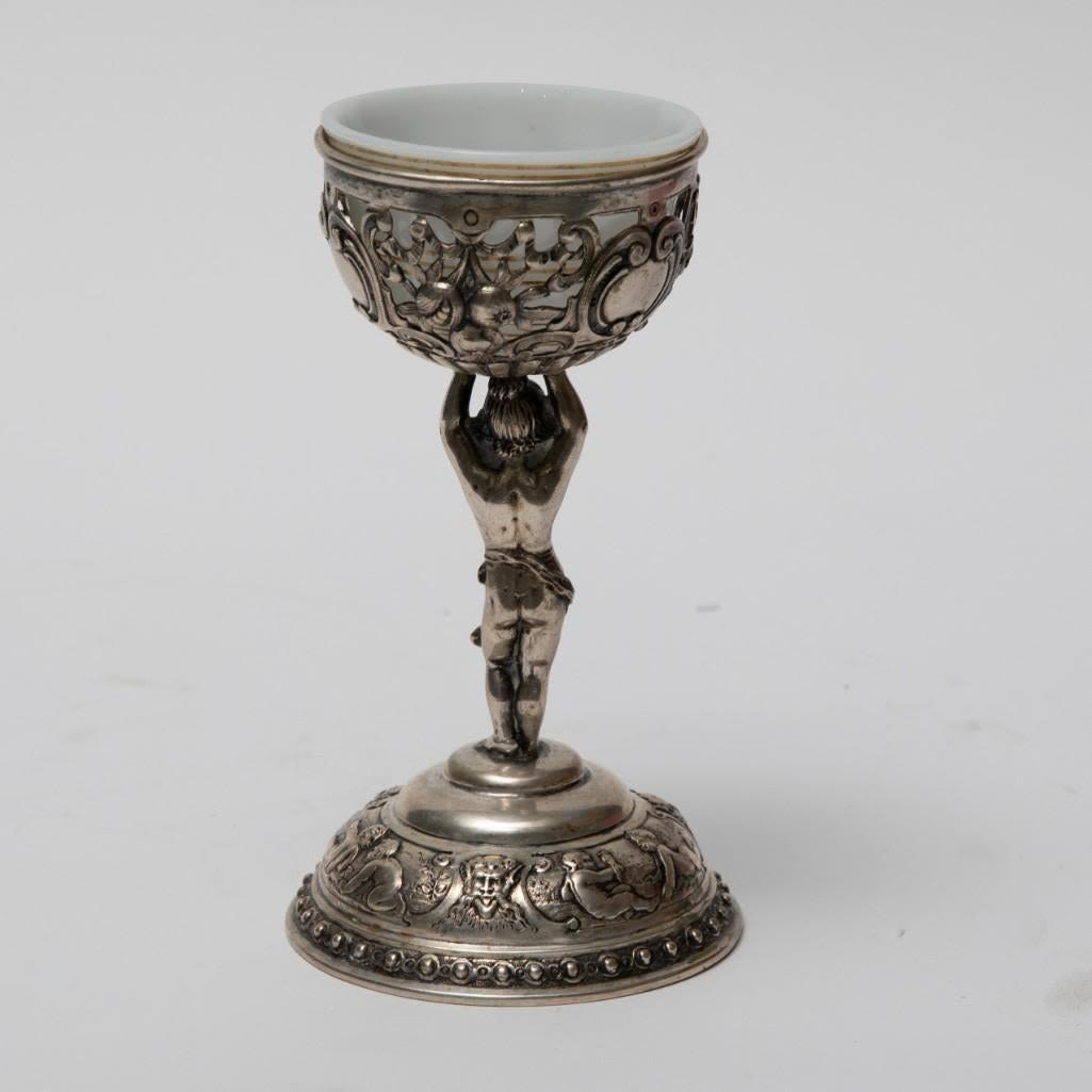 Pair antique German 800 silver rococo footed bowls with cherubs and glass inserts (one replaced). Stamped 800 Germany B with hallmark. Size: 5.75 in tall, weigh 11.17 ozt.