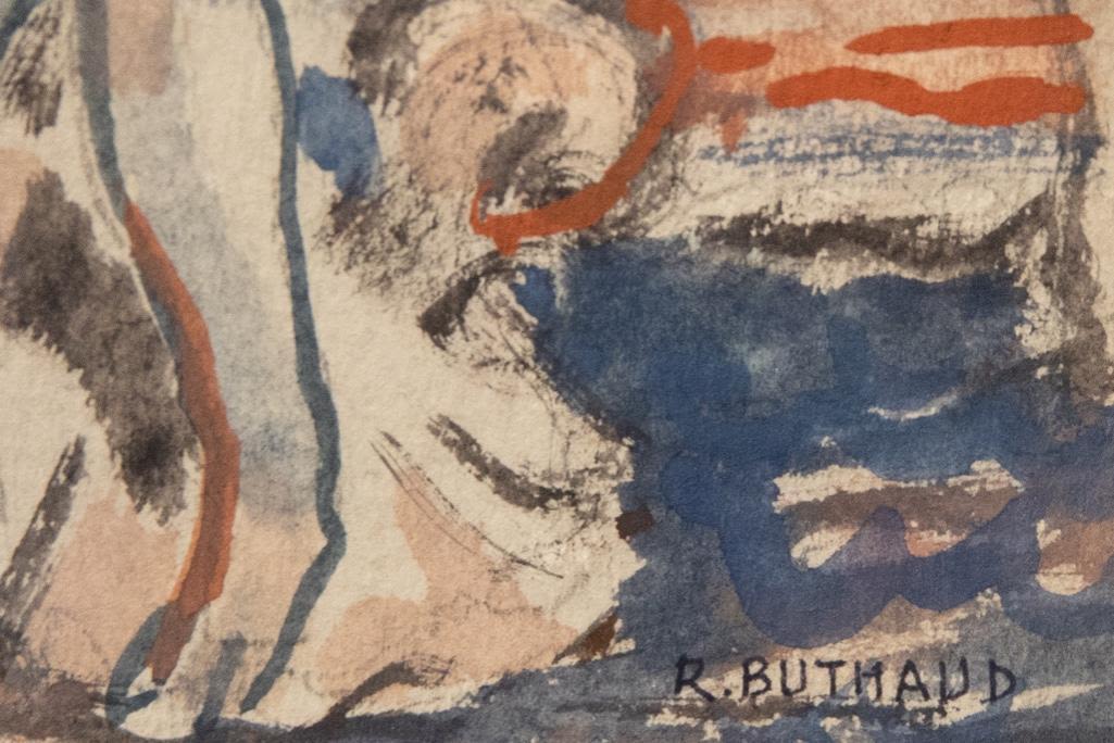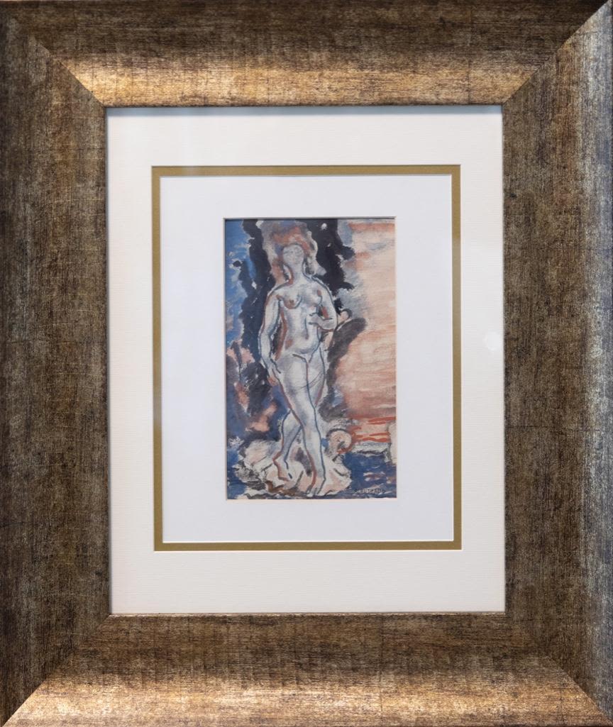 Rene Buthaud mid century nude study, signed gouache on paper. Provenance: The artist, collection Michel Fortin, Paris: Collection of Stephen Engel, Florida: Literature: Cruège, René Buthaud. René Buthaud was seen as the most accomplished and important French ceramist of the Art Deco period, an opinion held to this day. He designed simple stoneware forms, made for him by local potters, and used crackle glazes with which to decorate them. He was also influenced by African tribal art, evident in those pieces where he used lusters or what he called ‘peau de serpent’ (snakeskin). Many of his best-known pieces are painted with supine female nudes. Work by Buthaud can be found in the collections of the Musée des Arts Décoratifs in Paris, the Metropolitan Museum of Art, among many others. H 19.5 in. x W 16.5 in. x D 1.25 in. Framed