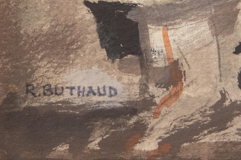 Rene Buthaud mid century nude study, signed gouache on paper Provenance: The artist, collection Michel Fortin, Paris: Collection of Stephen Engel, Florida: Literature: Cruège, René Buthaud. René Buthaud was seen as the most accomplished and important French ceramist of the Art Deco period, an opinion held to this day. He designed simple stoneware forms, made for him by local potters, and used crackle glazes with which to decorate them. He was also influenced by African tribal art, evident in those pieces where he used lusters or what he called ‘peau de serpent’ (snakeskin). Many of his best-known pieces are painted with supine female nudes. Work by Buthaud can be found in the collections of the Musée des Arts Décoratifs in Paris, the Metropolitan Museum of Art, among many others. H 19.5 in. x W 16.5 in. x D 1.25 in. Framed