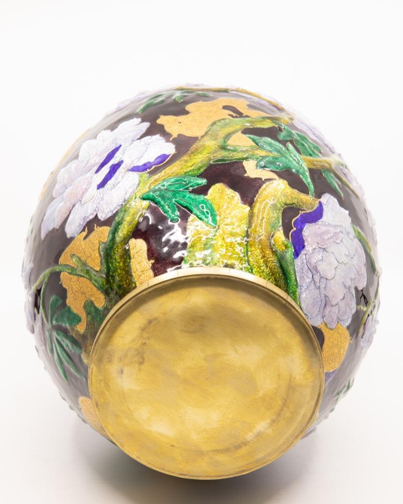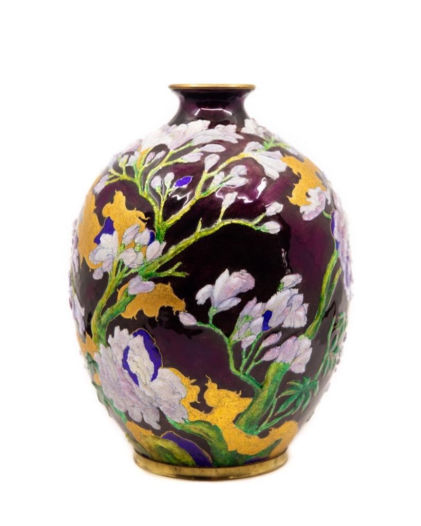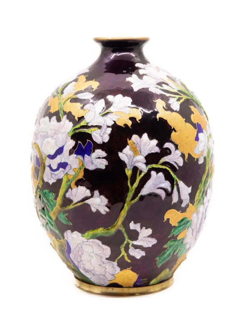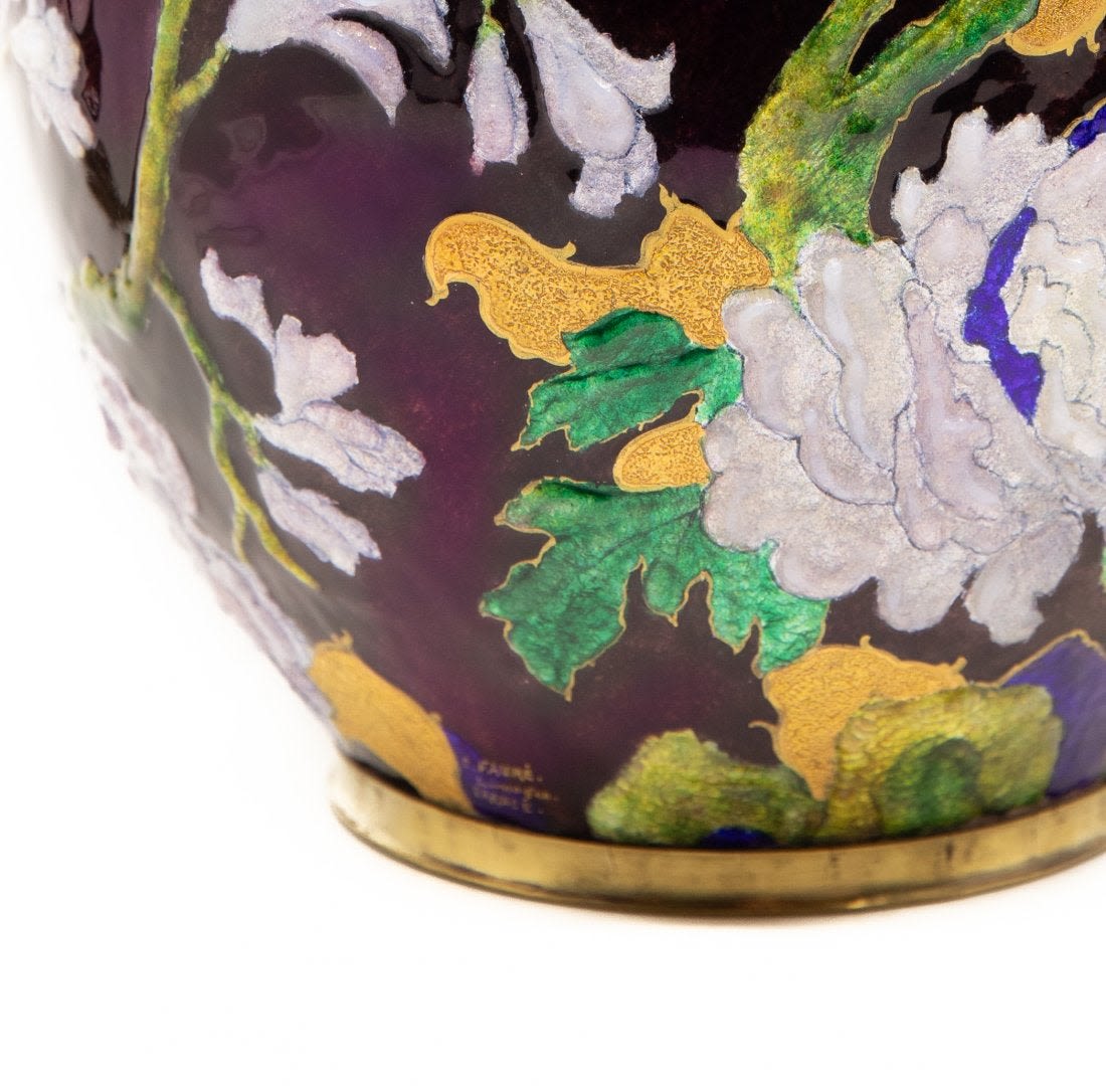 Art Nouveau exceptional and large, Camille Fauré for Limoges enamel on copper, bas-relief raised three dimensional enameled floral motif with gold enamel accents on a plum ground copper vase(sorry it looks like black in the photos), signed "C. Fauré. Limoges-France" Circa 1925. Camille Fauré was a French enamel artist best known for his design work for the pottery company Limoges. Fauré’s use of floral and figurative patterning as well as richly glazed colors were hallmarks of his work. Born in 1872 in Periguex, France, he apprenticed for several years before producing his own designs. First establishing himself at the Au Vase Etrusque shop in Paris, he went on to exhibit at the International Exhibition of Modern Decorative and Industrial Arts in 1925. This exhibition famously gave rise to the term Art Deco. Fauré died in 1956 in Paris, France. Approx 12"h x 9"D
