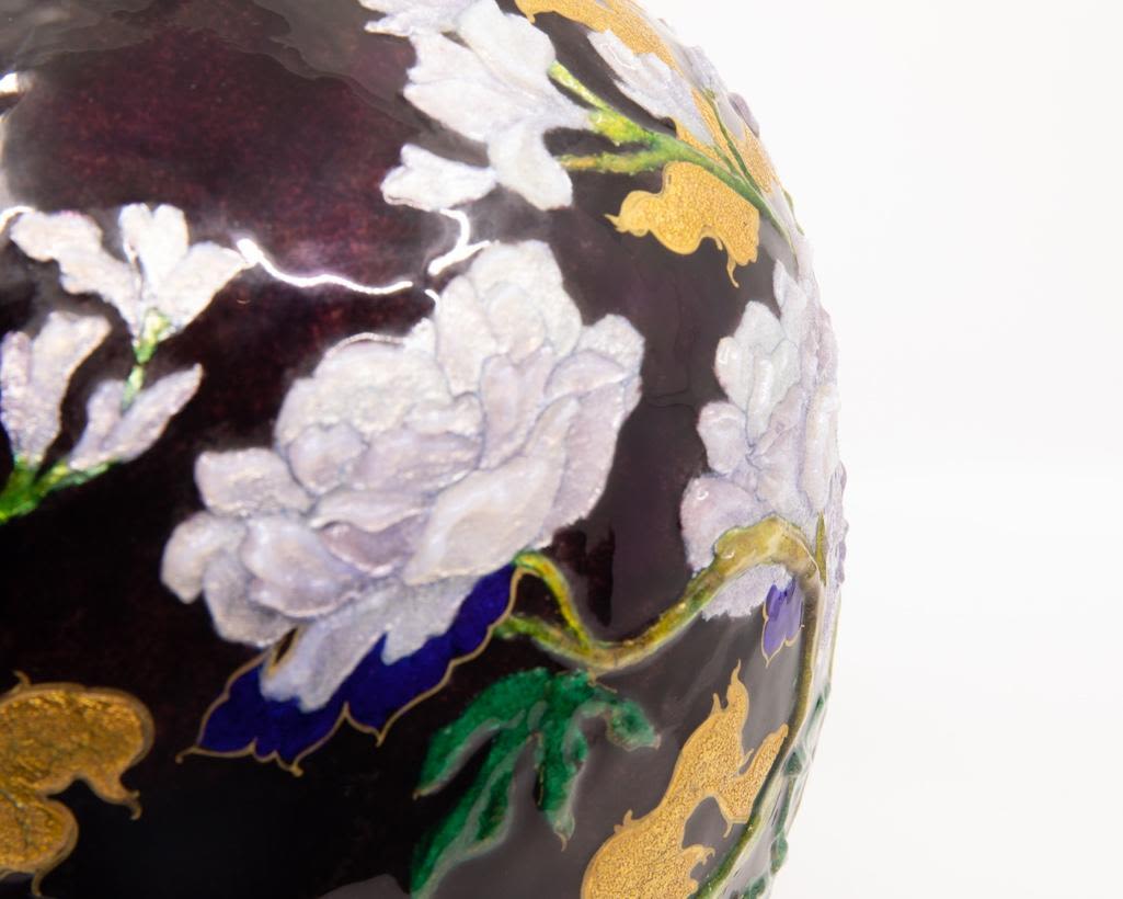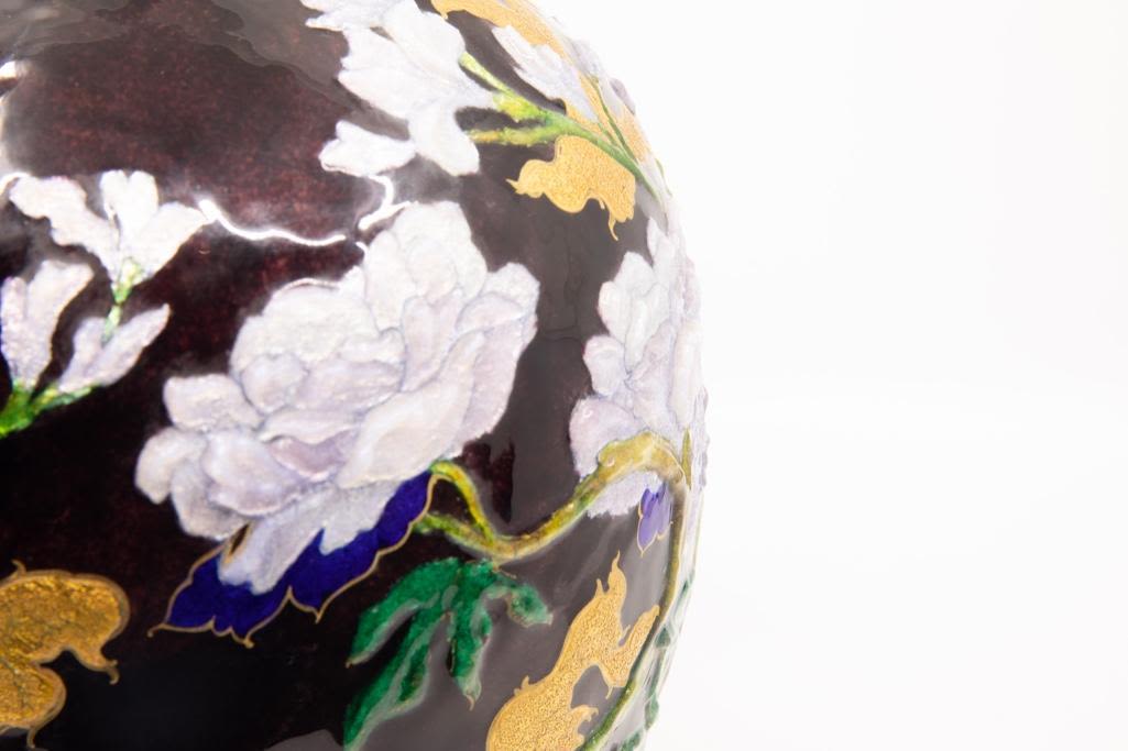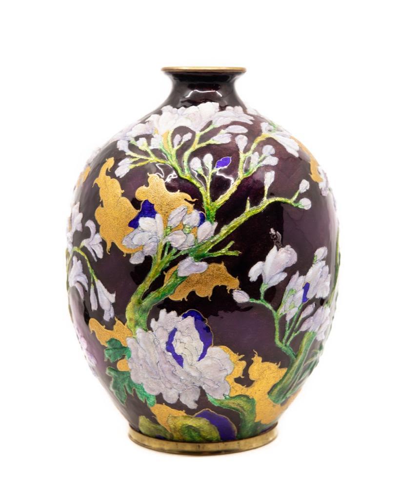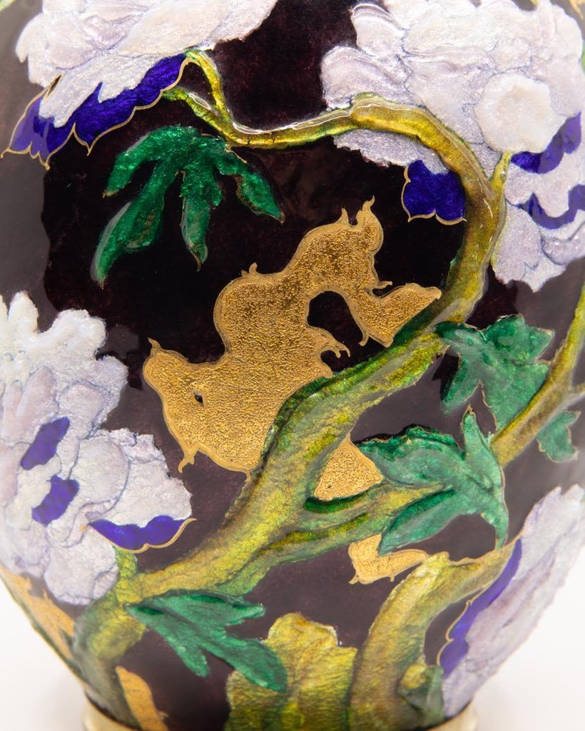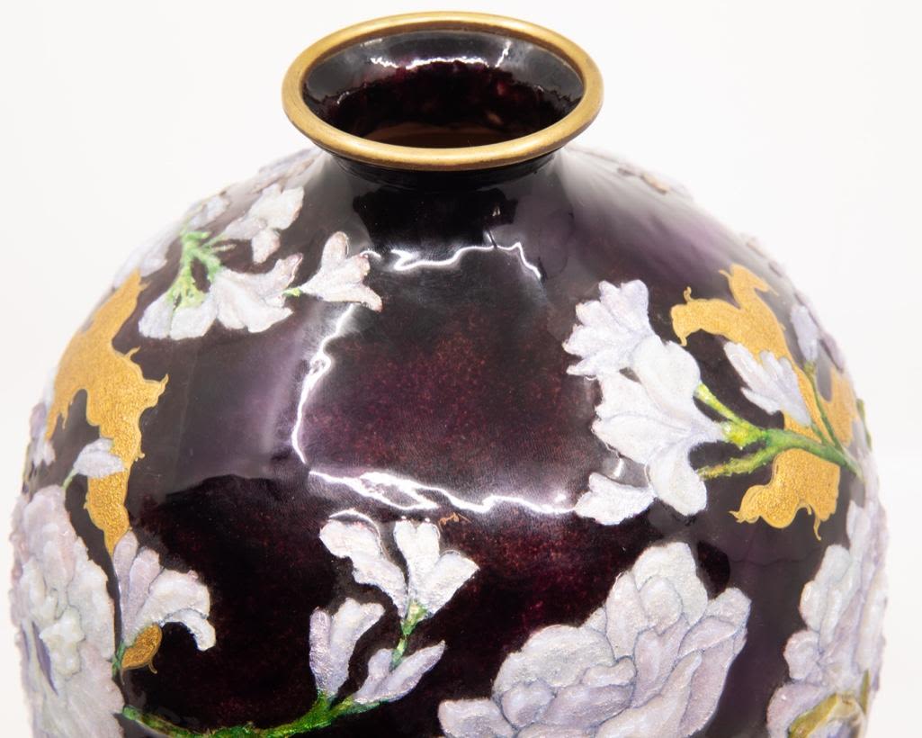 Art Nouveau exceptional and large, Camille Fauré for Limoges enamel on copper, bas-relief raised three dimensional enameled floral motif with gold enamel accents on a plum ground copper vase(sorry it looks like black in the photos), signed "C. Fauré. Limoges-France" Circa 1925. Camille Fauré was a French enamel artist best known for his design work for the pottery company Limoges. Fauré’s use of floral and figurative patterning as well as richly glazed colors were hallmarks of his work. Born in 1872 in Periguex, France, he apprenticed for several years before producing his own designs. First establishing himself at the Au Vase Etrusque shop in Paris, he went on to exhibit at the International Exhibition of Modern Decorative and Industrial Arts in 1925. This exhibition famously gave rise to the term Art Deco. Fauré died in 1956 in Paris, France. Approx 12"h x 9"D