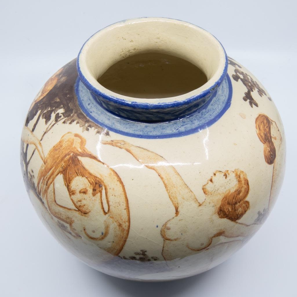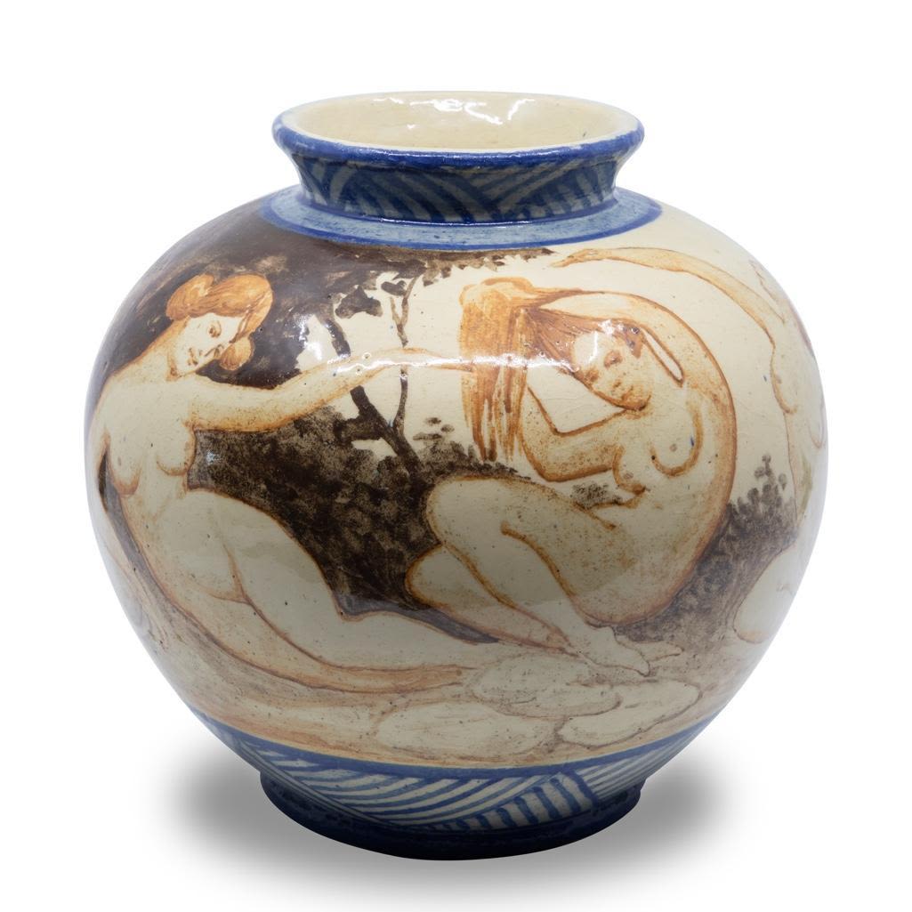 RORSTRAND Vase signed decorated in the art nouveau/art deco style with reclining nudes, Sweden, early 20th century Glazed earthenware Manufacturer mark/NTE. Measure approx 8 1/4" x 9"