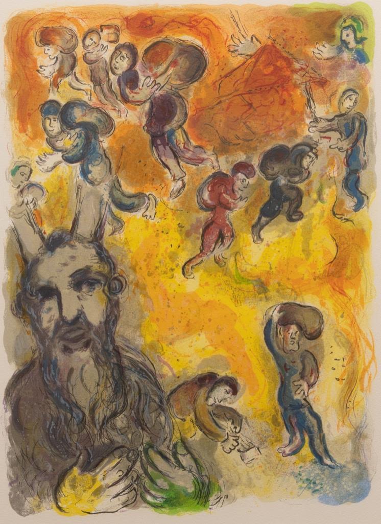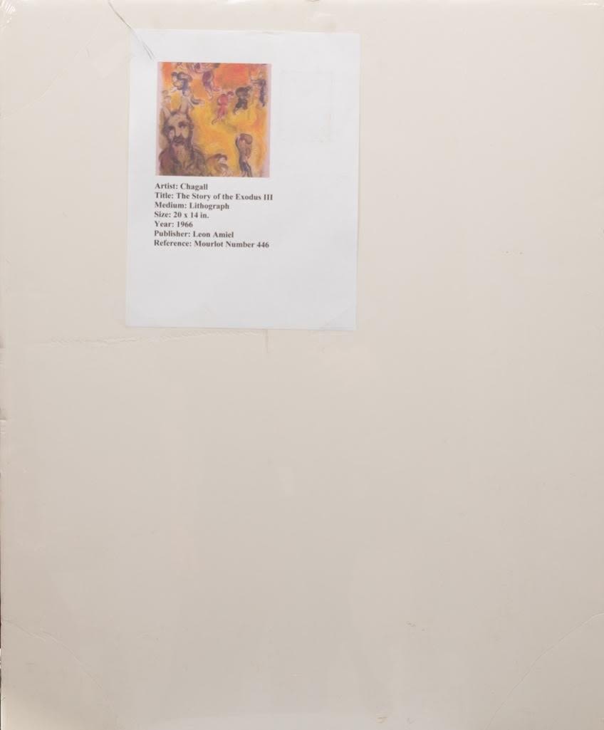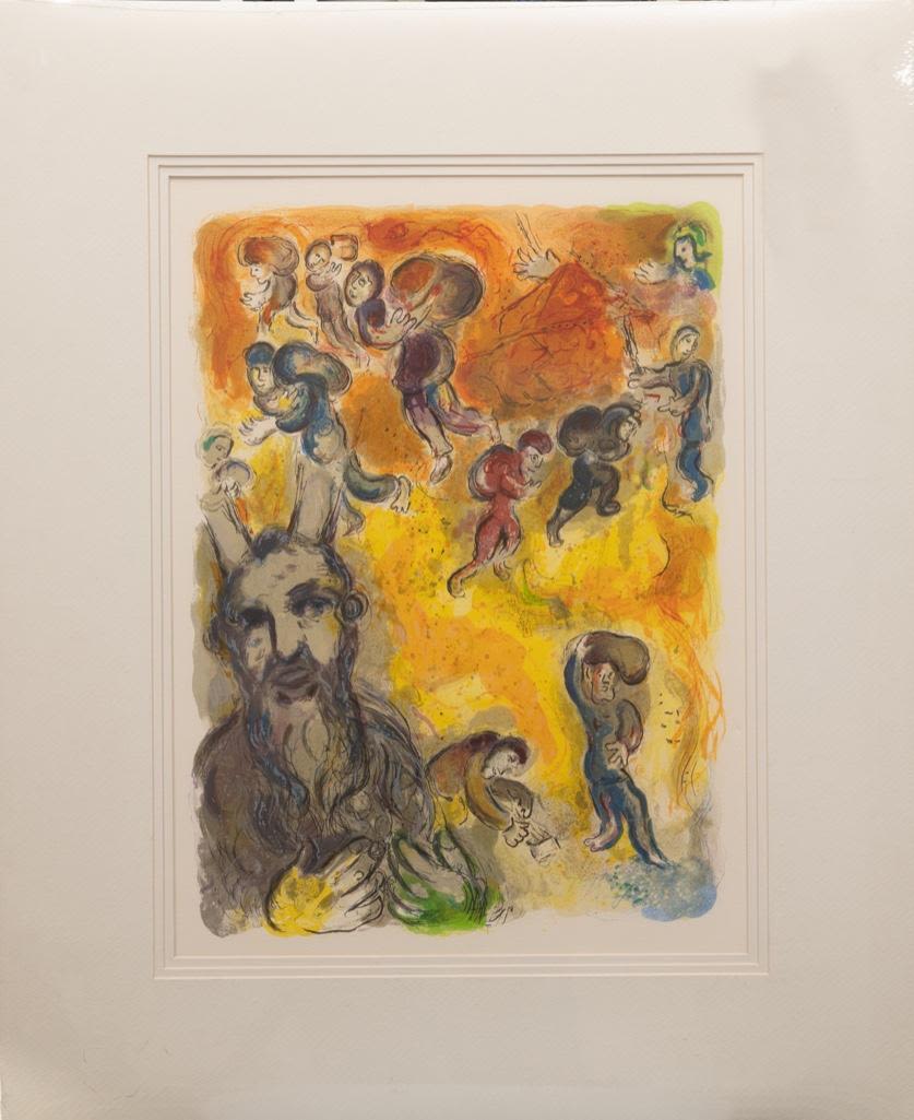 Marc Chagall Lithograph signed "Moses sees the suffering of his people". 1966 from titled The Story of Exodus III. Published by Leon Amiel. In 1966, Leon Amiel published the edition which consisted of 285 signed portfolios, 250 on Velin d’Arches numbered from 1 to 250, 20 on Japanese paper Measure 19 x 14 approx. This work is referenced and picture in the artist catalog raisonne as plate number 446.