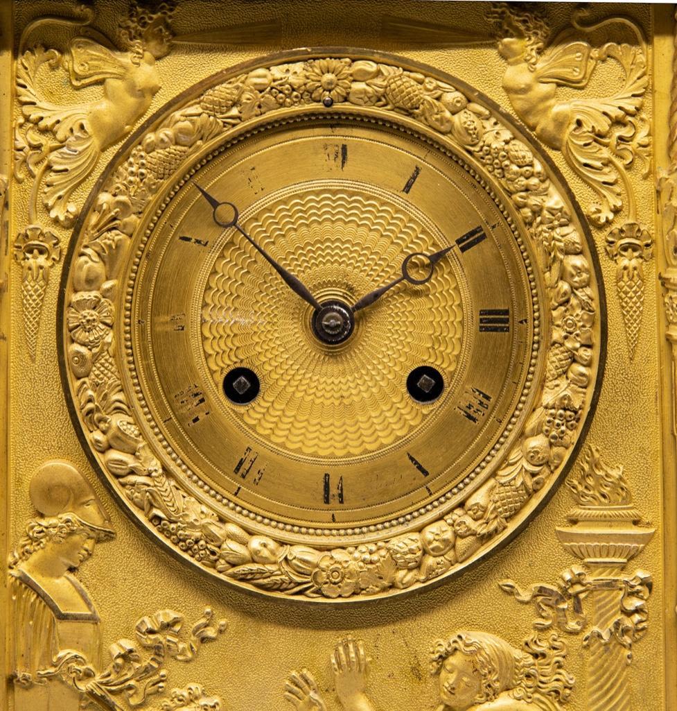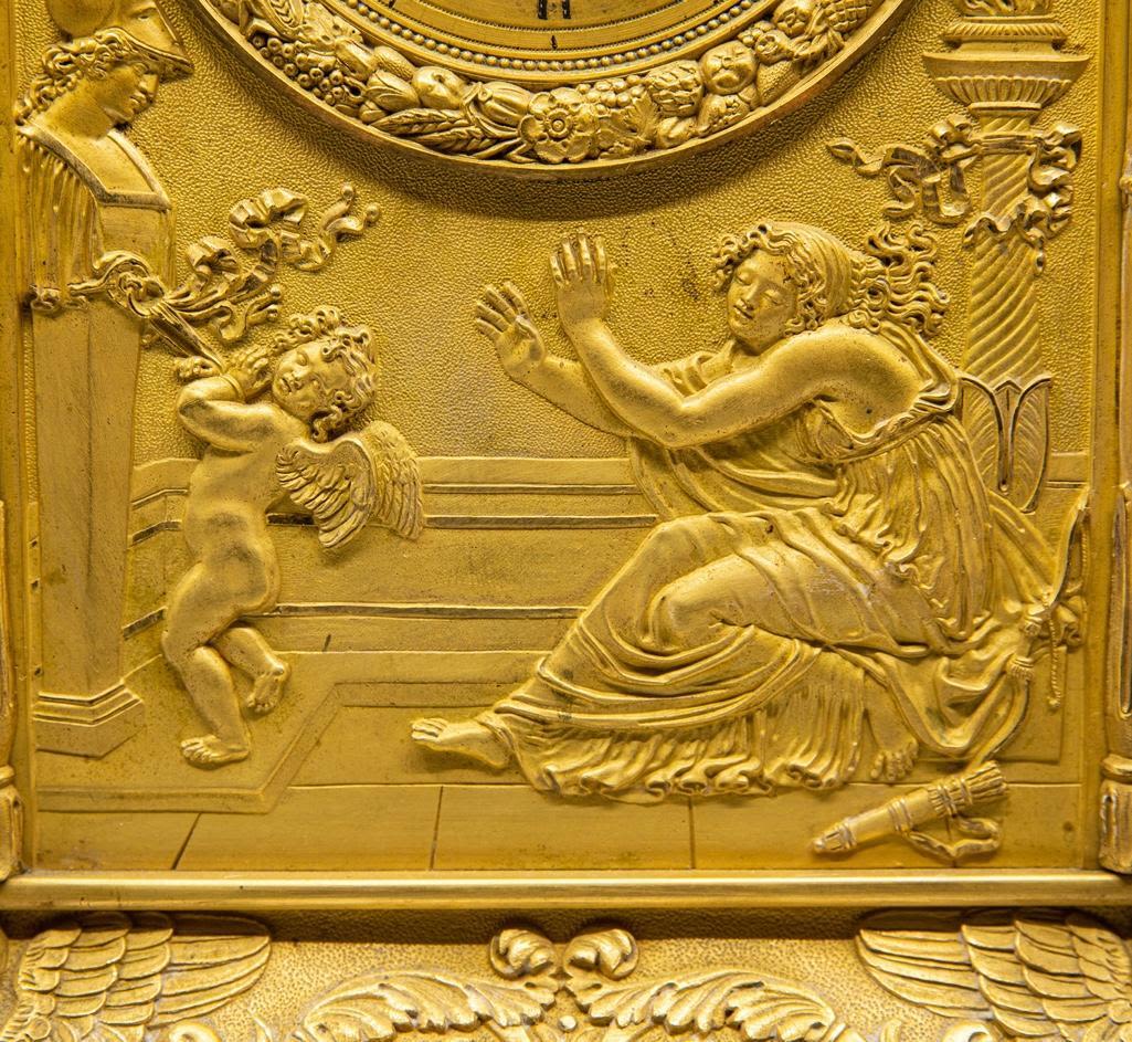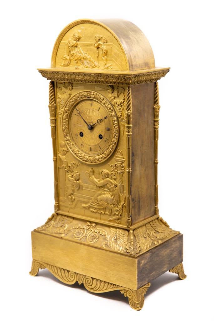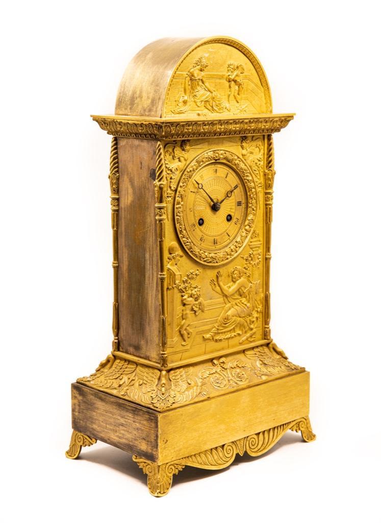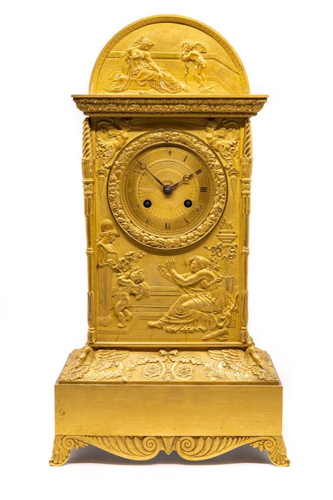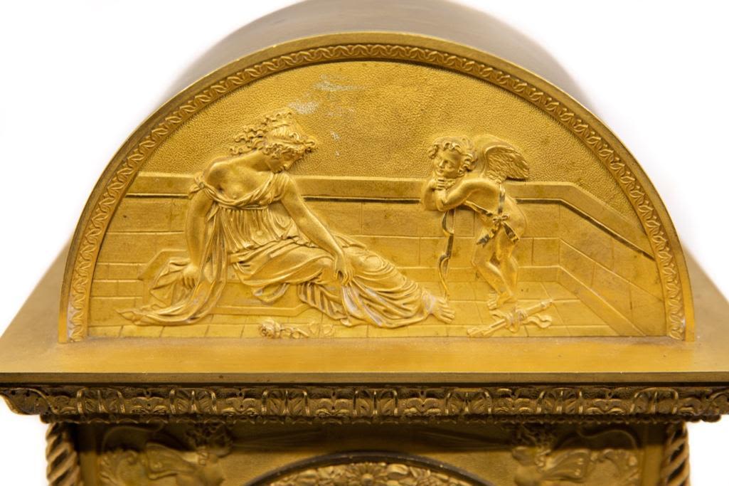 Frnch silk thread movement clock bronze with bas-relief allegorical scene with cupid bound to a statue and a maiden motif ormolu mantel clock, dial with painted Roman numerals, movement marked: "XB / 201," 19th century. 18.75 x 10.25" W x 6.5" D. Wear to painted numerals.