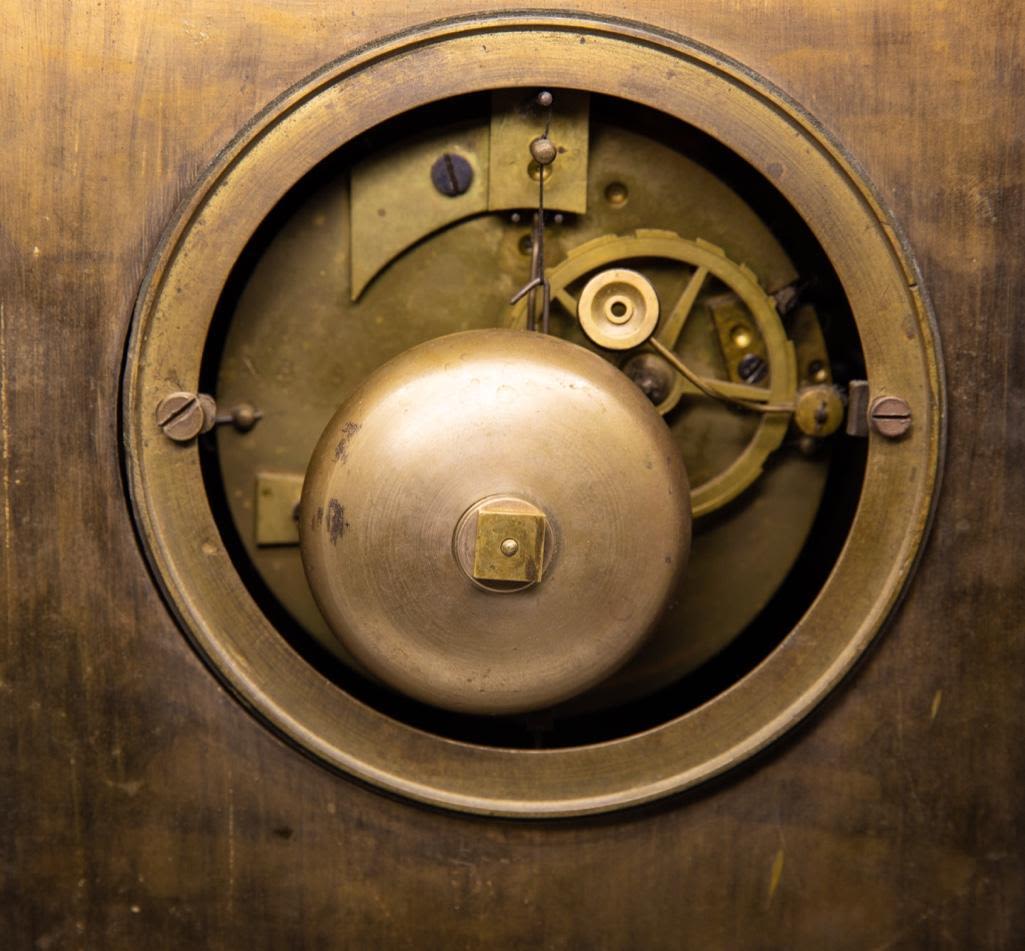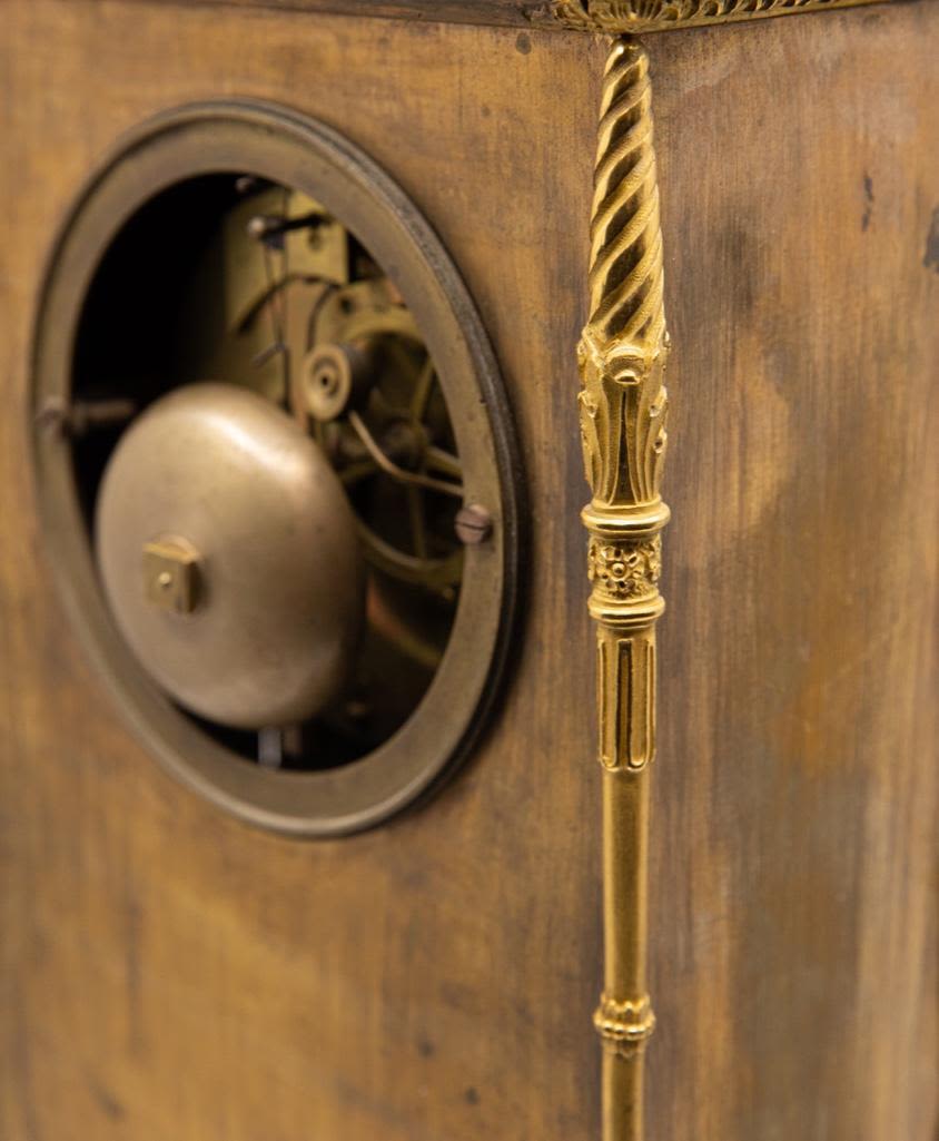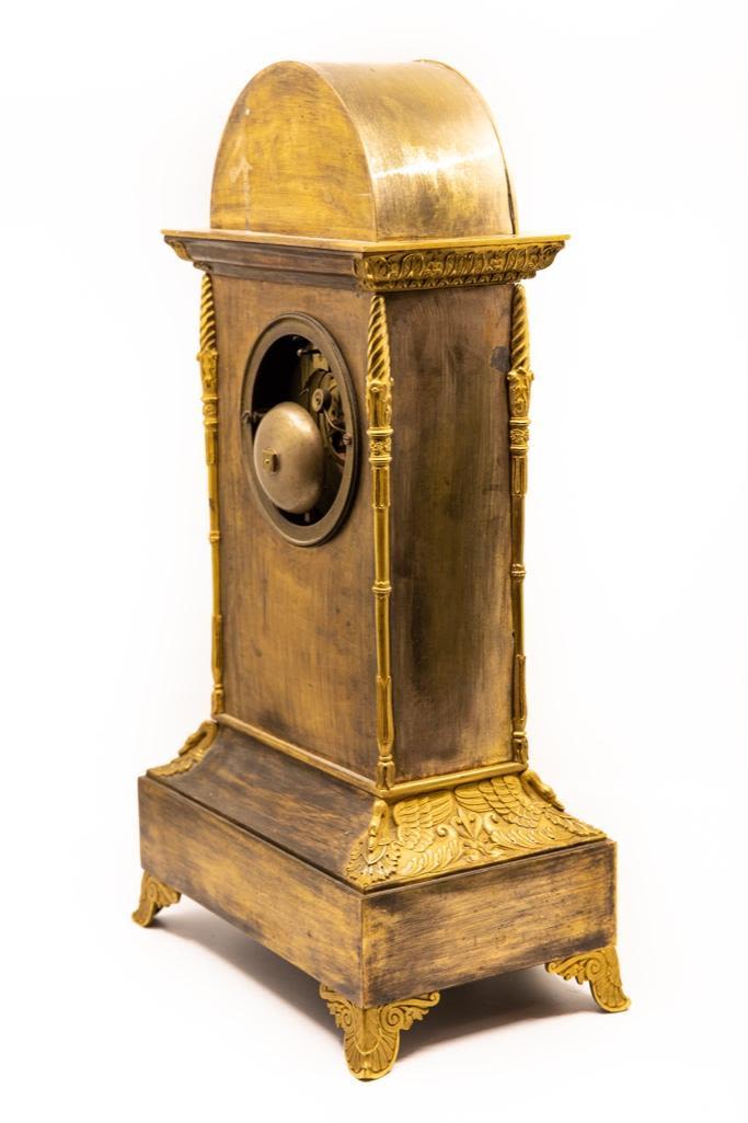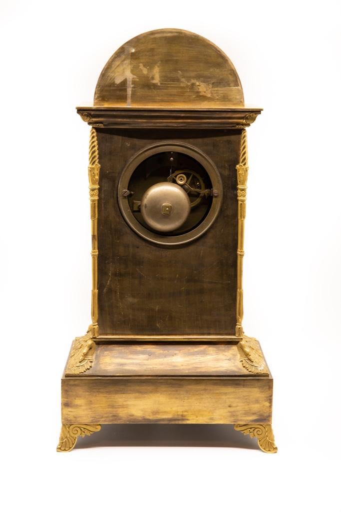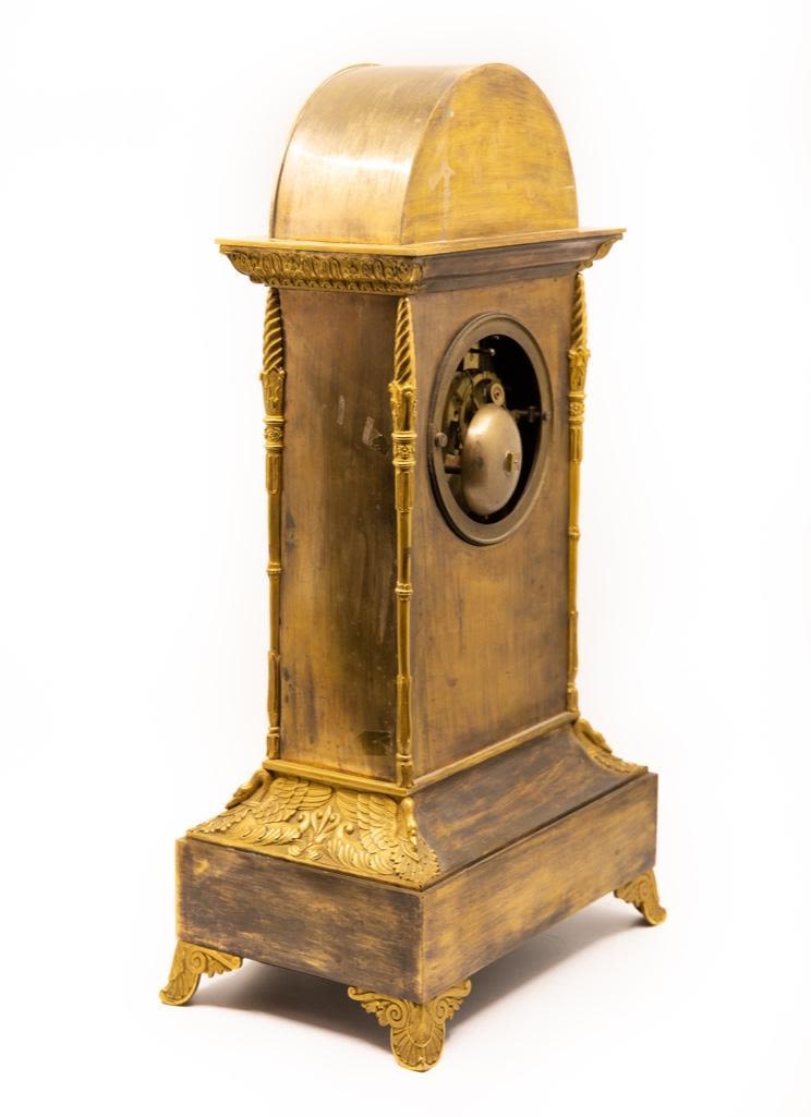 Frnch silk thread movement clock bronze with bas-relief allegorical scene with cupid bound to a statue and a maiden motif ormolu mantel clock, dial with painted Roman numerals, movement marked: "XB / 201," 19th century. 18.75 x 10.25" W x 6.5" D. Wear to painted numerals.