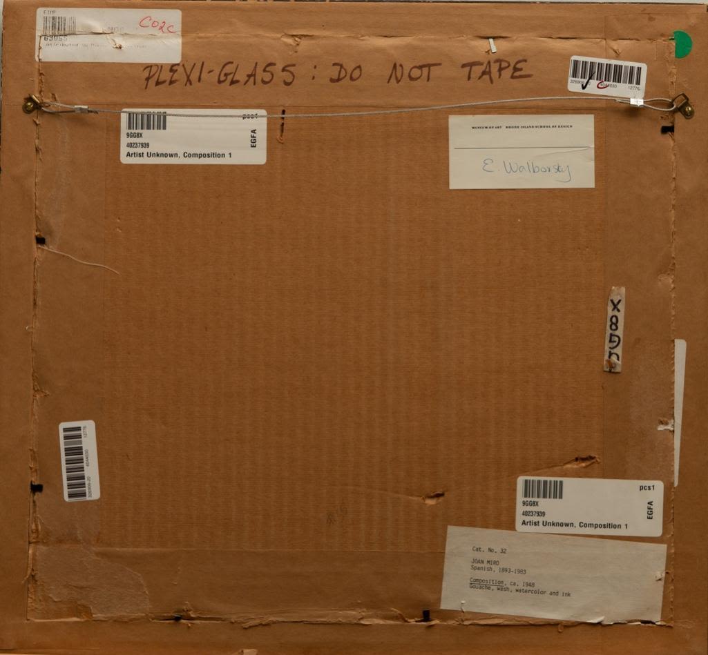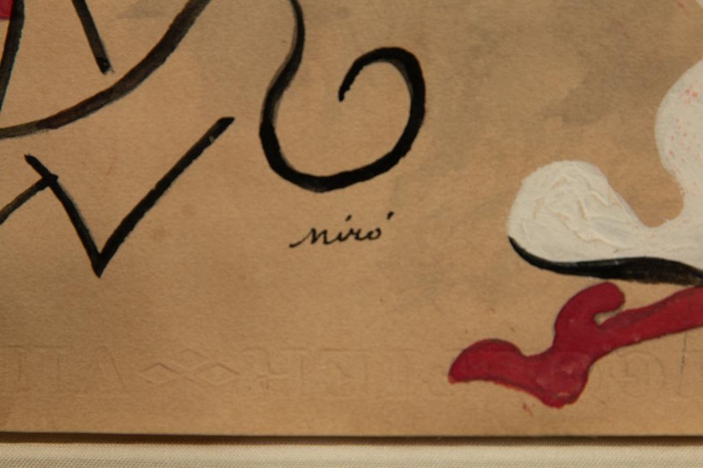 "Joan Miro" Gouache on paper. Label on verso: Art Rhode Island School of Design. Measures 10" x 10.5" Art, 18 x 19.5" Framed approx. Provenance: From the Estate of Emile Wolf