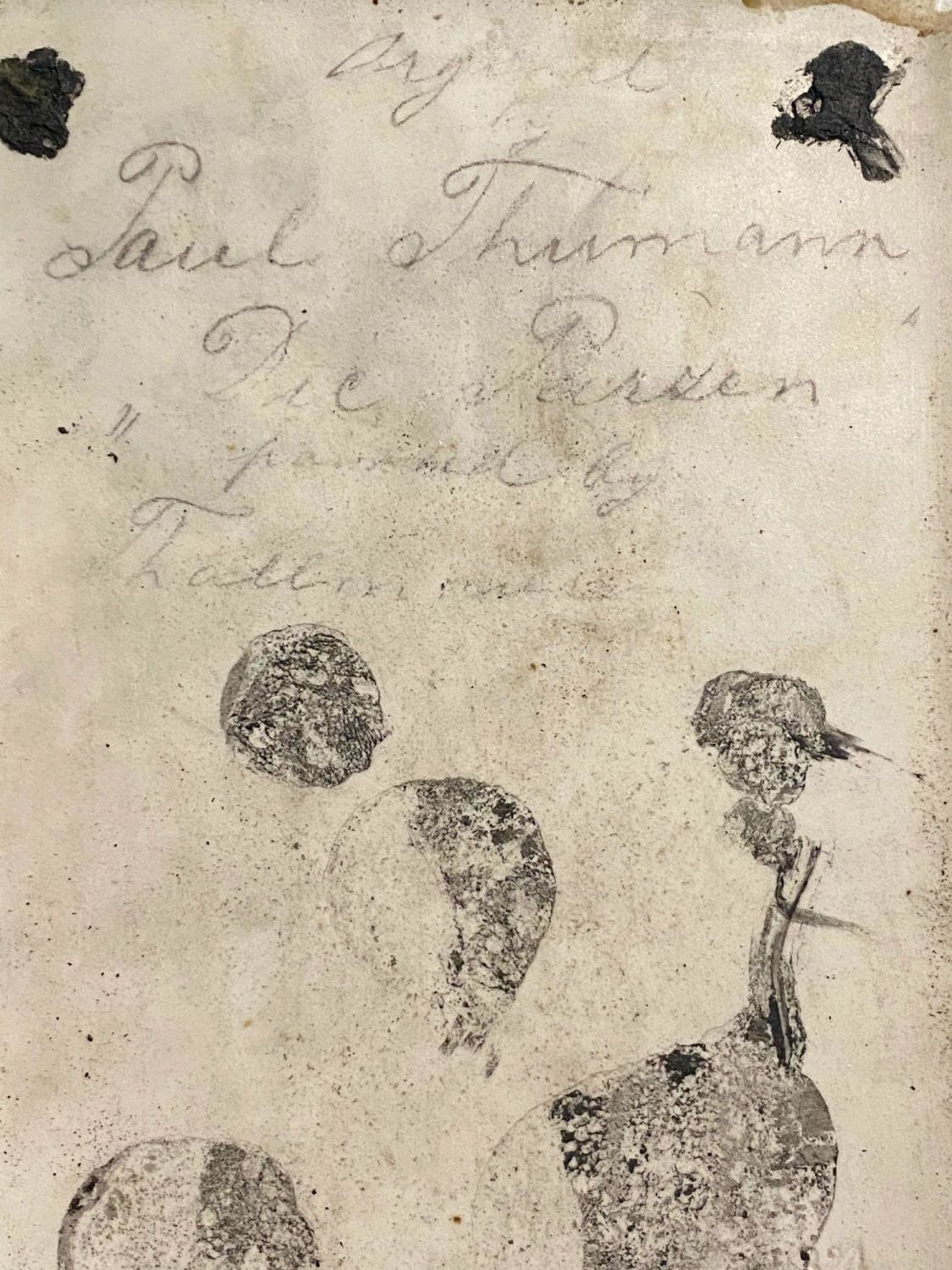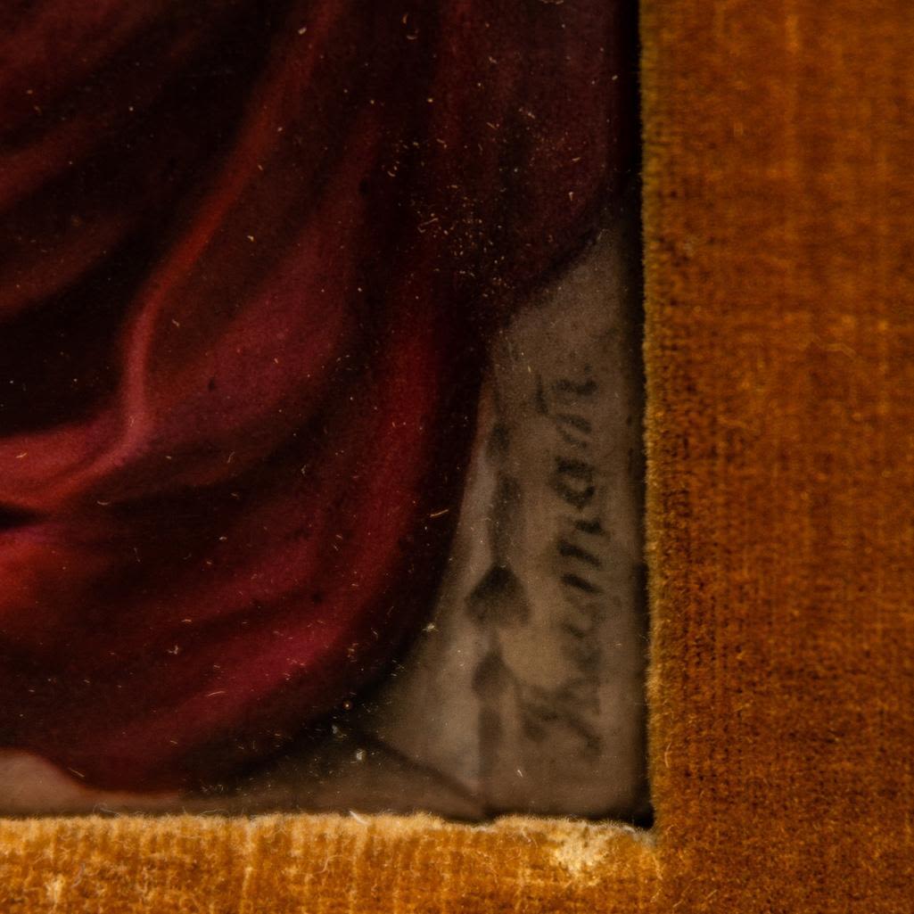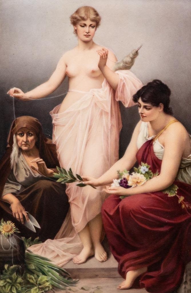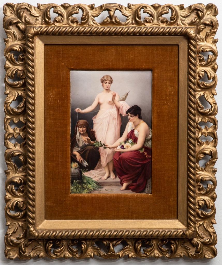Paul Thumann painted Porcelain Plaque "Three Fates". Impressed Number 324, Probably KPM, Inscriptions on rear of plaque. Signed. In gilded frame. Porcelain. Framed measures 17 1/2" h x 14 5/8" w x 2" d. Tile measures 9 1/4" h x 6 1/4" w.