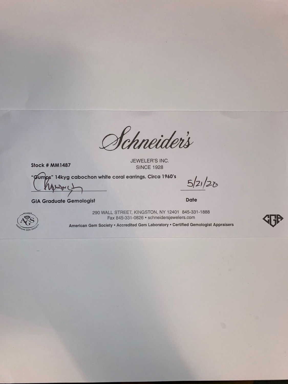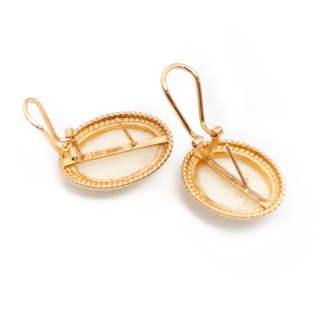 Gump’s 14k gold and cabochon white coral earrings. Gump’s, The earrings are marked "Gumps". Gumps was San Francisco’s most famous luxury store which filed for bankruptcy and closed its Post Street store last year after 157 years in the city .The earrings measure approximately 1.25" and apporx 6.4 dwt. This lot is accompanied by a GIA appraiser letter from an independent and well respected firm established over 75 years ago.