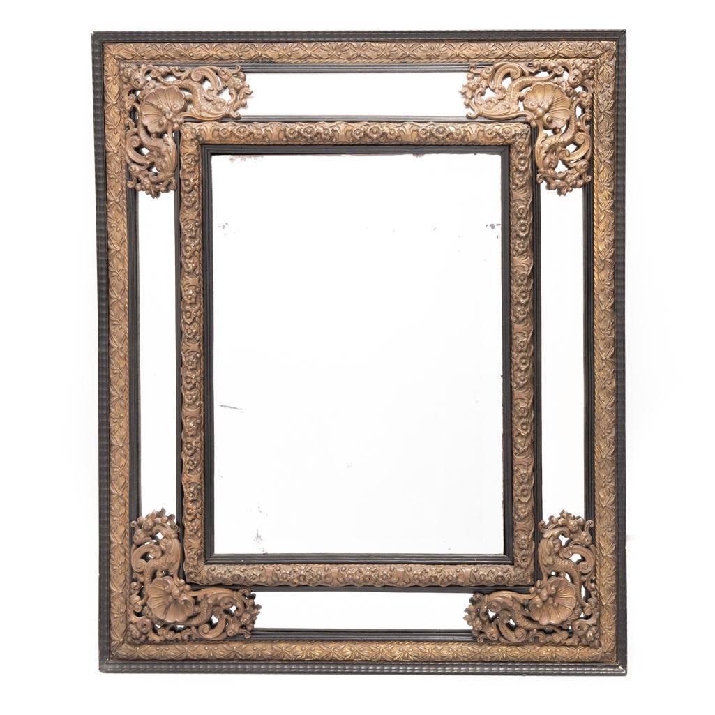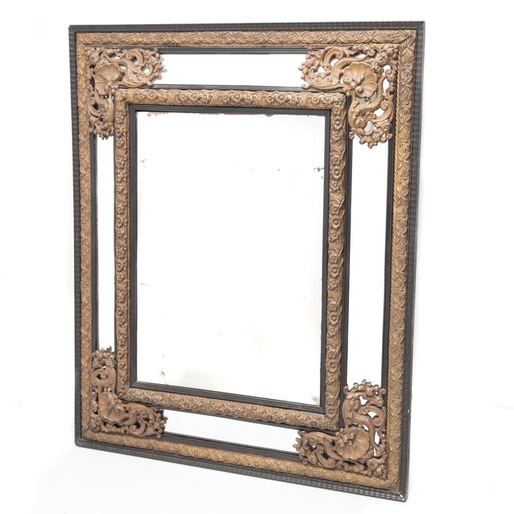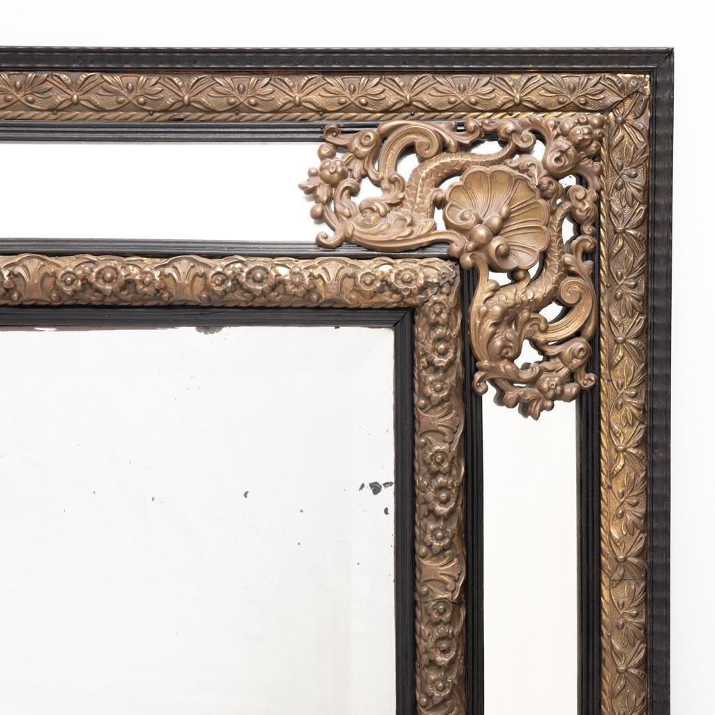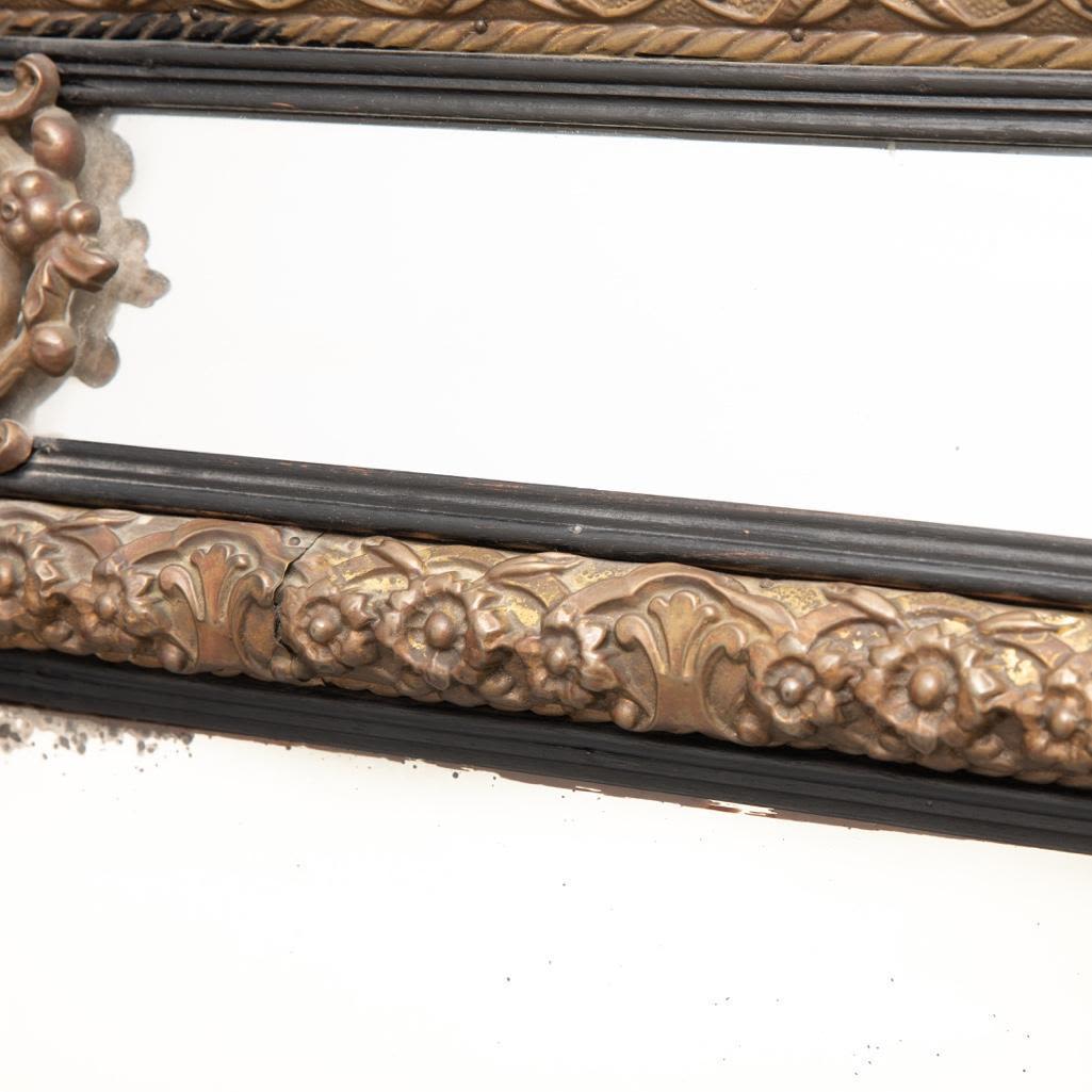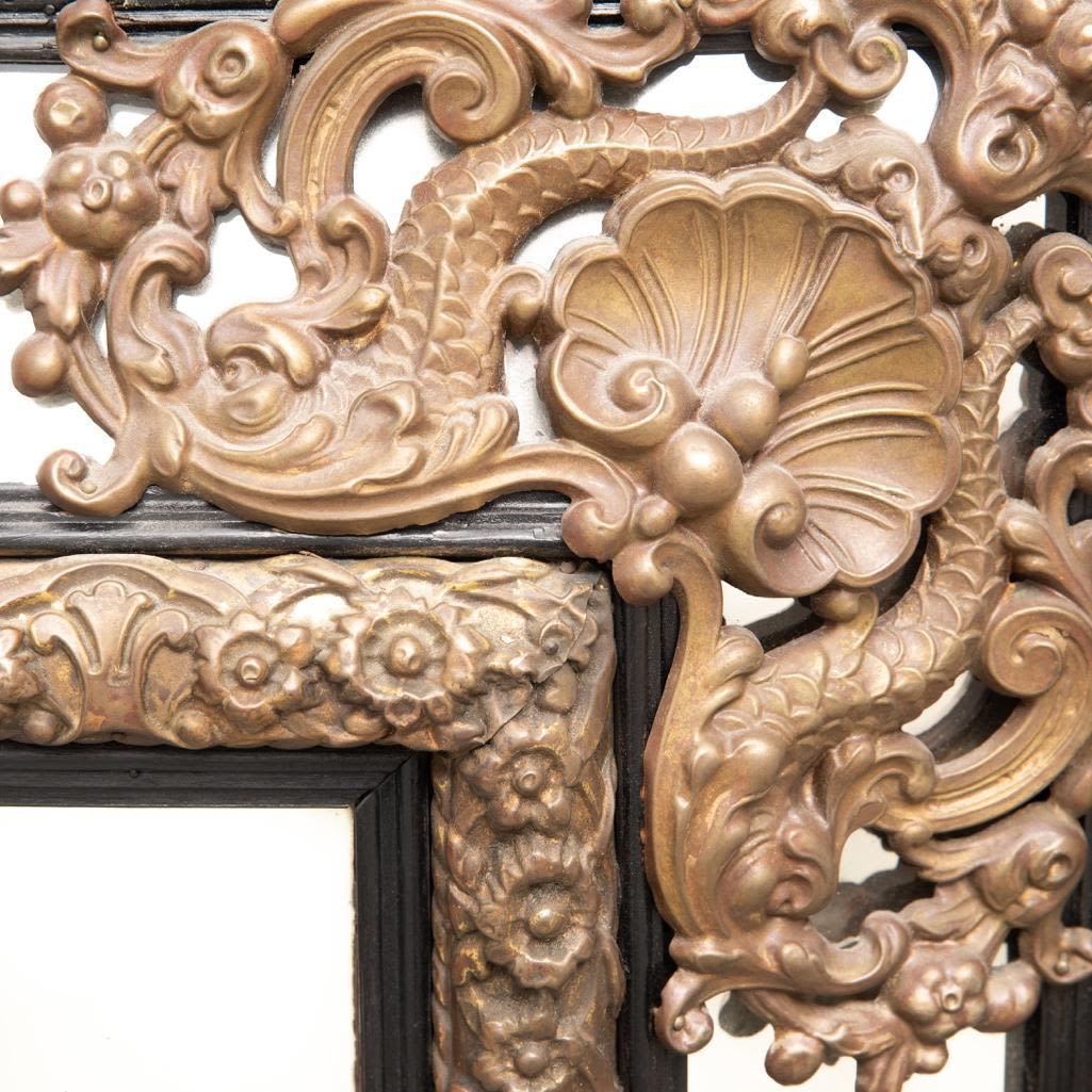 Victorian mirror brass ornate repousse work Baroque Revival circa 1890 with beveled glass. 34 5/8"W x 41 5/8"H