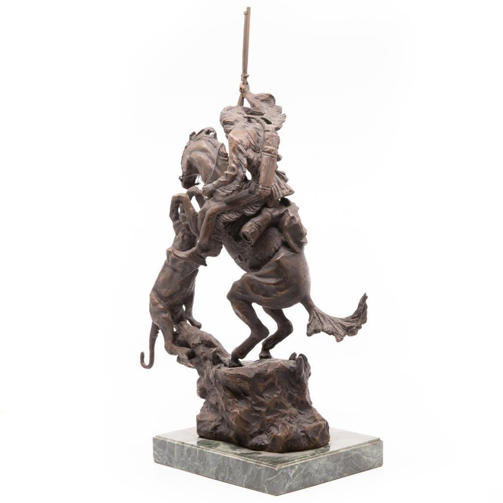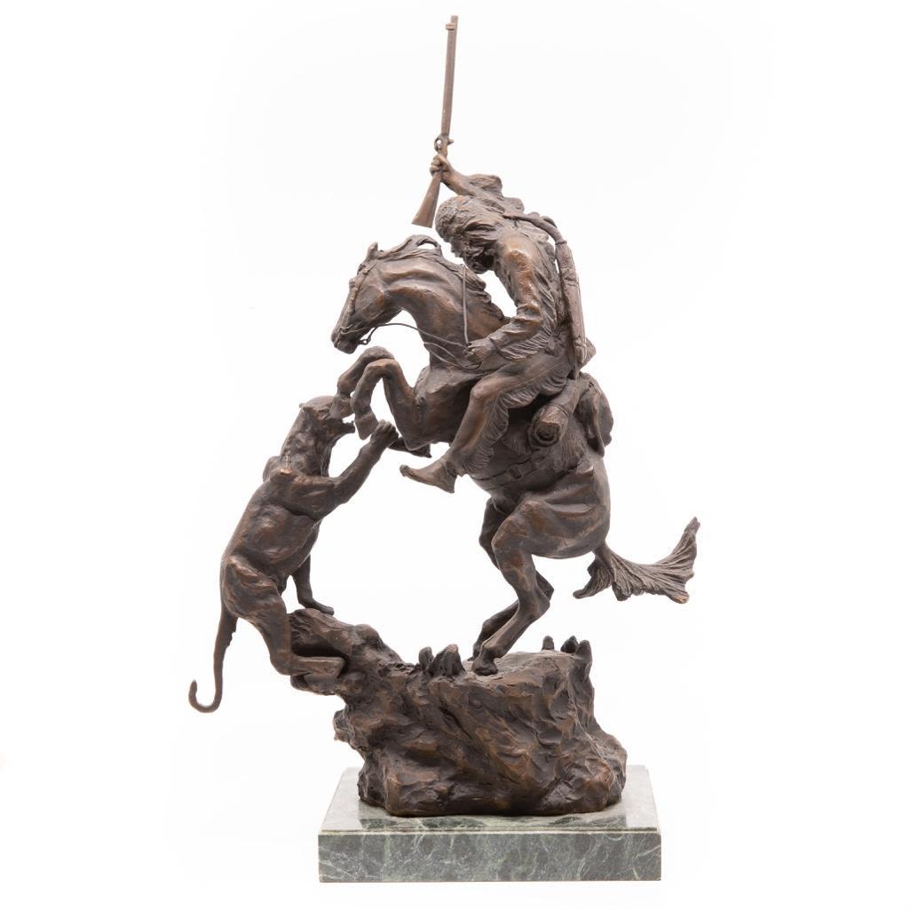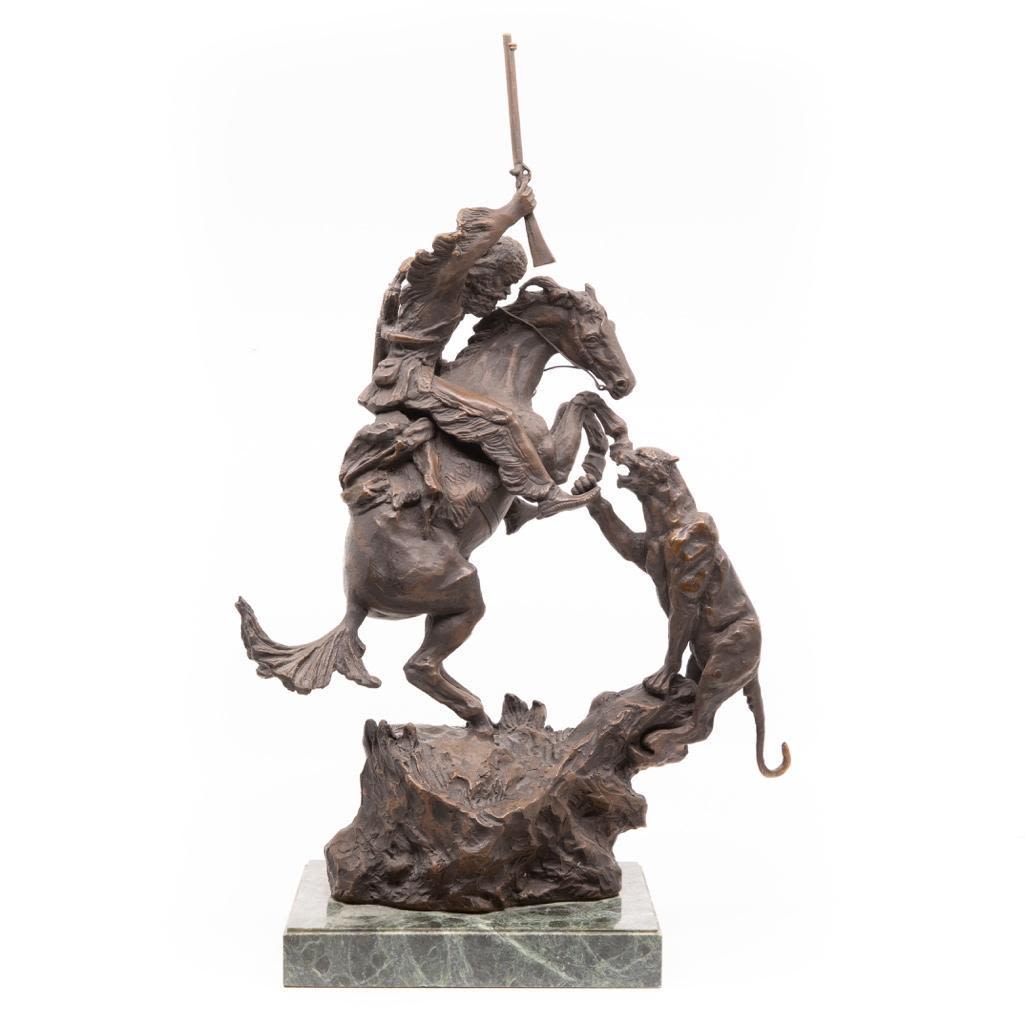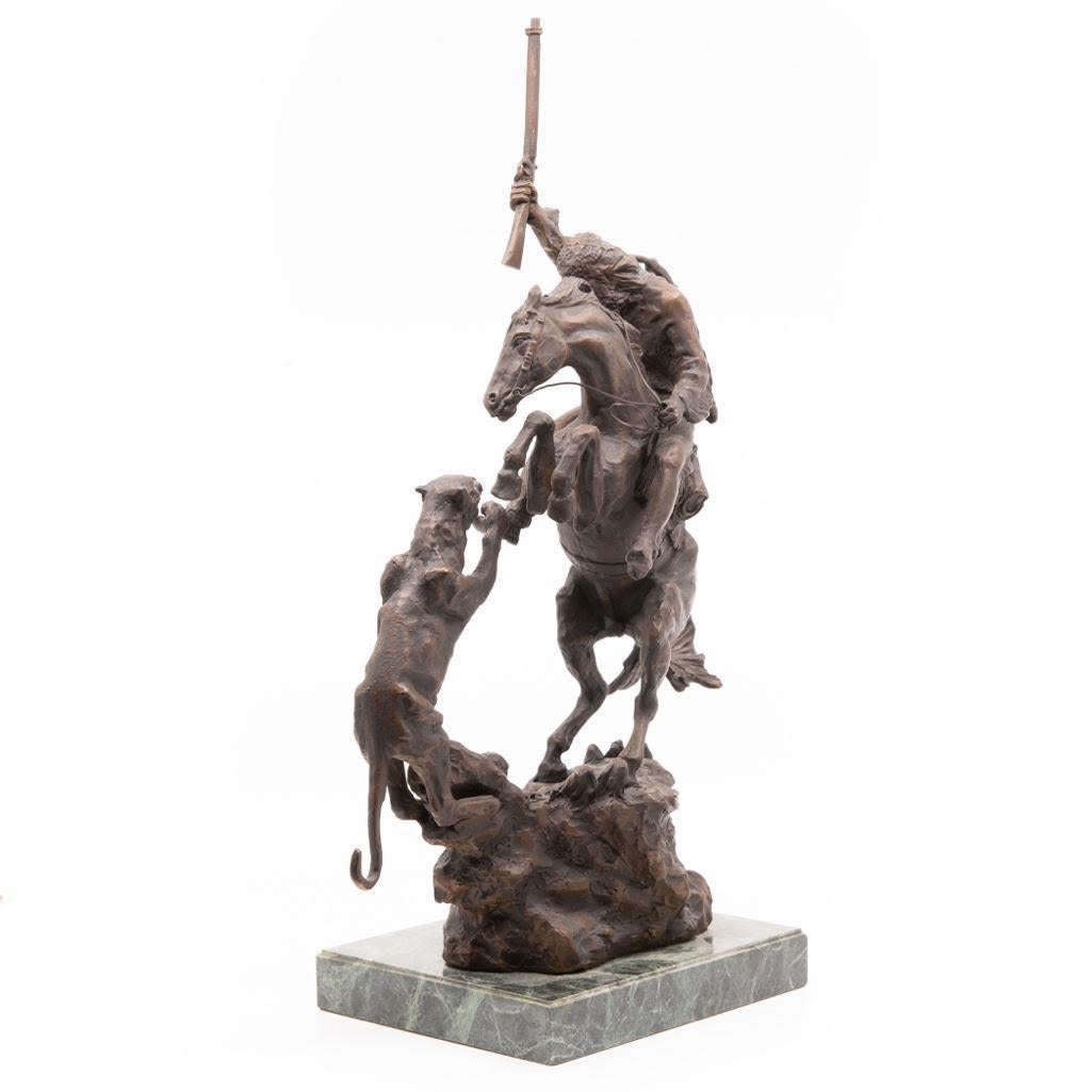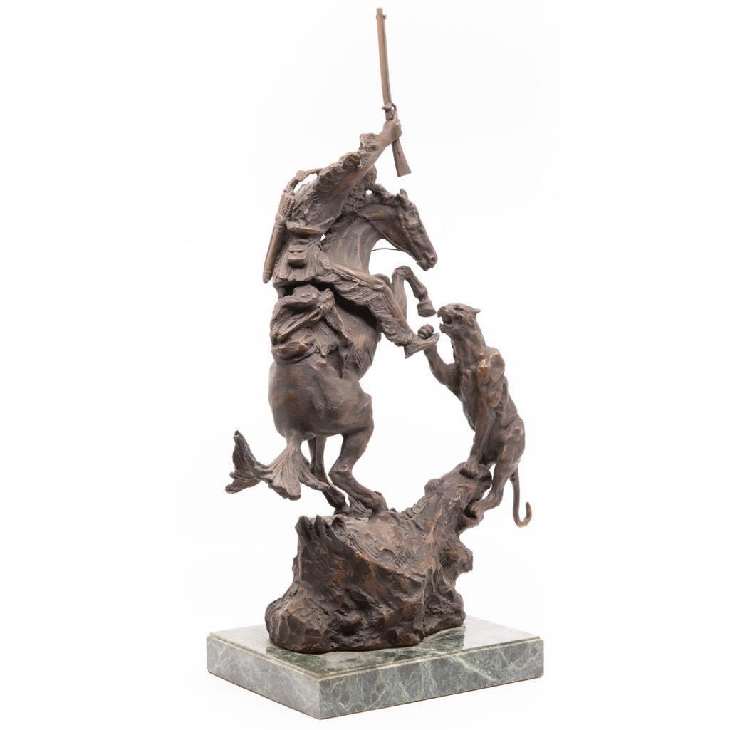 Charles M. Russel bronze depicting a frontier man with attacking cougar. The Bronze measure 18"H x 11"L x 6"H