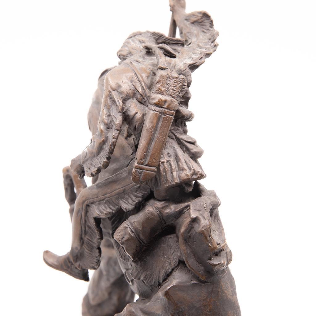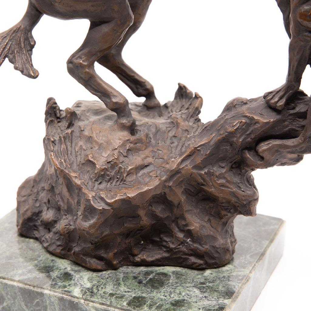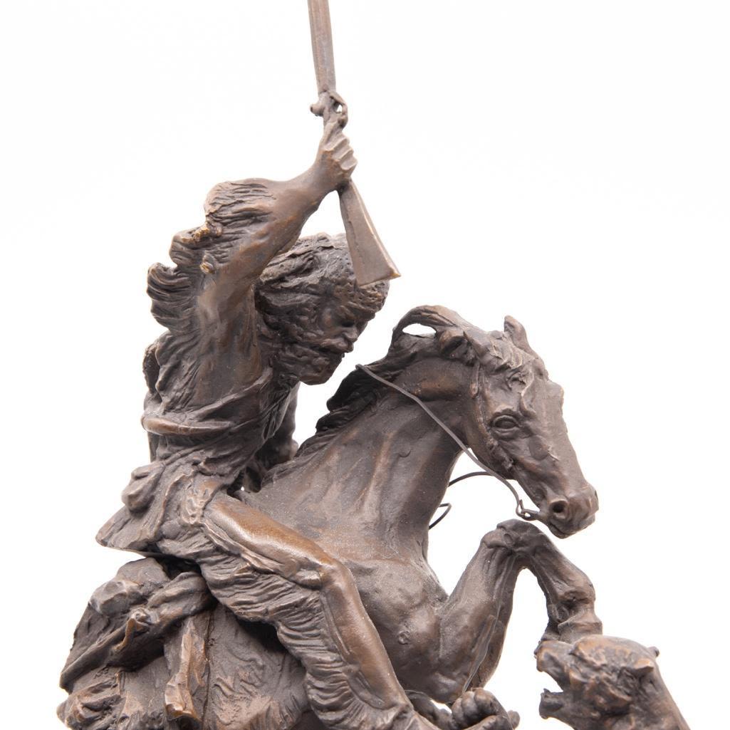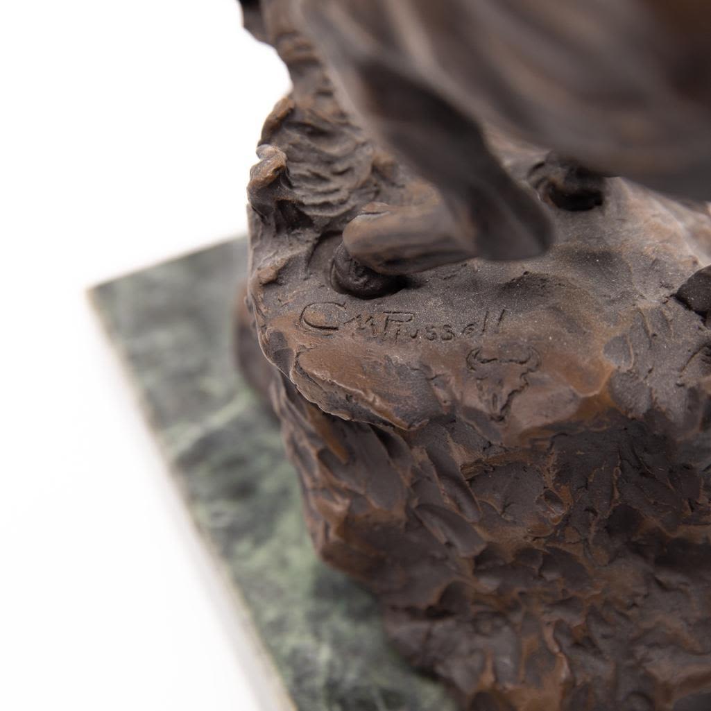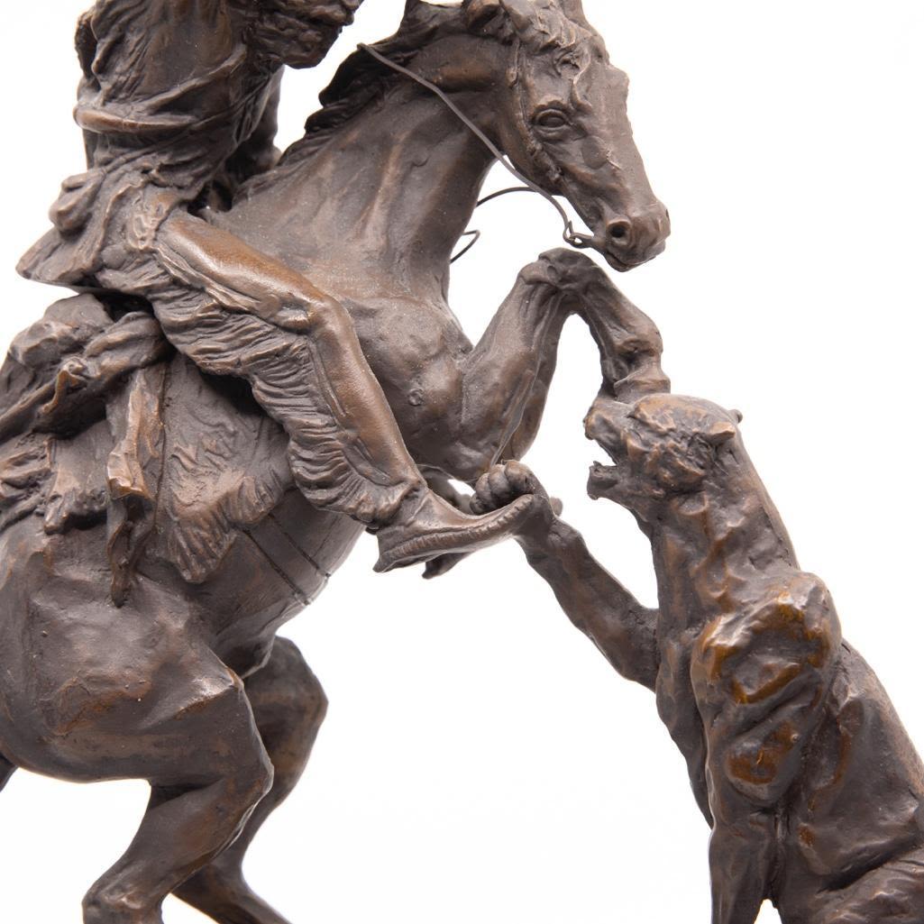 Charles M. Russel bronze depicting a frontier man with attacking cougar. The Bronze measure 18"H x 11"L x 6"H