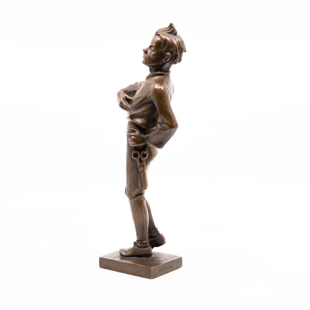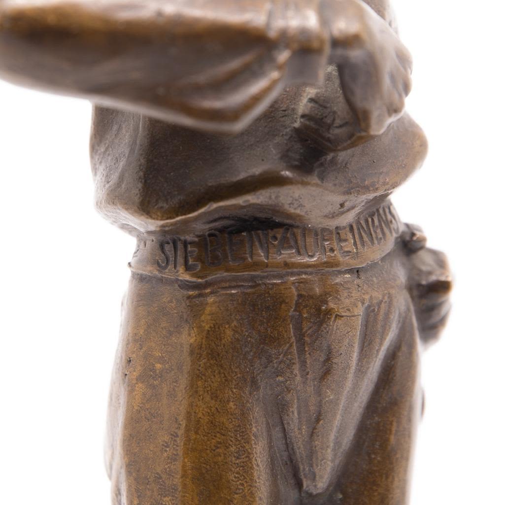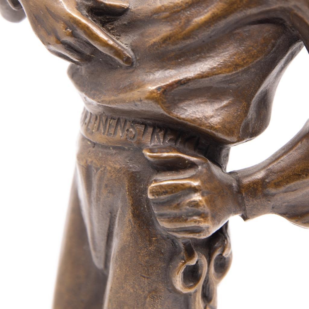 Bronze figure of the “Brave Little Taylor” from Grims Fairytale. His belt inscribed “Sieben auf einen strich” which translates to 7 In One Blow. The brave little tailor kills seven flies with one blow, and manages to convince both giants and kings that he is indeed a force to be reckoned with. The hero in this story by the Brothers Grimm is armed with whit, cunning and a sense of humour. He conquers all before him, including a giant, a unicorn, and a princess. Measures 12”H