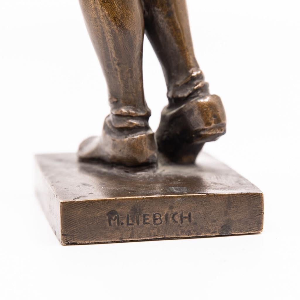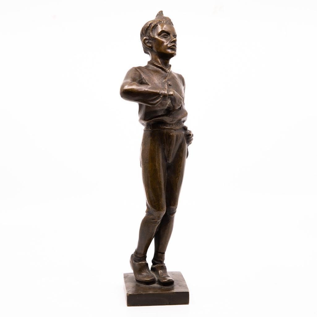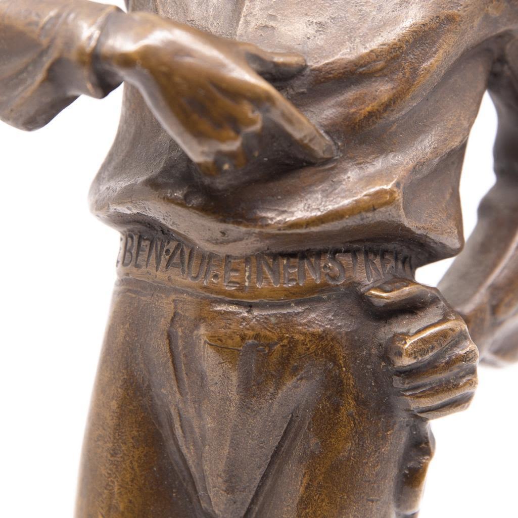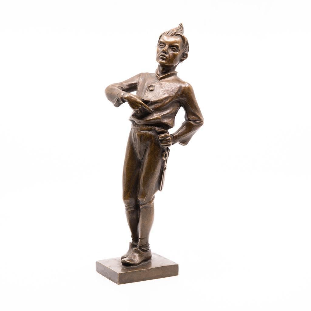Bronze figure of the “Brave Little Taylor” from Grims Fairytale. His belt inscribed “Sieben auf einen strich” which translates to 7 In One Blow. The brave little tailor kills seven flies with one blow, and manages to convince both giants and kings that he is indeed a force to be reckoned with. The hero in this story by the Brothers Grimm is armed with whit, cunning and a sense of humour. He conquers all before him, including a giant, a unicorn, and a princess. Measures 12”H