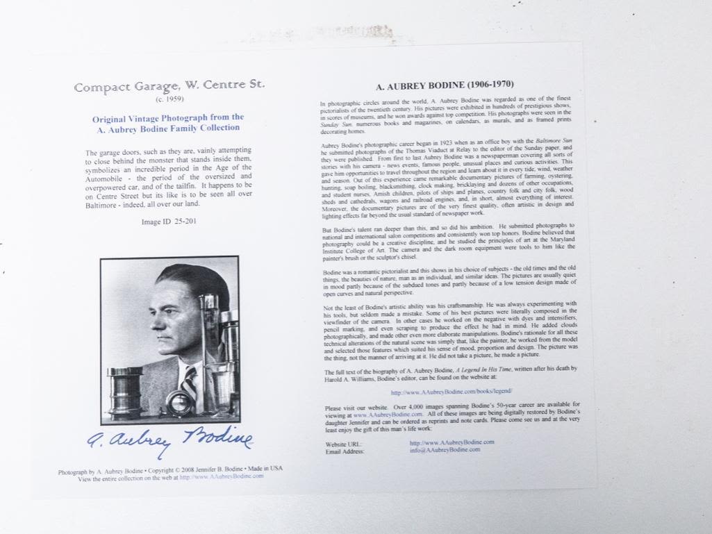 Gelatin silver print, signed "A. Aubrey Bodine" lr, Compact Garage, W. Centre St. photographer stamp on verso, 11 x 14 in., unframed
