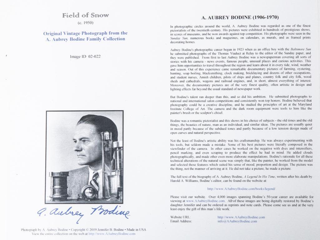 A. Aubrey Bodine, "Field of Snow" circa 1959, gelatin silver print, signed "A. Aubrey Bodine" lr, photographer stamp on verso, 11 x 14 in., unframed