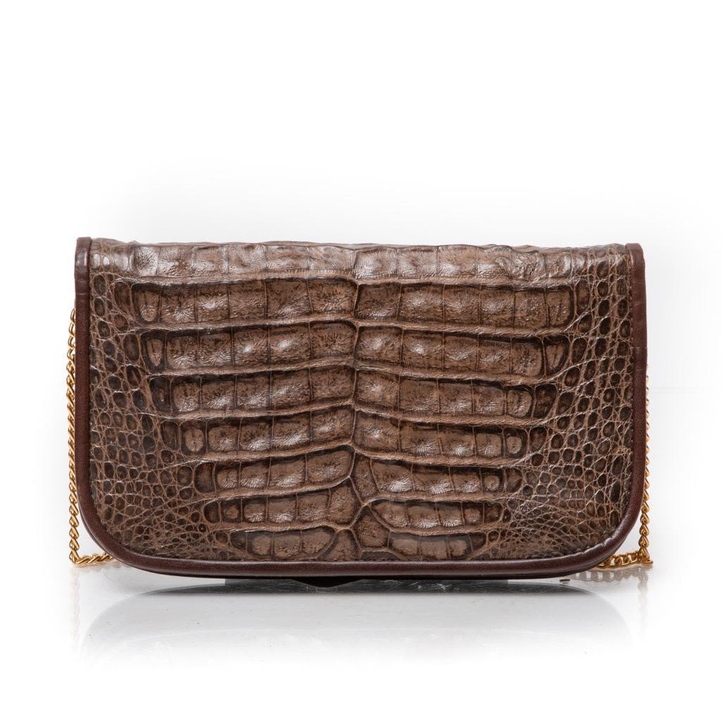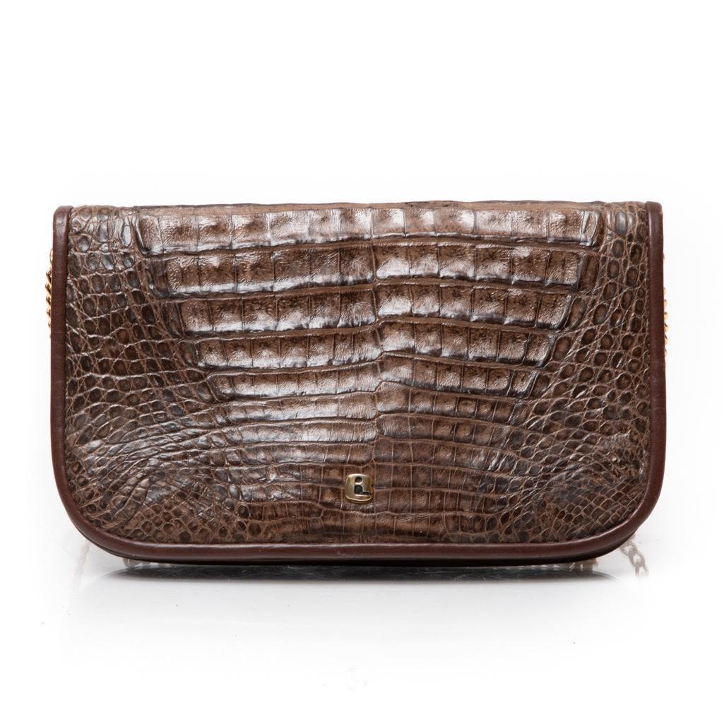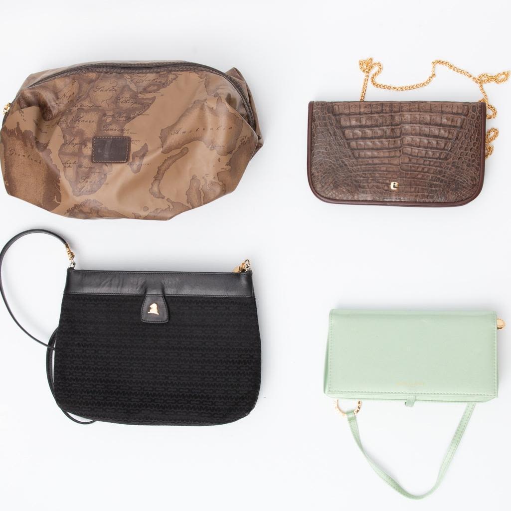 4 Bags including a Vintage Faux Crocodile leather bag, a Bvlgari hand bag, Mark Cross bag and a Latrine World Map Bag by Alviero Martini. Erelle Faux Crocodile bag Measures 8"W x 5"H Approx. The Alviero Martini bag measures 13"W x 6.5"H approx. The Mark Cross Bag Measures 10’W x 7"H. The Bvlgari bad measures 8"W x 4.5’h Approx