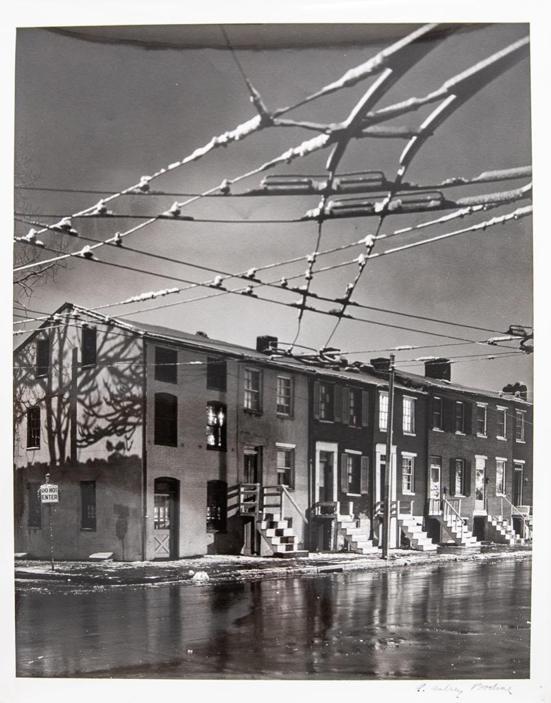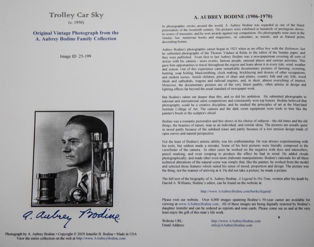 A. Aubrey Bodine" , "Trolly Car Sky" Circa 1950 Gelatin silver print, signed "A. Aubrey Bodine" lr, photographer stamp on verso, 14 x 11 in., unframed