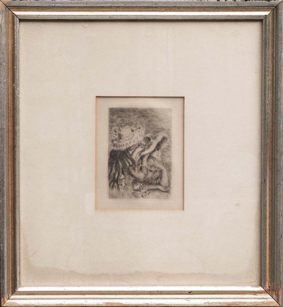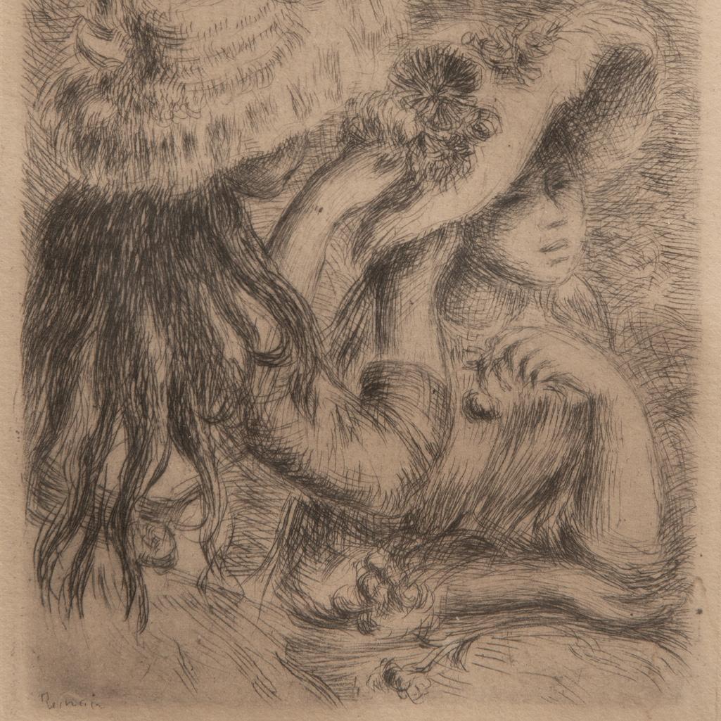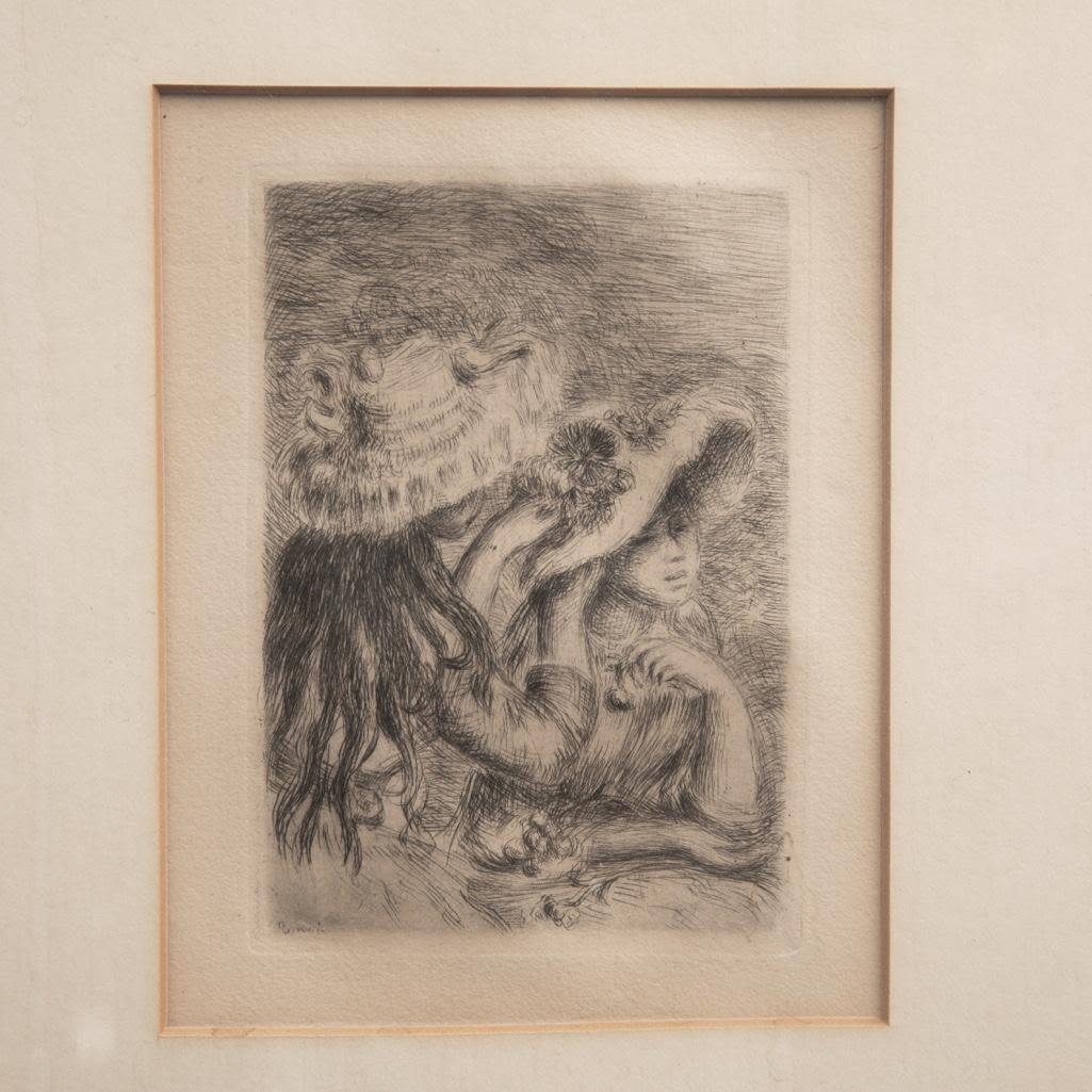 Antique Pierre Auguste Renoir Etching of Women with Hats. Measures 5.5"H x 4.25"W. An innovative artist, Pierre-Auguste Renoir started out as an apprentice to a porcelain painter and studied drawing in his free time. After years as a struggling painter, Renoir helped launch an artistic movement called Impressionism in 1870s. He eventually became one of the most highly regarded artists of his time.