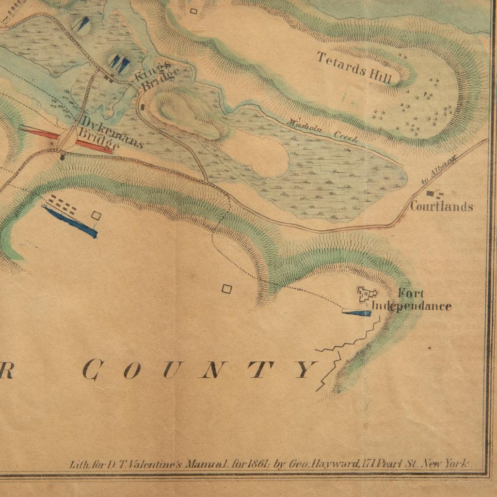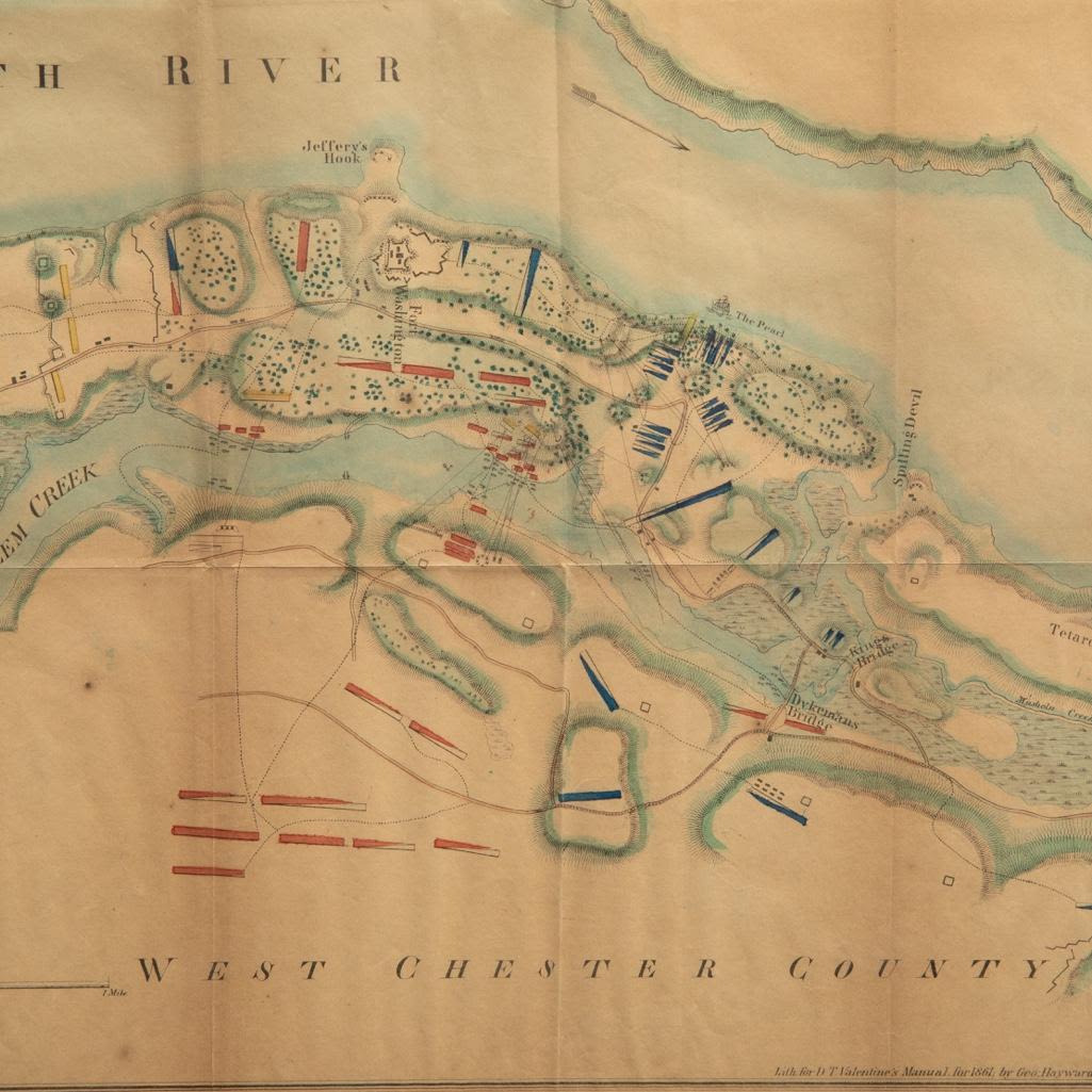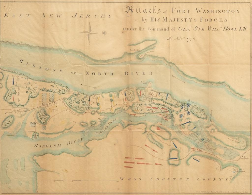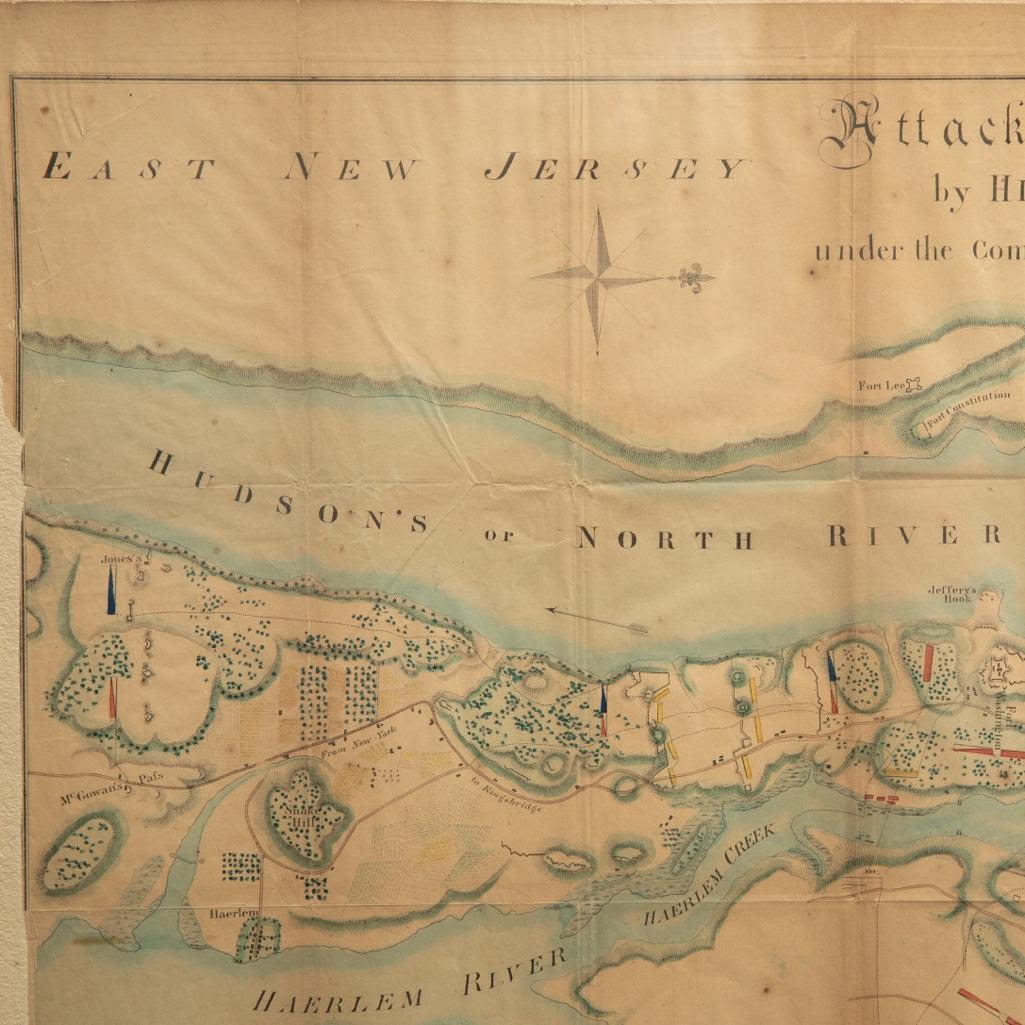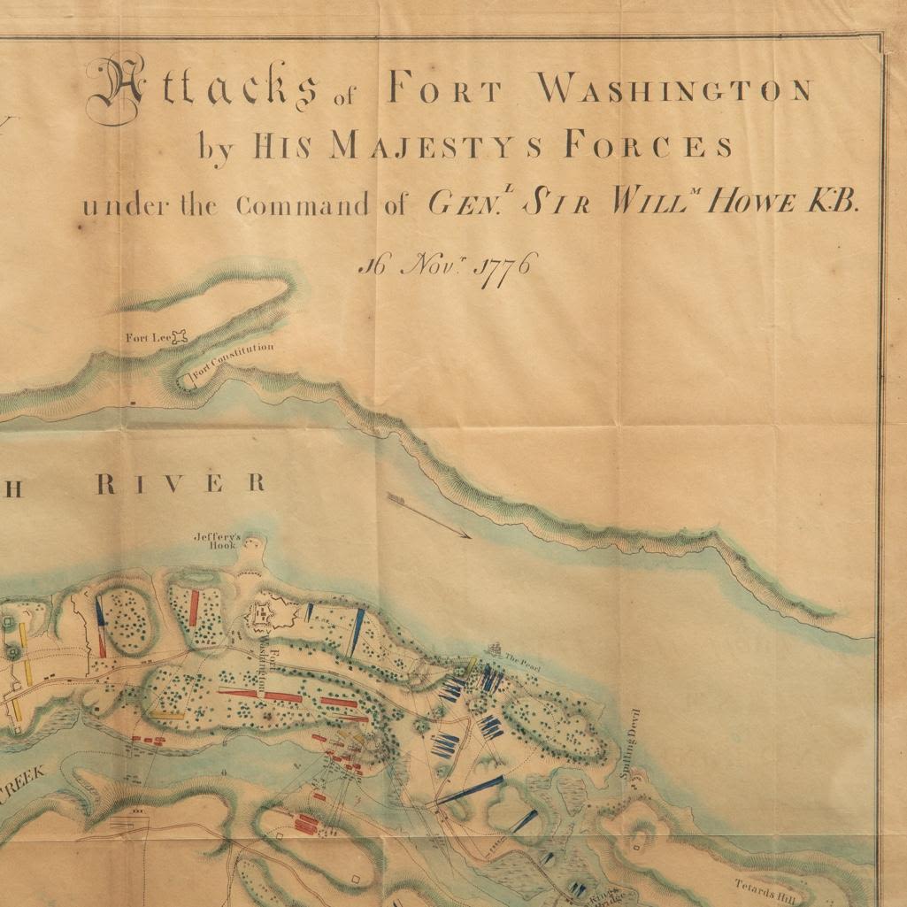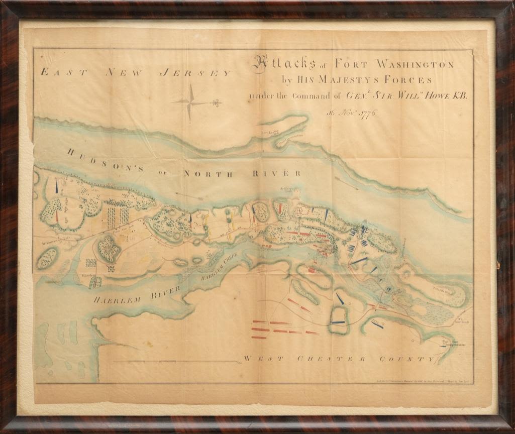 American revolutionary war mapping depicting the November 1776 attacks at Fort Washington, New York by British Forces Under General Sir William Howe. The map was printed in 1861 and enhanced with hand watercolor painting. 25.5" x 21.5" in frame, 22.5" x 18" without frame