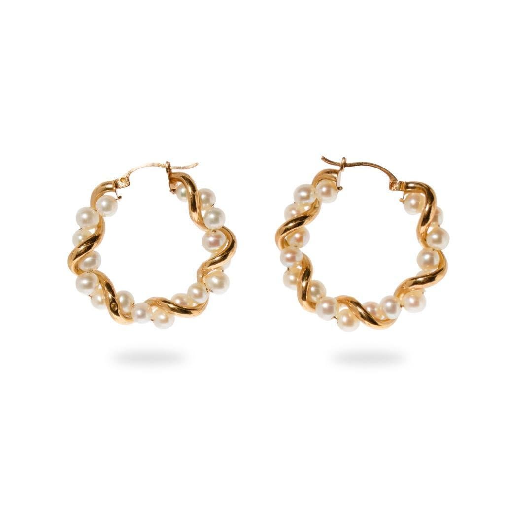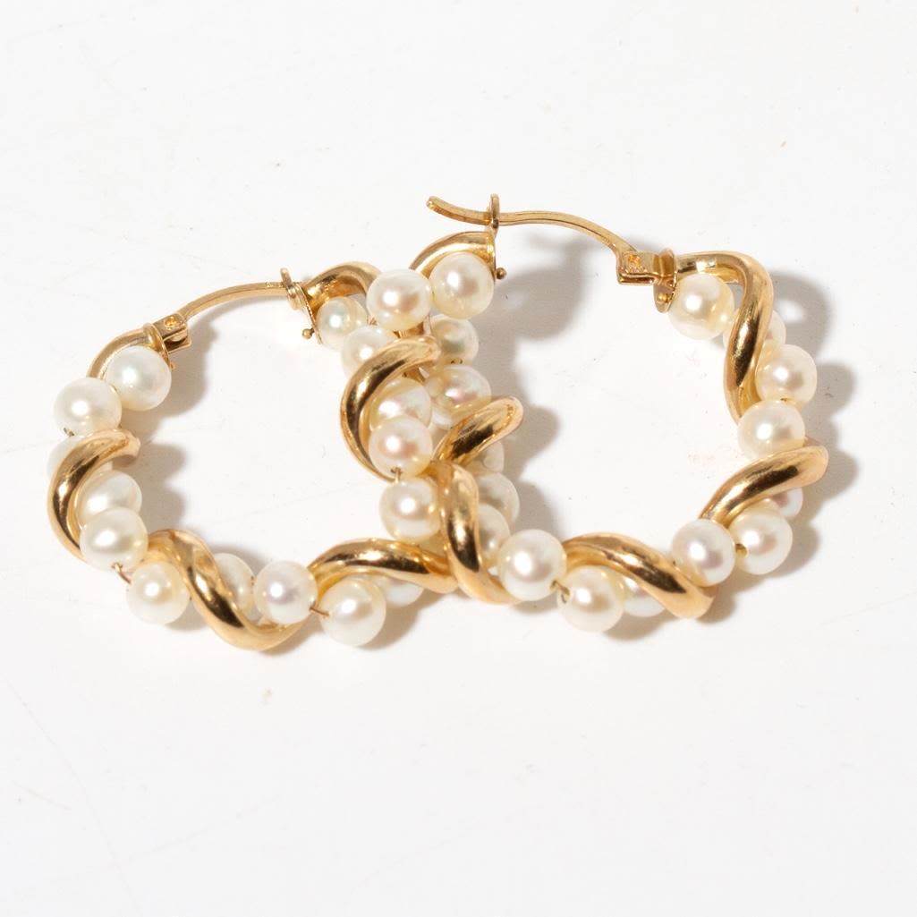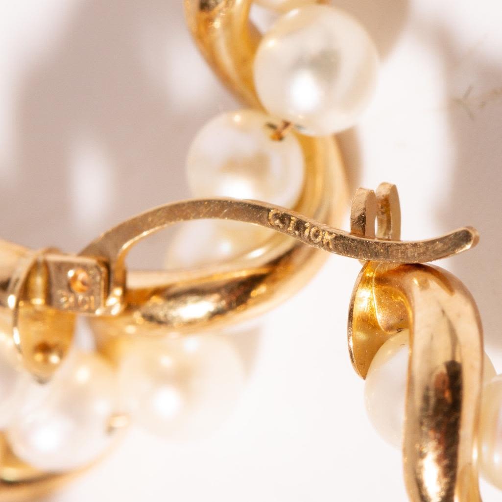 Vintage mid-century modernYellow gold frame hoop earrings bearing 17 intertwined round pearls with snap down clasps, marked "C.I. ." Approx: 1.125" diameter. Pearls approx: 4mm diameter. Approx: 3.2 dwt inclusive.
