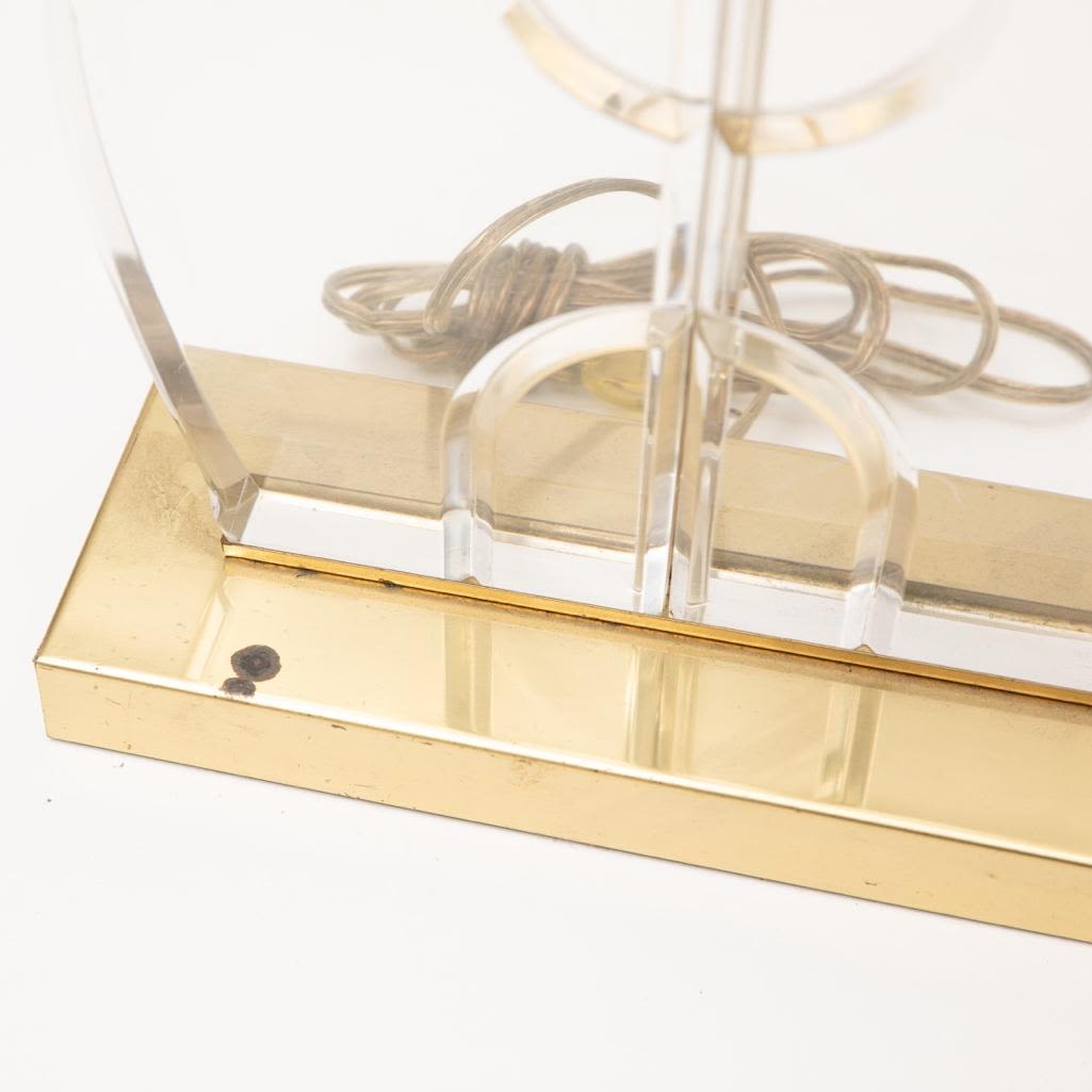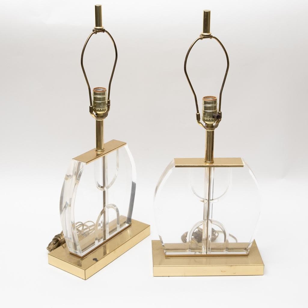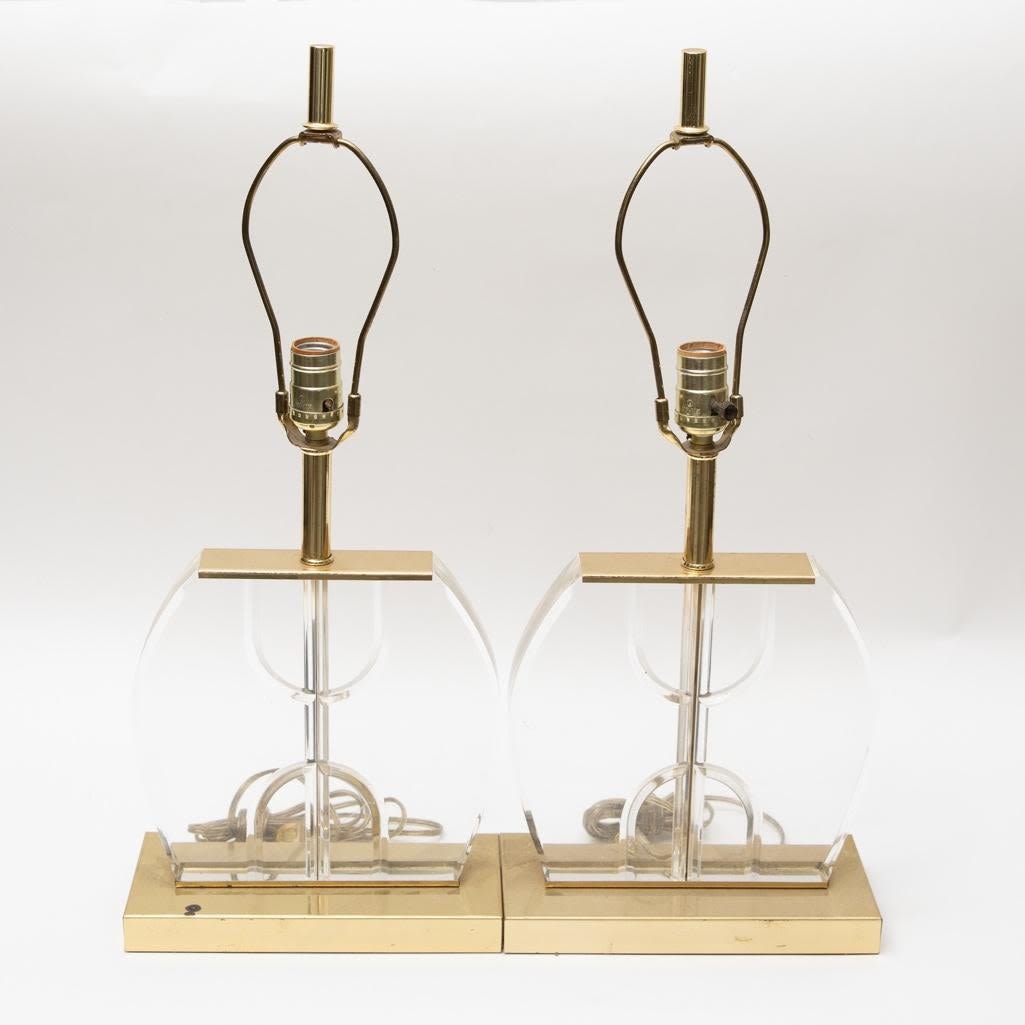Pair of modern Lucite and brass table lamps, sculptural Lucite bodies over rectangular base, circa 1970s. 24" H x 10" W x 4.5" D.