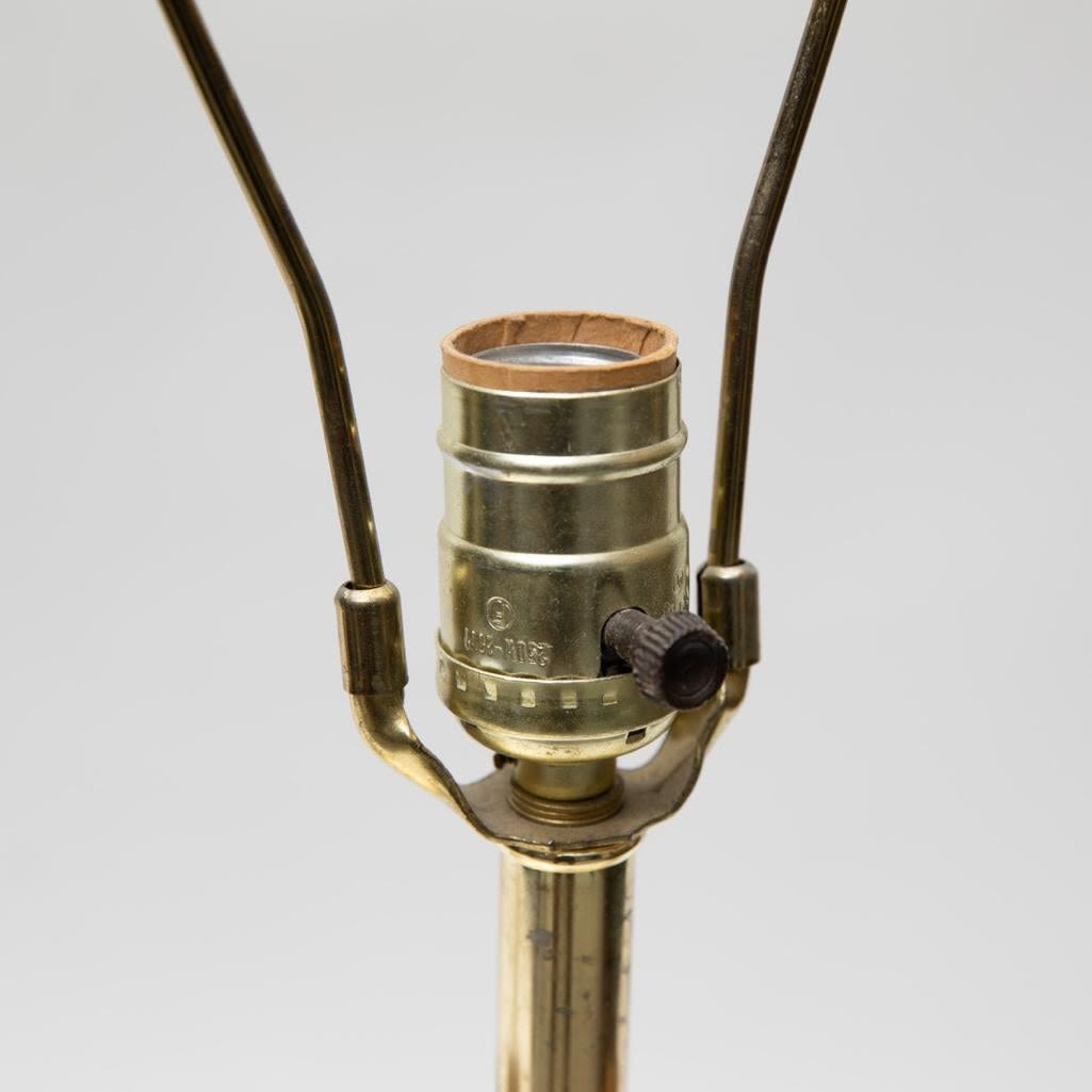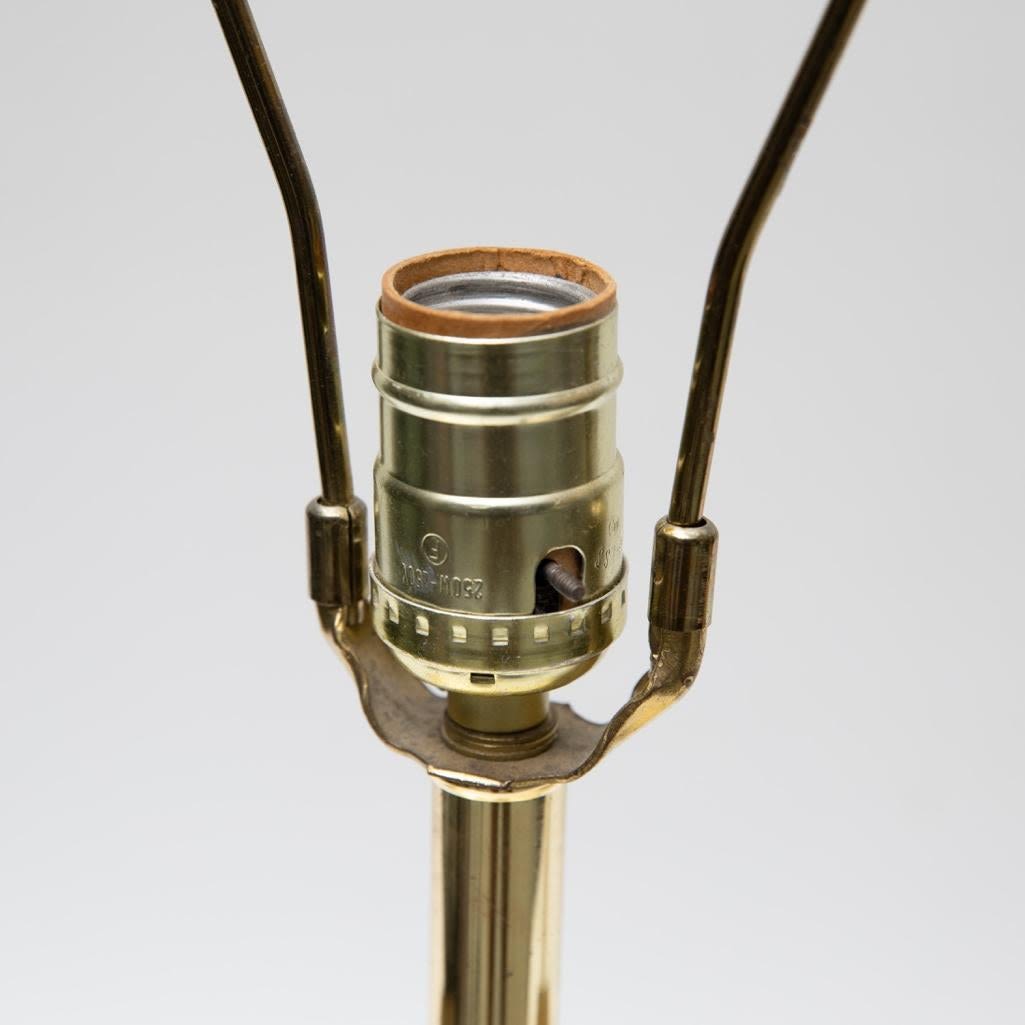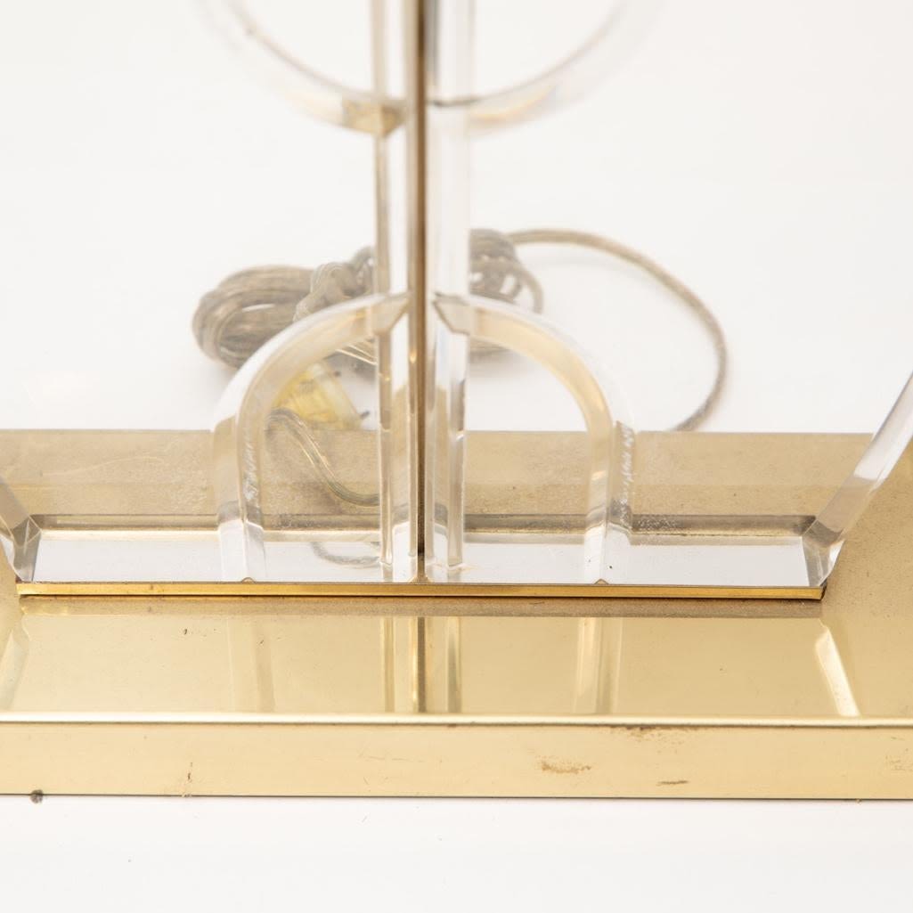 Pair of modern Lucite and brass table lamps, sculptural Lucite bodies over rectangular base, circa 1970s. 24" H x 10" W x 4.5" D.