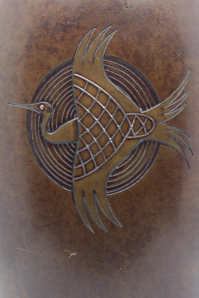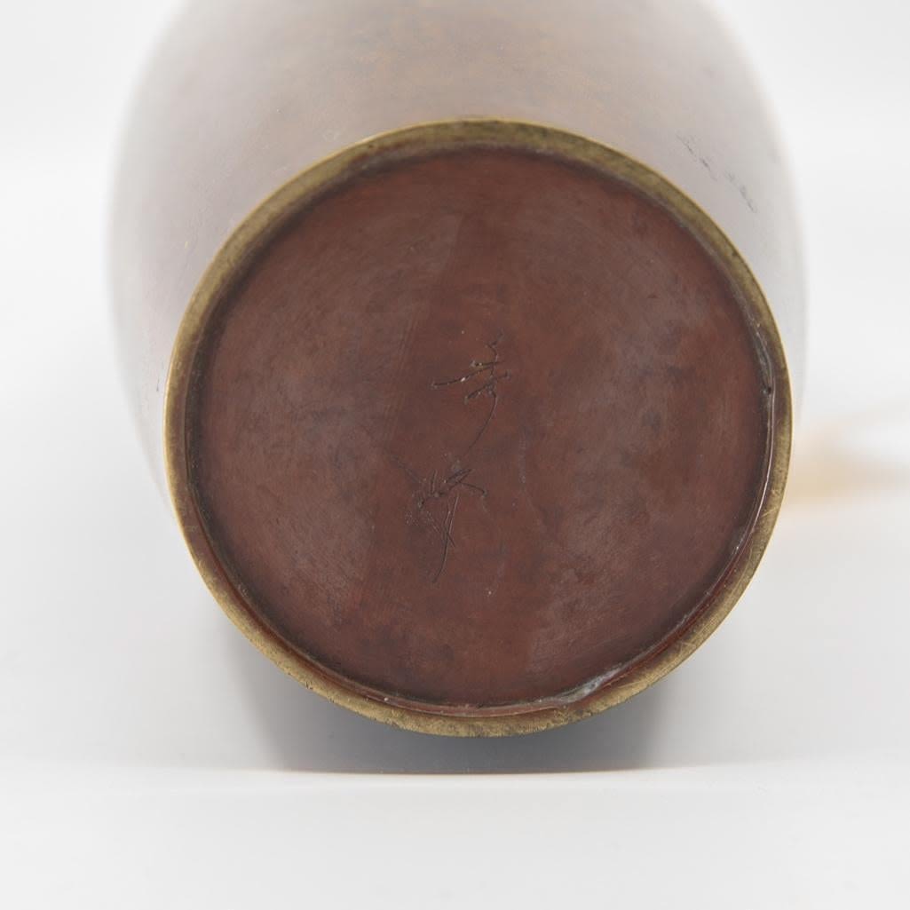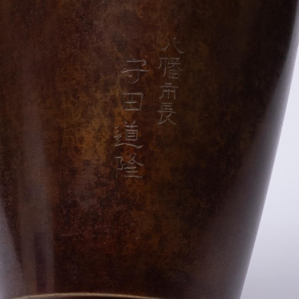 Japanese Meiji Bronze vase inlaid with silver, signed and with poem inscribed 9.5" high approx