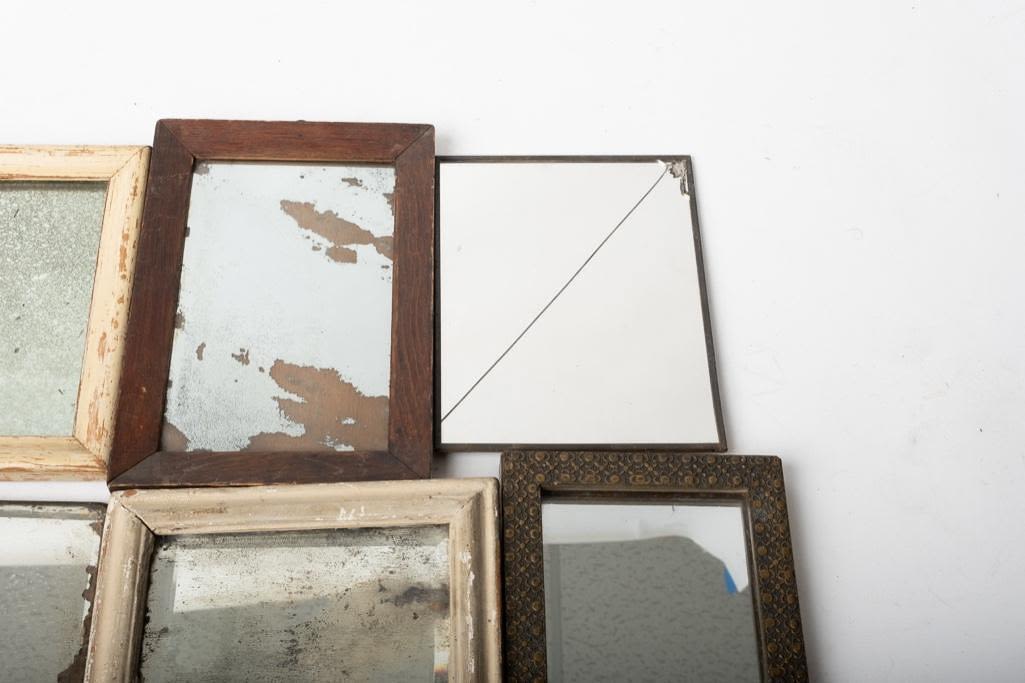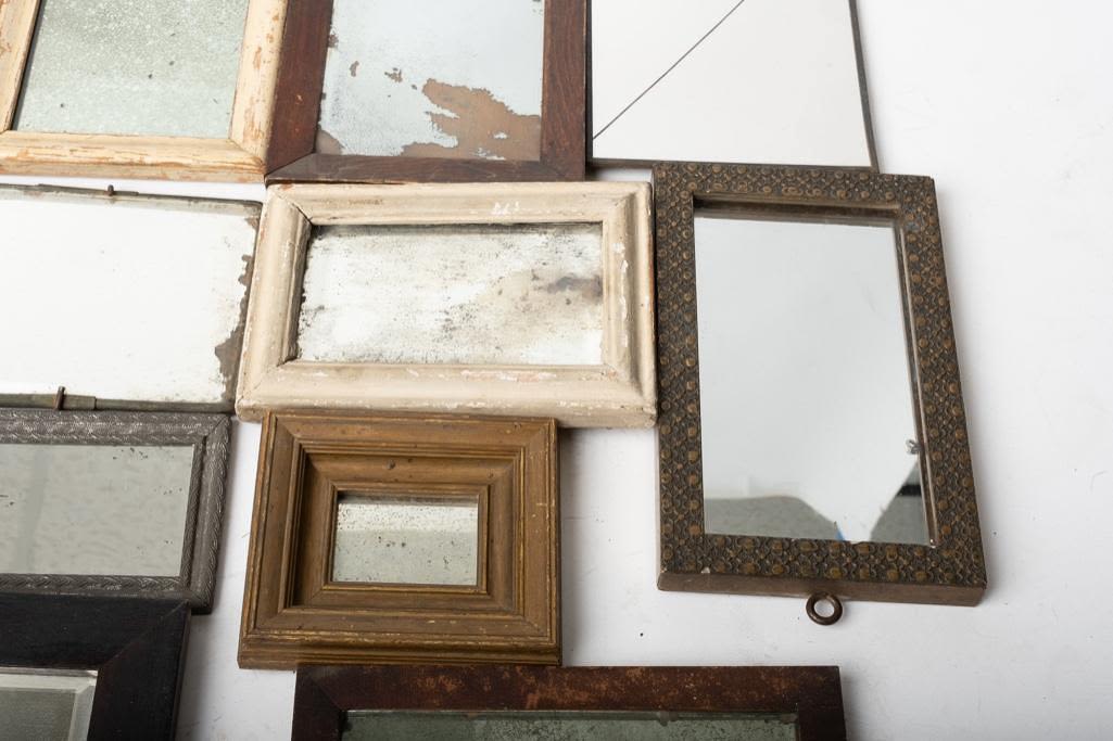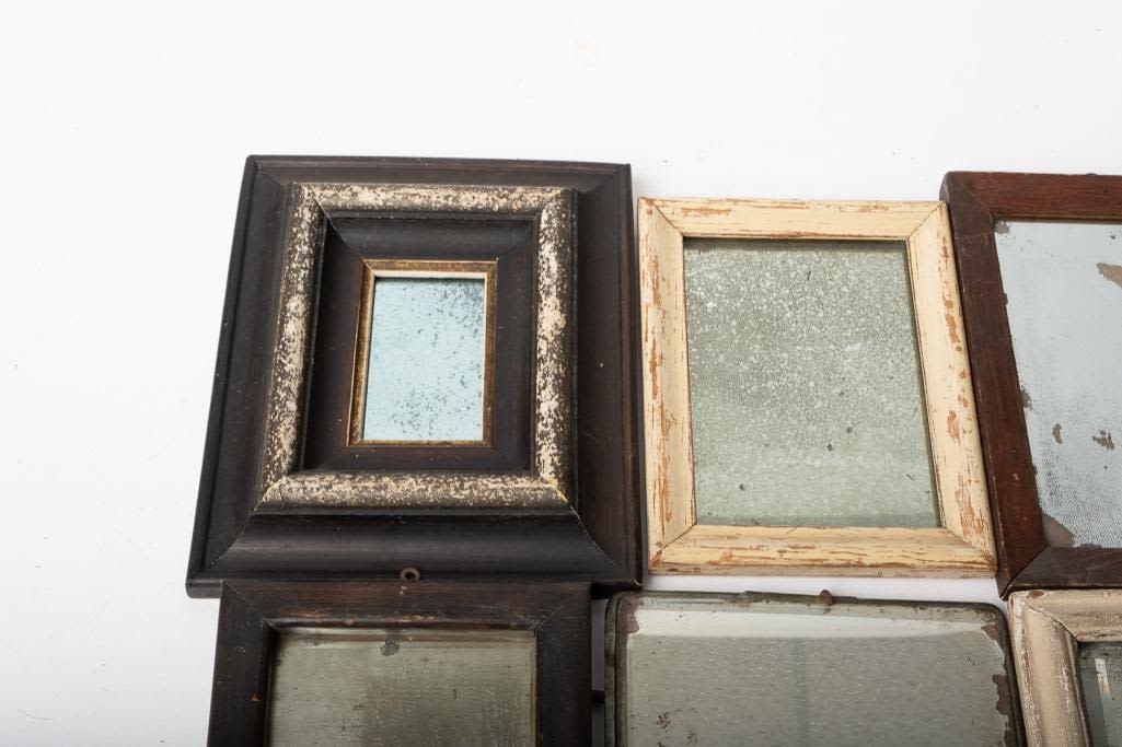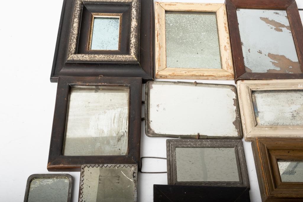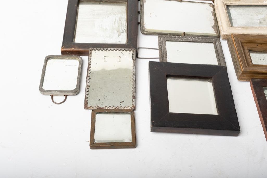 15 Antique Mercury Mirrors late 19th century. Beautiful Characteristics. Please see photos for condition. Some crackled visible and spotting. Heavy use. Largest Frame measures 9.25"H x 8"W