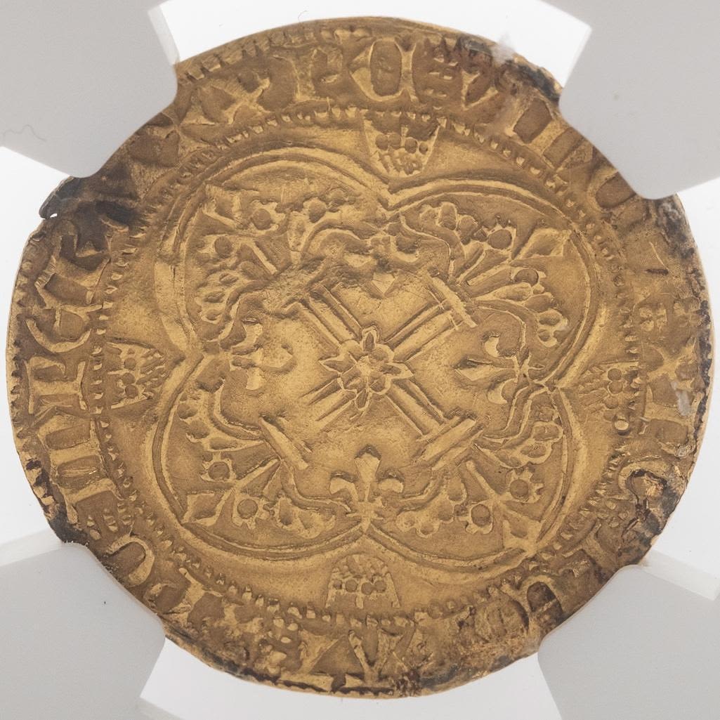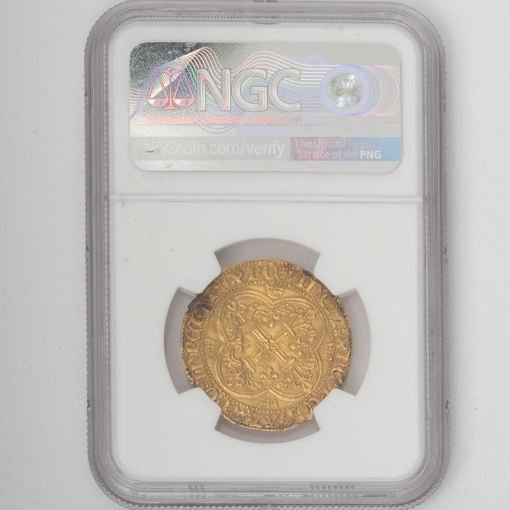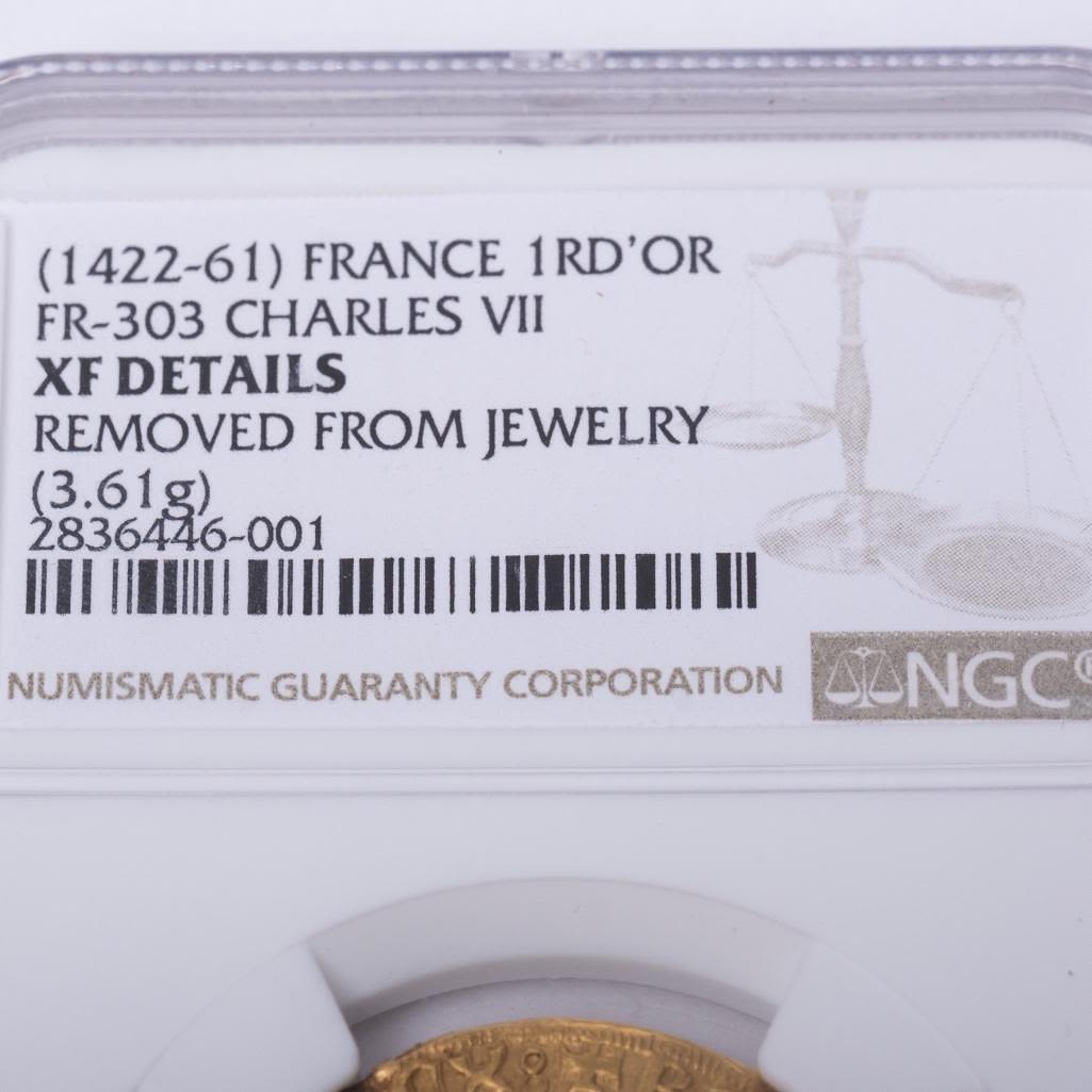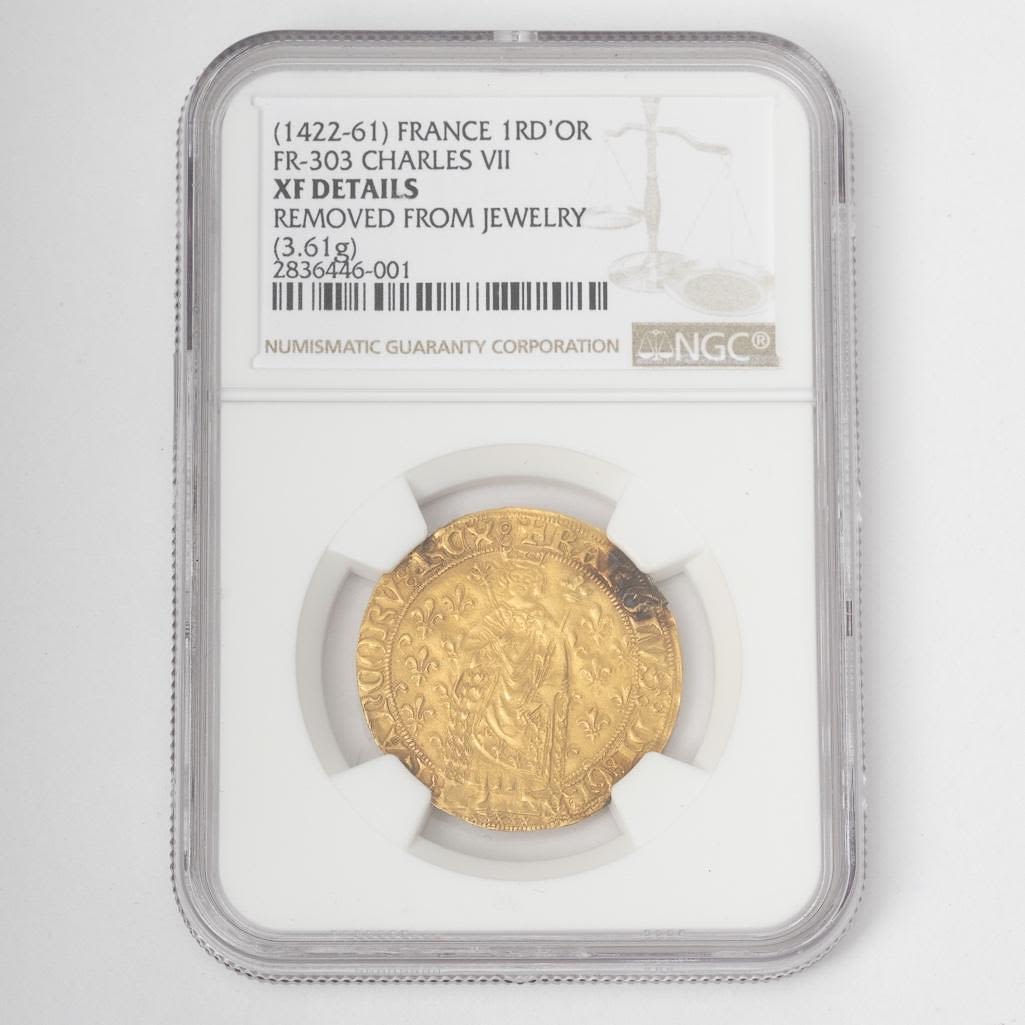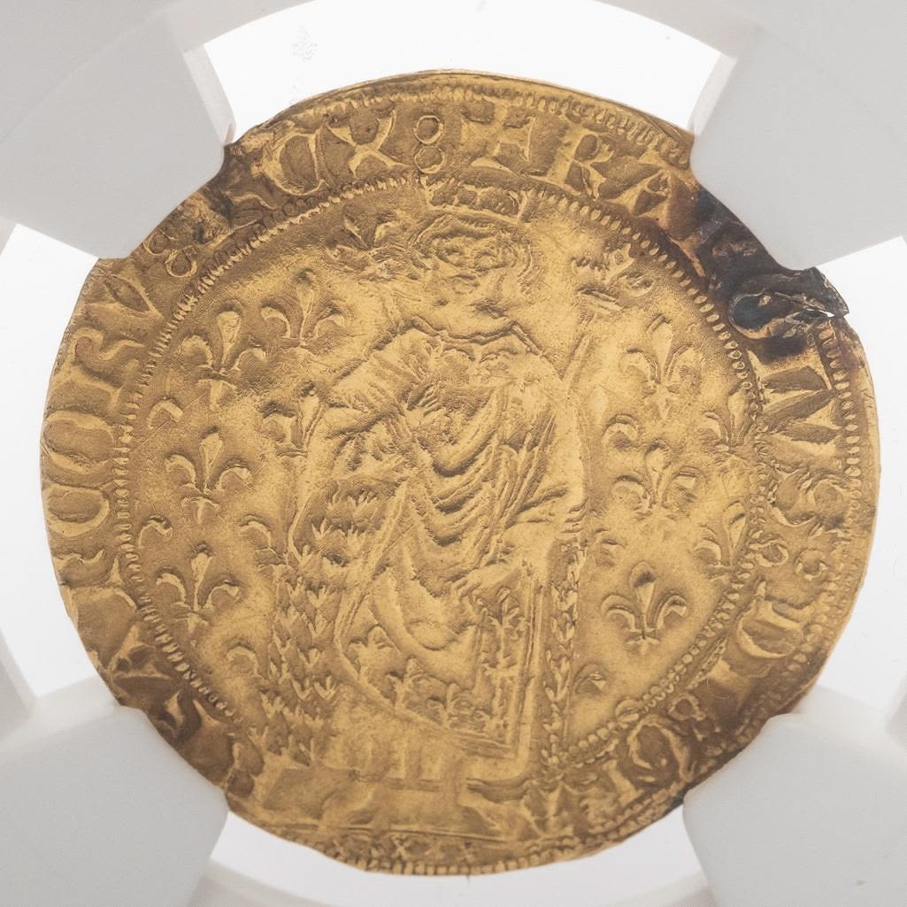 15th century French gold coin, Franc. This coin is graded and displays Charles VII on the coin. The coin is approx 1" in diameter. 3.61 grams