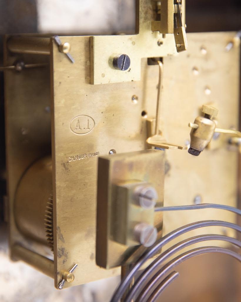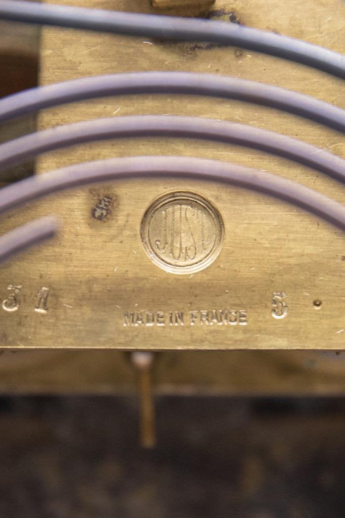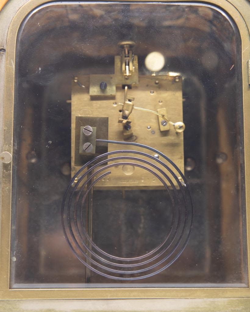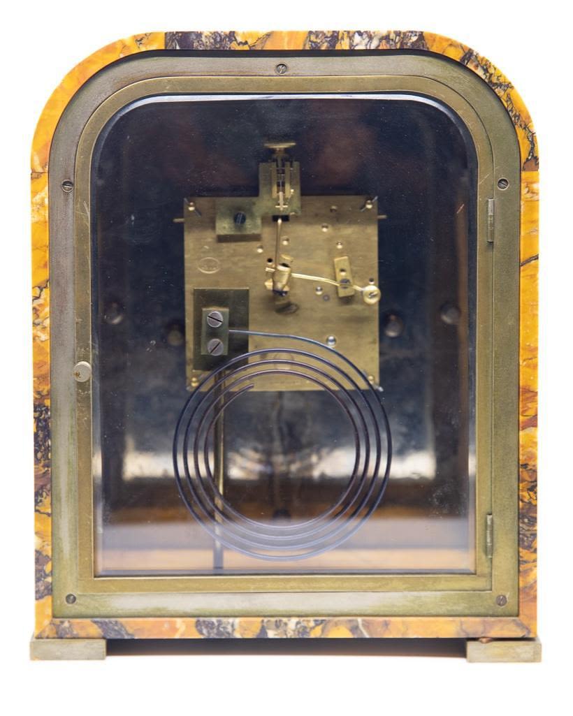 French Art Deco Italian marble and silvered bronze mantel clock with Roman numerals, marked on reverse: "A.1 / CH. Hour France / JUST / 1231 Made in France 5.2." 11" H x 9" W x 4.75" D. Wear to painted numerals.