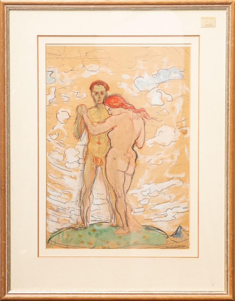 Albert Schmidt Early 20th Century Adam and Eve watercolor and gouache on paper signed lower right. 12" x 17" Visible. 20" x 25" Framed. The art has slipped out of the mat.