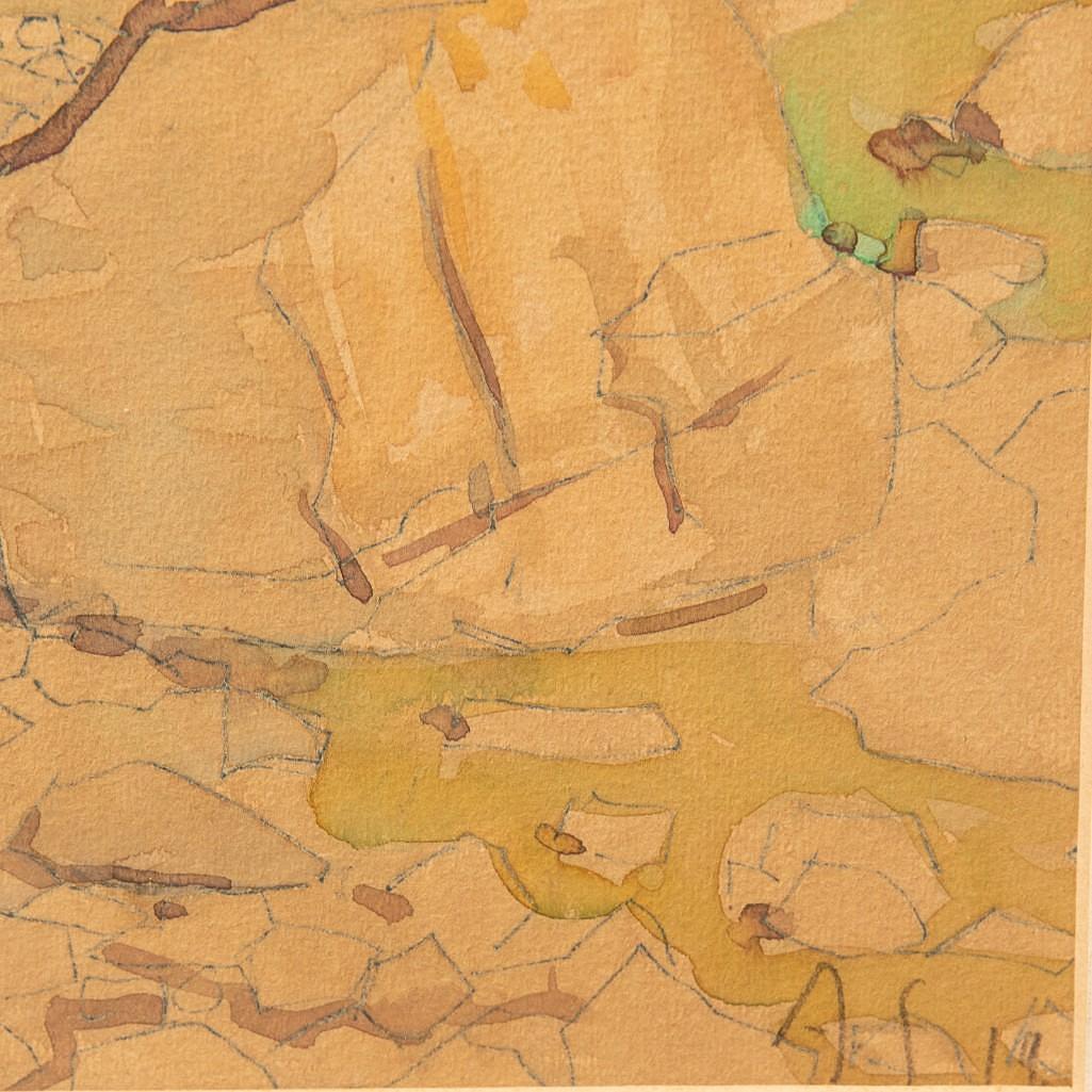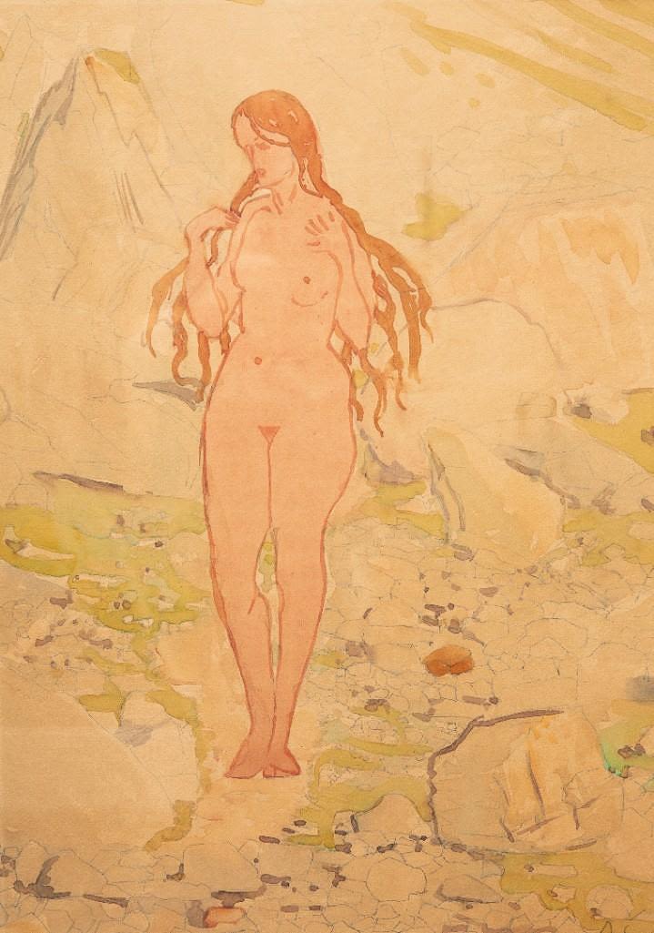 Albert Schmidt Early 20th Century Eve in the Garden watercolor and gouache on paper signed lower right. 12" x 17" Visible. 20" x 25" Framed. The art has slipped out of the mat.